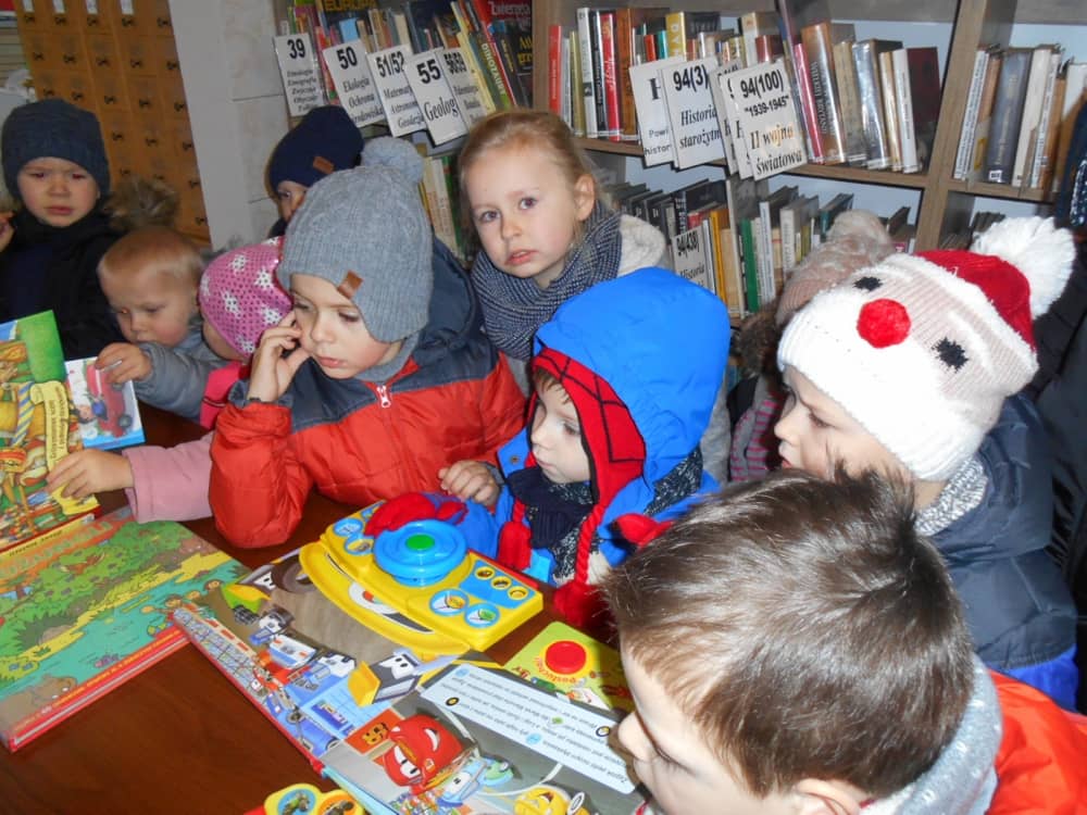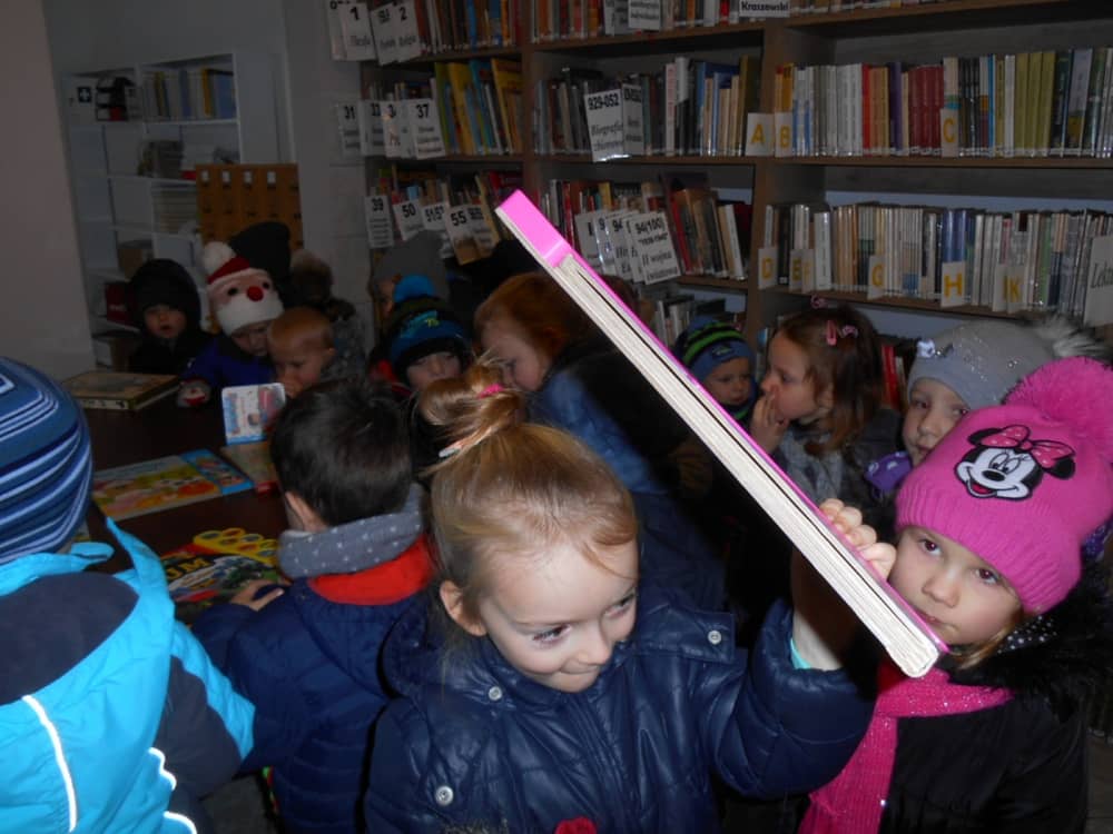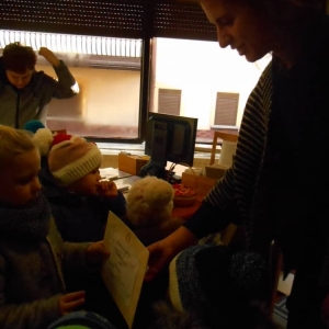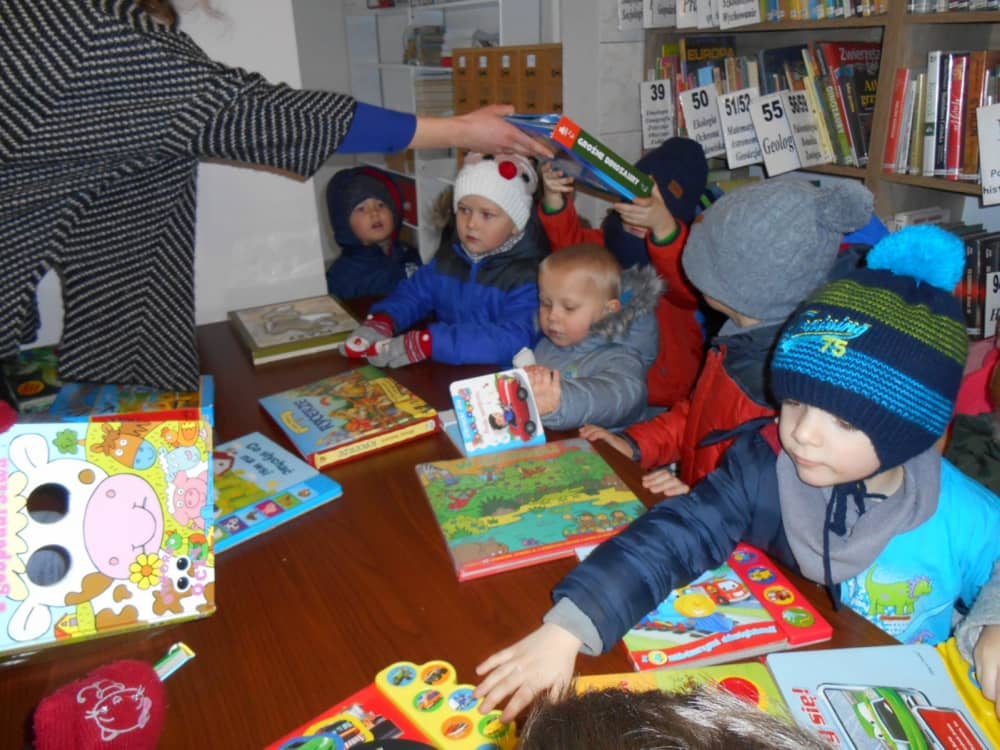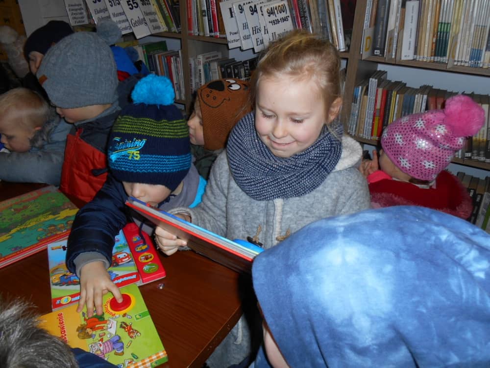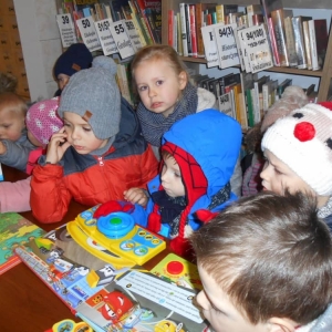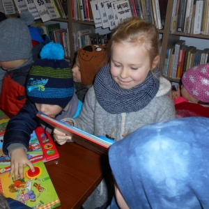 Podczas wizyty najmłodszych czytelników nie mogło również zabraknąć głośnego czytania. Dzieci z uwagą słuchały wiersza o Trzech Królach. Duże zainteresowanie wzbudziły książki dźwiękowe, książki zabawki.