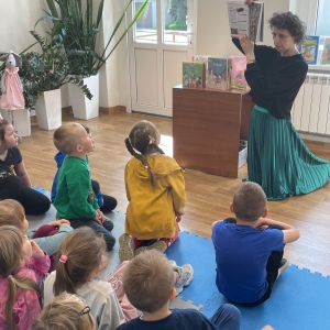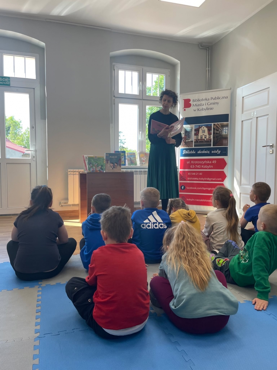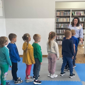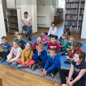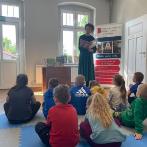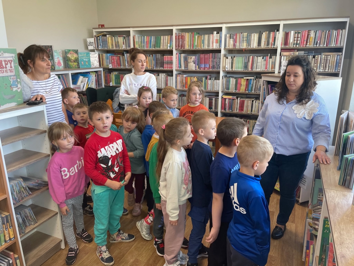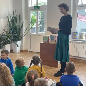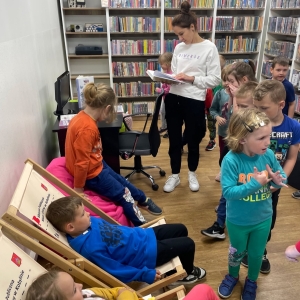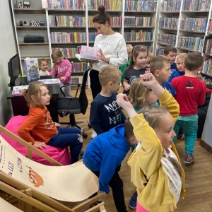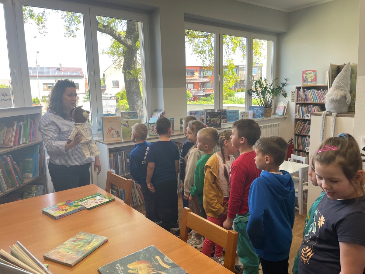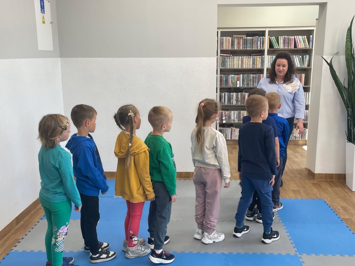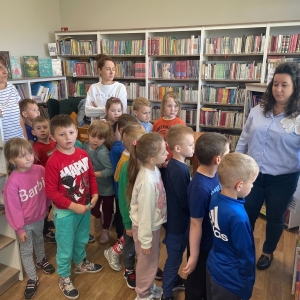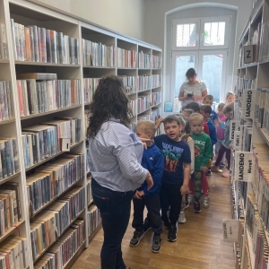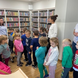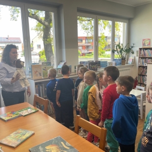 Była to pierwsza wizyta dzieci w naszej bibliotece. Rozmawialiśmy o książkach – o ich różnorodności pod względem formatu oraz tematu. Najmłodszym bardzo spodobały się książki rozkładane oraz dźwiękowe.