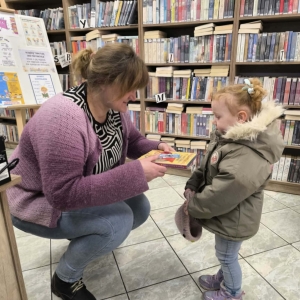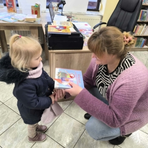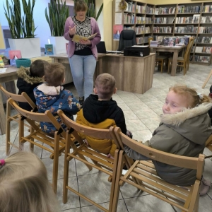 Galeria przedstawia zdjęcia z wizyty dzieci przedszkolnych w bibliotece. Na zdjęciach bibliotekarka czyta dzieciom książkę, Zdjęcia przedstawiaja również moment wręczania zestawu małego czytelnika dzieciom. Jest również jedno zdjęcie grupowe uczestników wydarzenia.