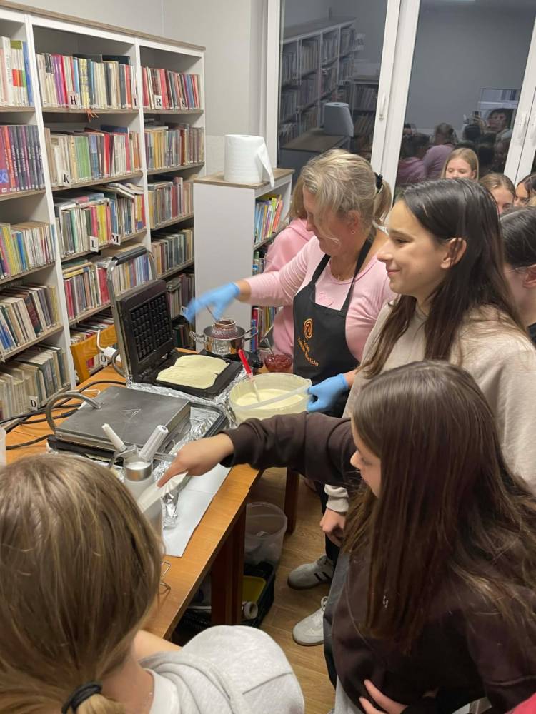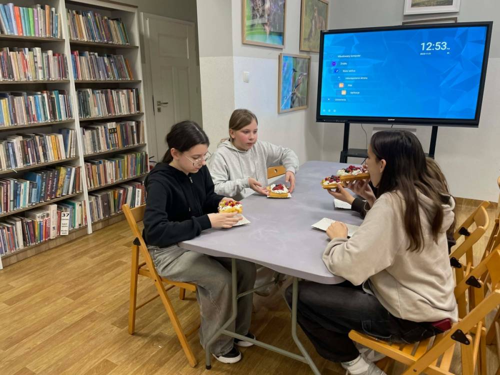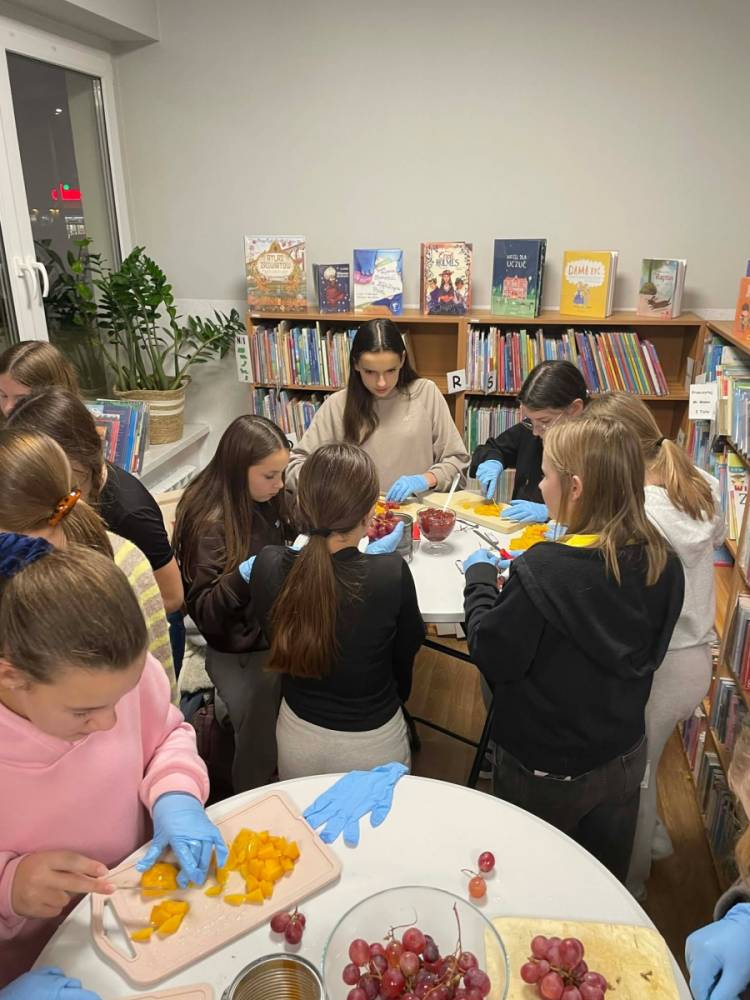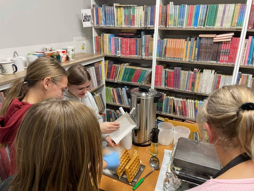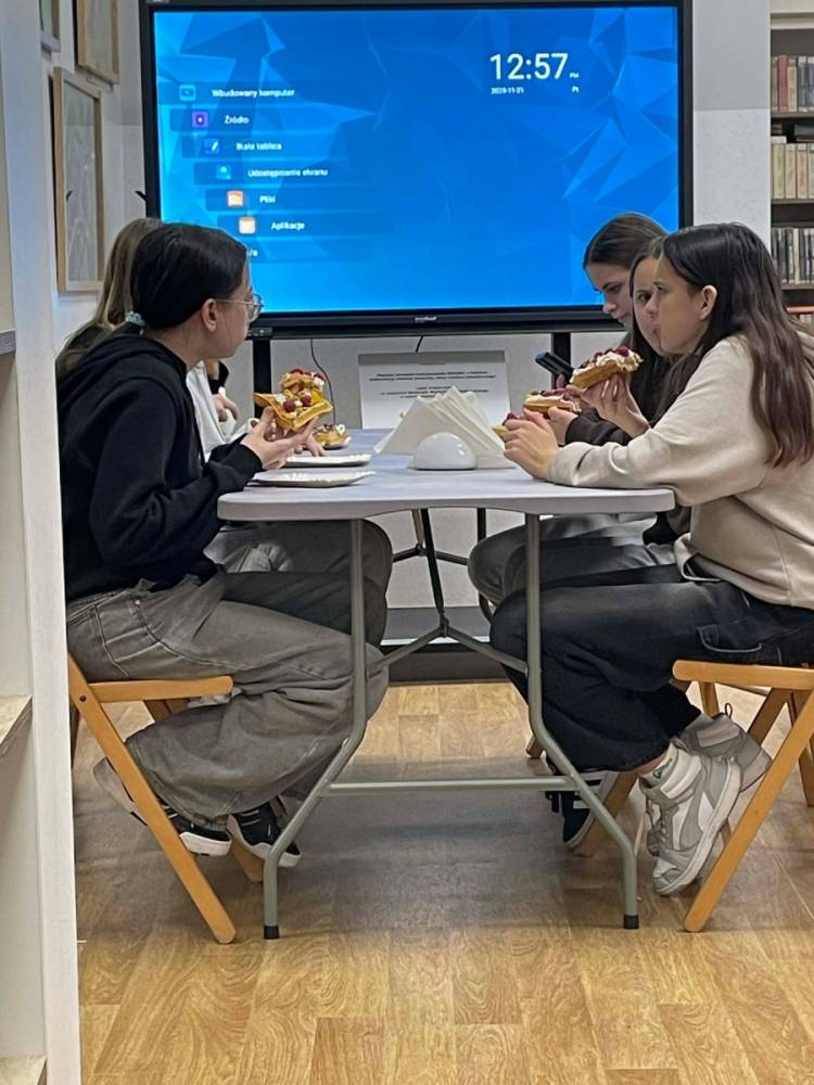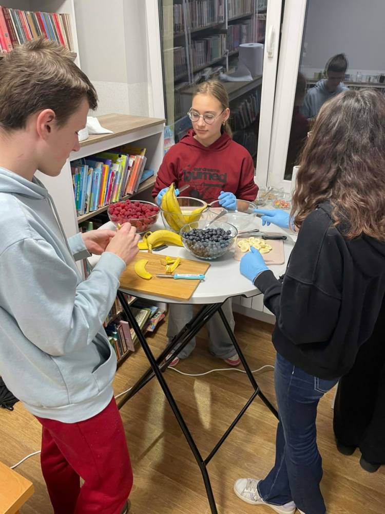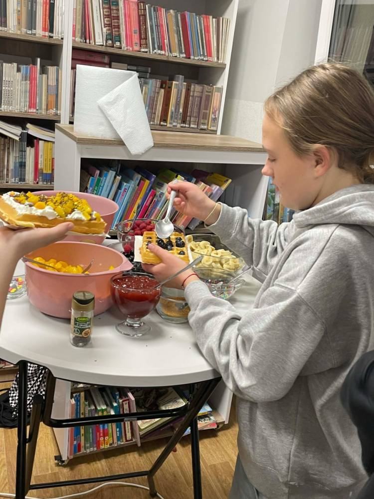 Galeria zdjęć przedstawia uczestników zajęć w wieku ponad 12 lat w różnych pomieszczeniach biblioteki, w zależności od wykonywanej czynności. W holu biblioteki dziewczyny i jeden chłopak siedzą w kole na krzesłach obróceni do prowadzącej warsztat o zdrowiu psychicznym oraz relacjach. Następnie w pomieszczeniu, które jest czytelnią dla dzieci zostały rozstawione stoły. Znajdowała się tam gofrownica, owoce, bita śmietana, kolorowe posypki spożywcze itp. Prowadząca część gastronomiczną wypiekała gofry w gofrownicy, a uczestnicy kroili owoce, a następnie dekorowali gofry owocami, bitą śmietaną itp. W holu biblioteki młodzież siedząc na krzesłach przy stołach jadła sporządzone gofry. Następnie przy tych samych stołach w holu biblioteki uczestnicy otrzymali bawełniane torby w kolorze kremowym. Różnokolorowymi farbami malowali na torbach.
