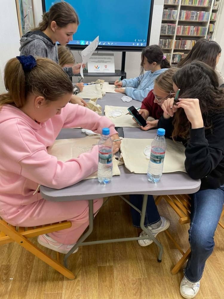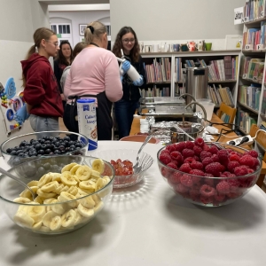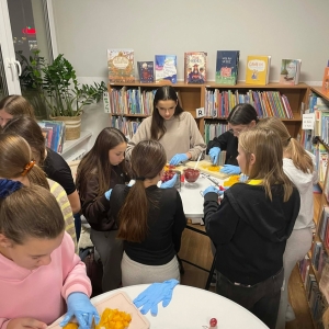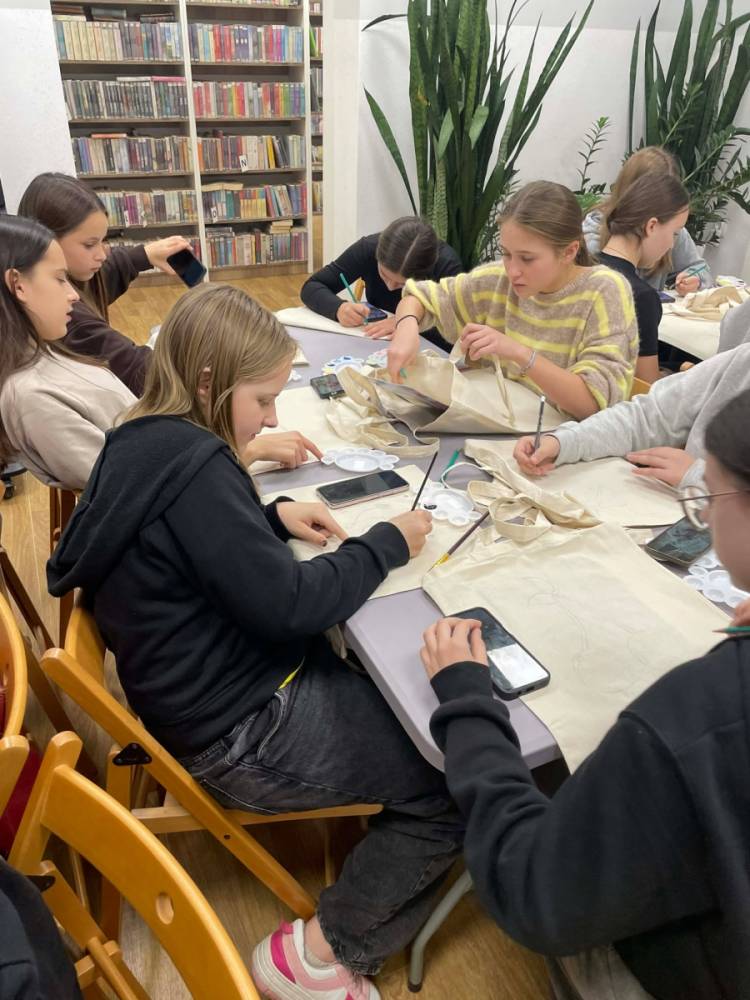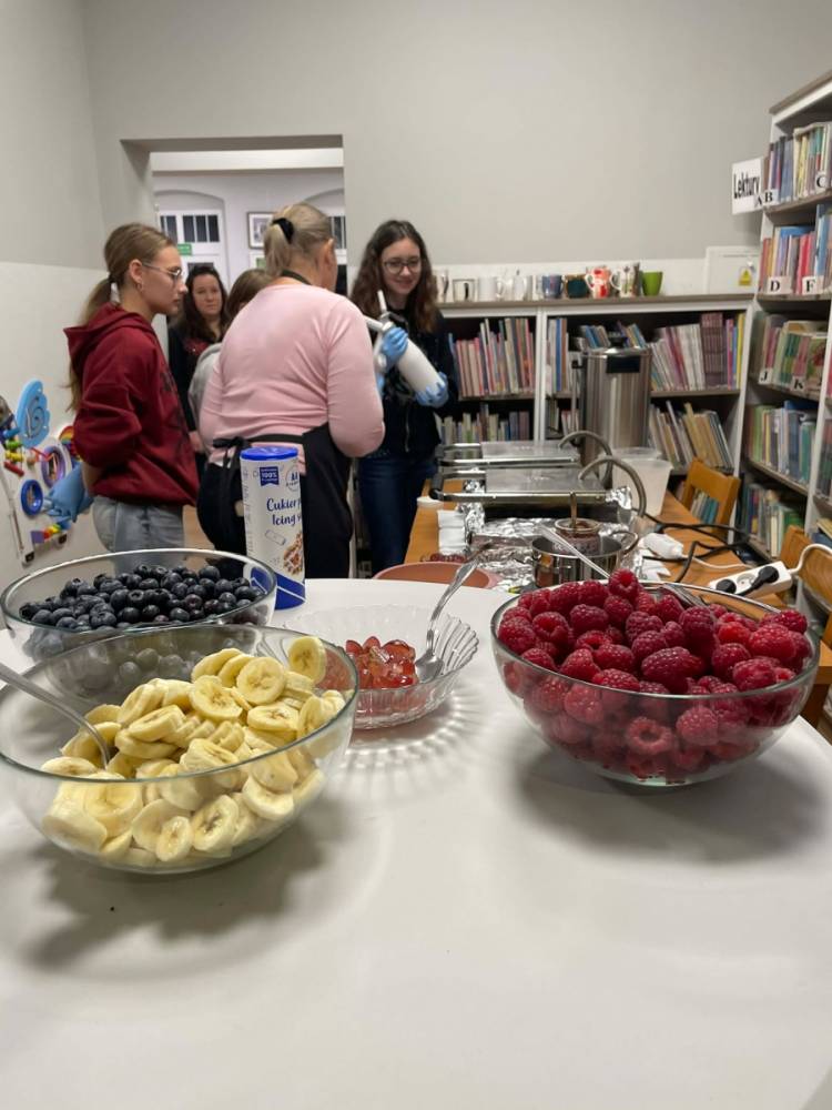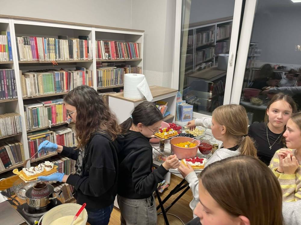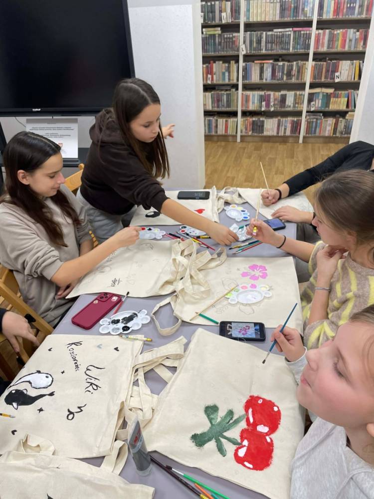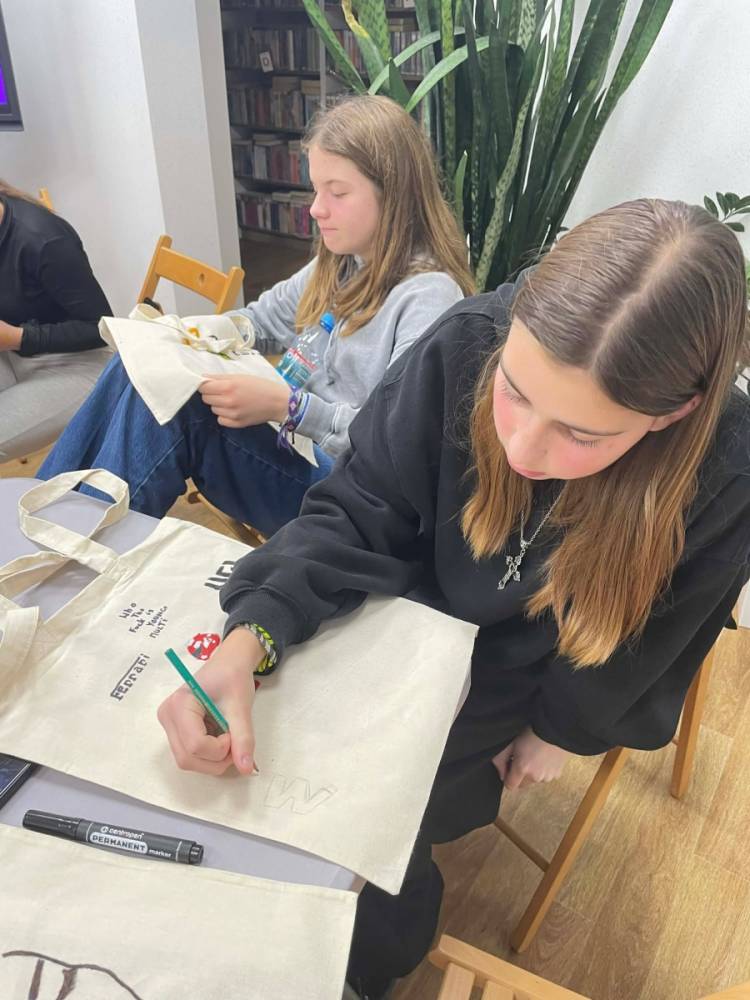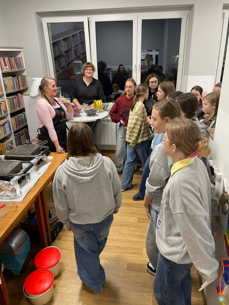 Galeria zdjęć przedstawia uczestników zajęć w wieku ponad 12 lat w różnych pomieszczeniach biblioteki, w zależności od wykonywanej czynności. W holu biblioteki dziewczyny i jeden chłopak siedzą w kole na krzesłach obróceni do prowadzącej warsztat o zdrowiu psychicznym oraz relacjach. Następnie w pomieszczeniu, które jest czytelnią dla dzieci zostały rozstawione stoły. Znajdowała się tam gofrownica, owoce, bita śmietana, kolorowe posypki spożywcze itp. Prowadząca część gastronomiczną wypiekała gofry w gofrownicy, a uczestnicy kroili owoce, a następnie dekorowali gofry owocami, bitą śmietaną itp. W holu biblioteki młodzież siedząc na krzesłach przy stołach jadła sporządzone gofry. Następnie przy tych samych stołach w holu biblioteki uczestnicy otrzymali bawełniane torby w kolorze kremowym. Różnokolorowymi farbami malowali na torbach.