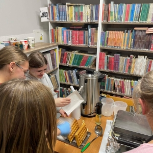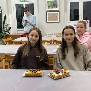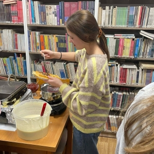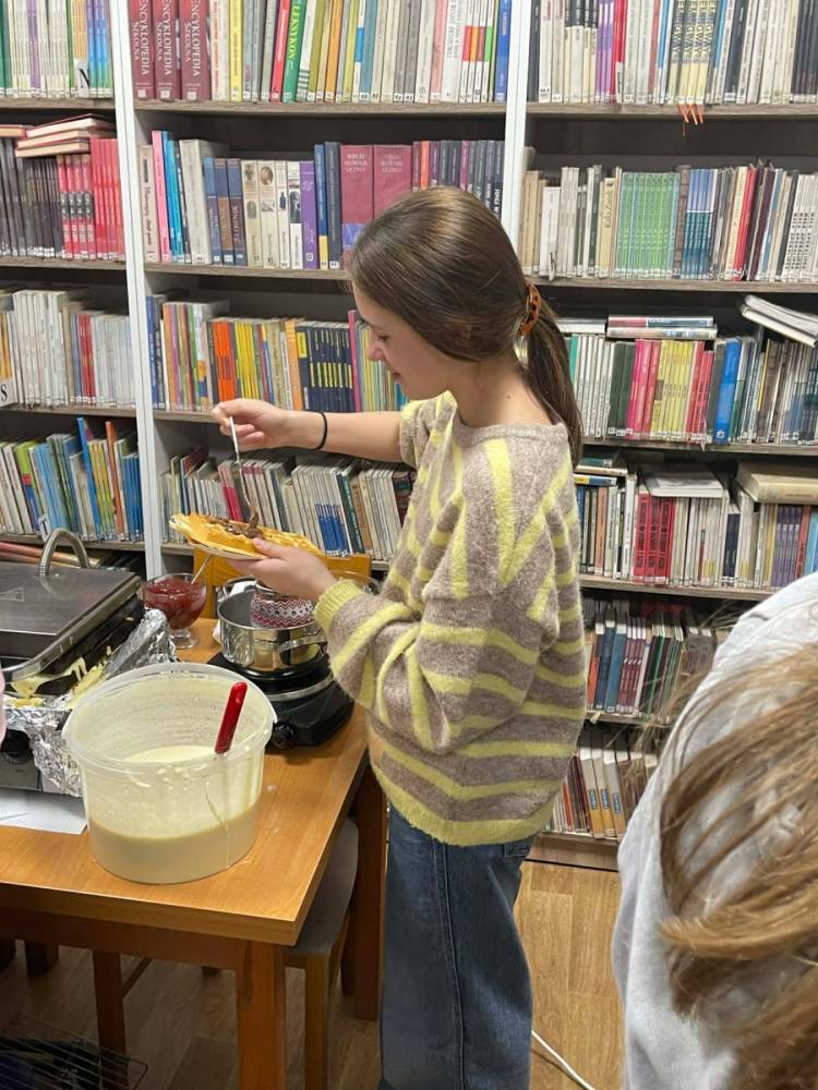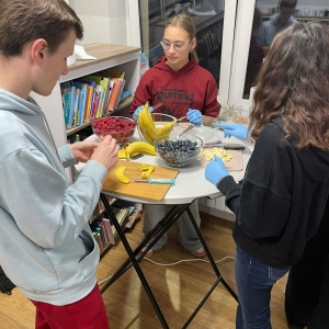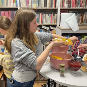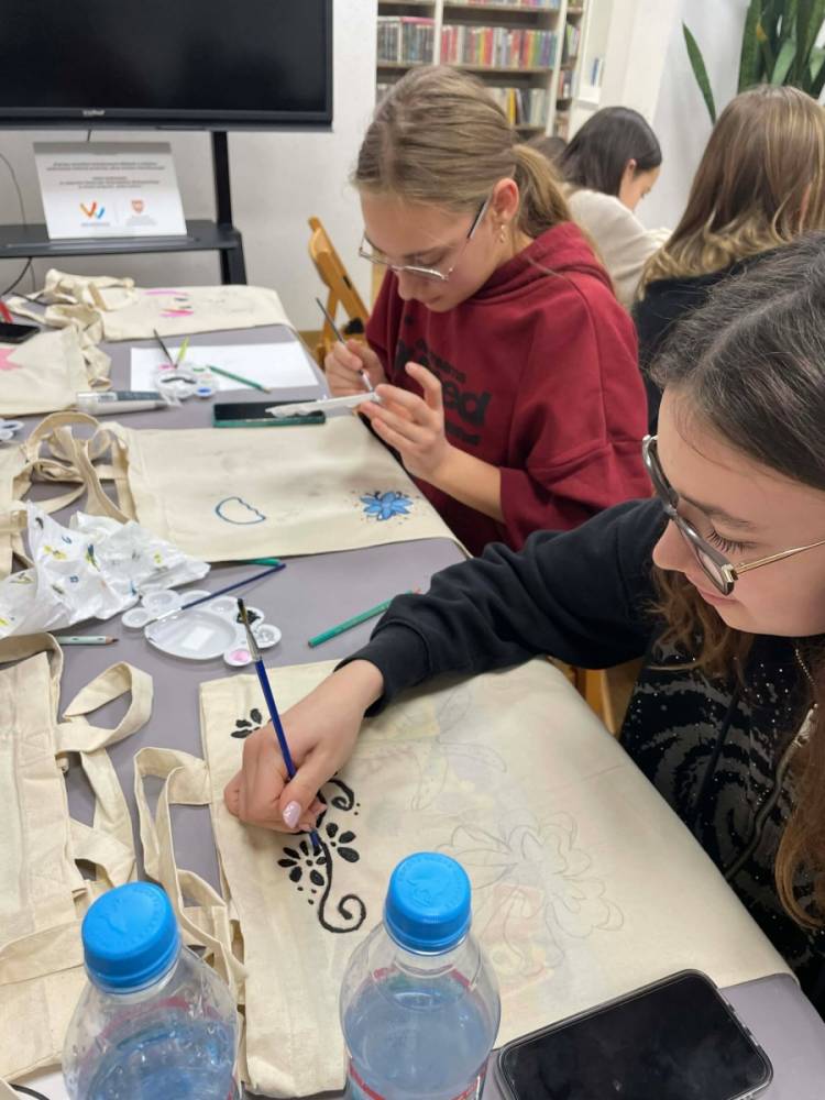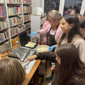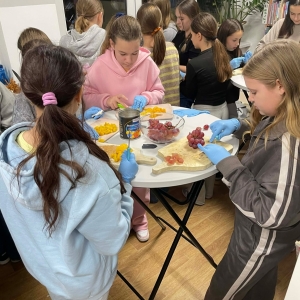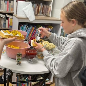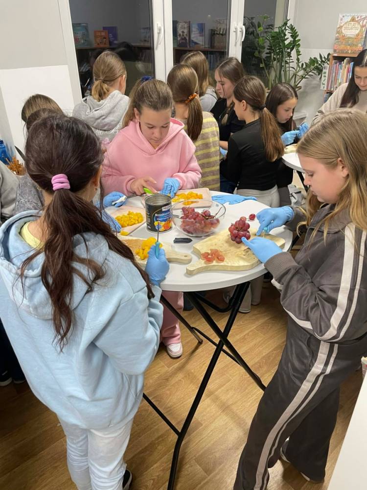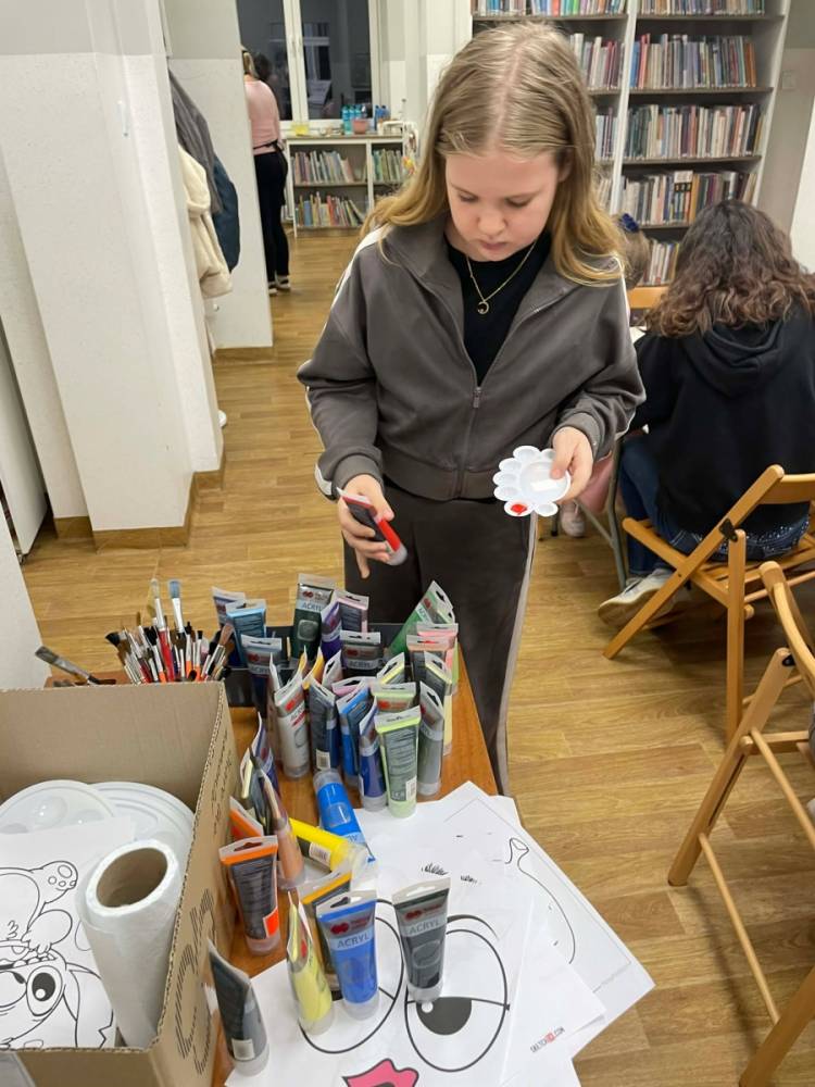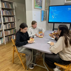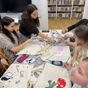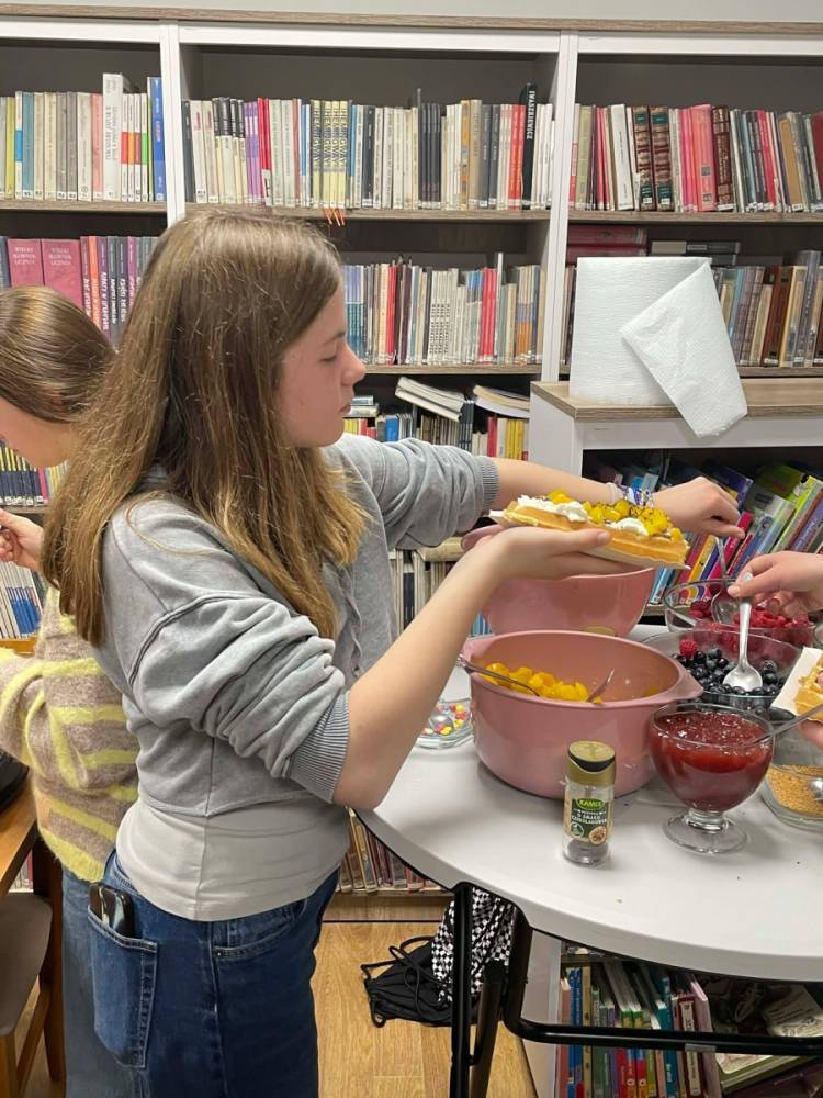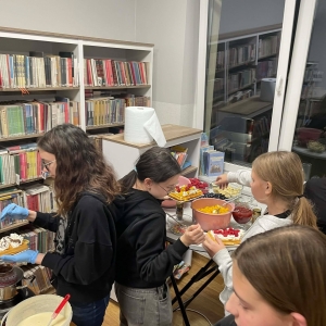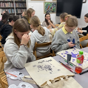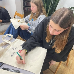 Galeria zdjęć przedstawia uczestników zajęć w wieku ponad 12 lat w różnych pomieszczeniach biblioteki, w zależności od wykonywanej czynności. W holu biblioteki dziewczyny i jeden chłopak siedzą w kole na krzesłach obróceni do prowadzącej warsztat o zdrowiu psychicznym oraz relacjach. Następnie w pomieszczeniu, które jest czytelnią dla dzieci zostały rozstawione stoły. Znajdowała się tam gofrownica, owoce, bita śmietana, kolorowe posypki spożywcze itp. Prowadząca część gastronomiczną wypiekała gofry w gofrownicy, a uczestnicy kroili owoce, a następnie dekorowali gofry owocami, bitą śmietaną itp. W holu biblioteki młodzież siedząc na krzesłach przy stołach jadła sporządzone gofry. Następnie przy tych samych stołach w holu biblioteki uczestnicy otrzymali bawełniane torby w kolorze kremowym. Różnokolorowymi farbami malowali na torbach.