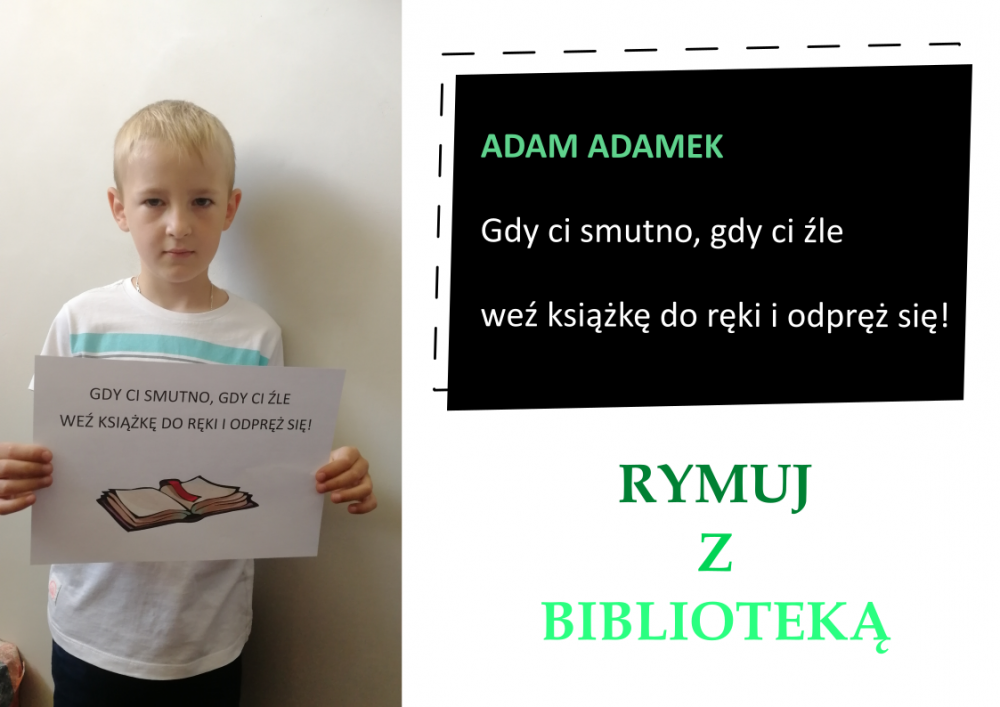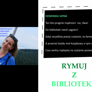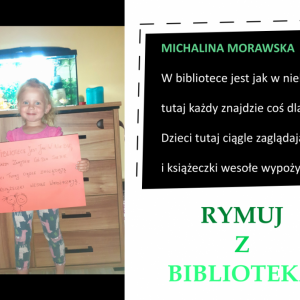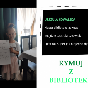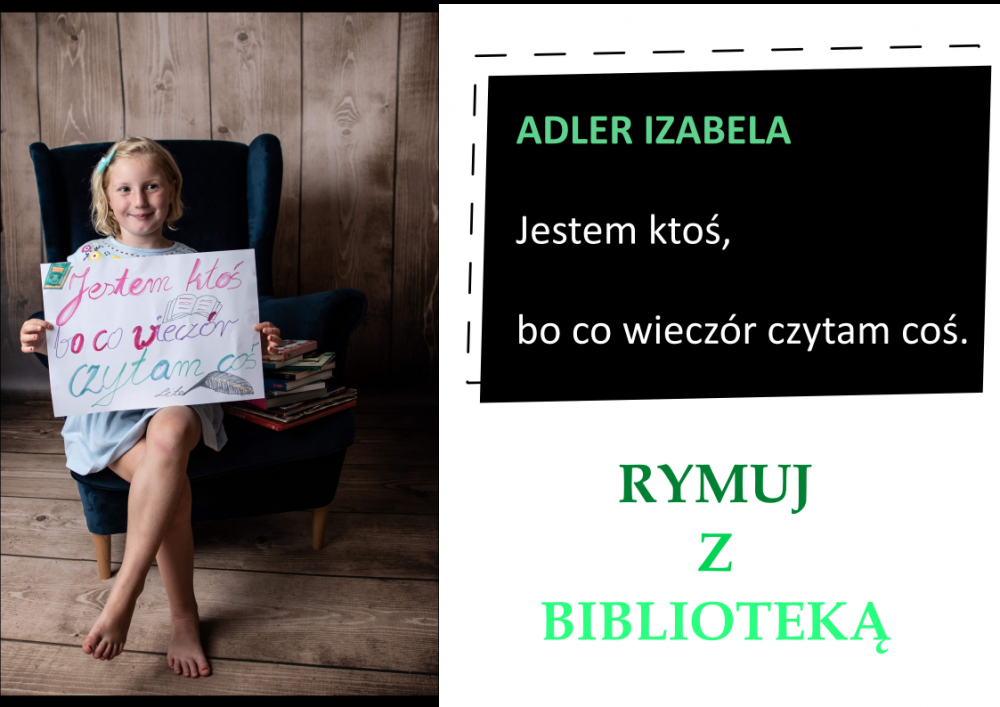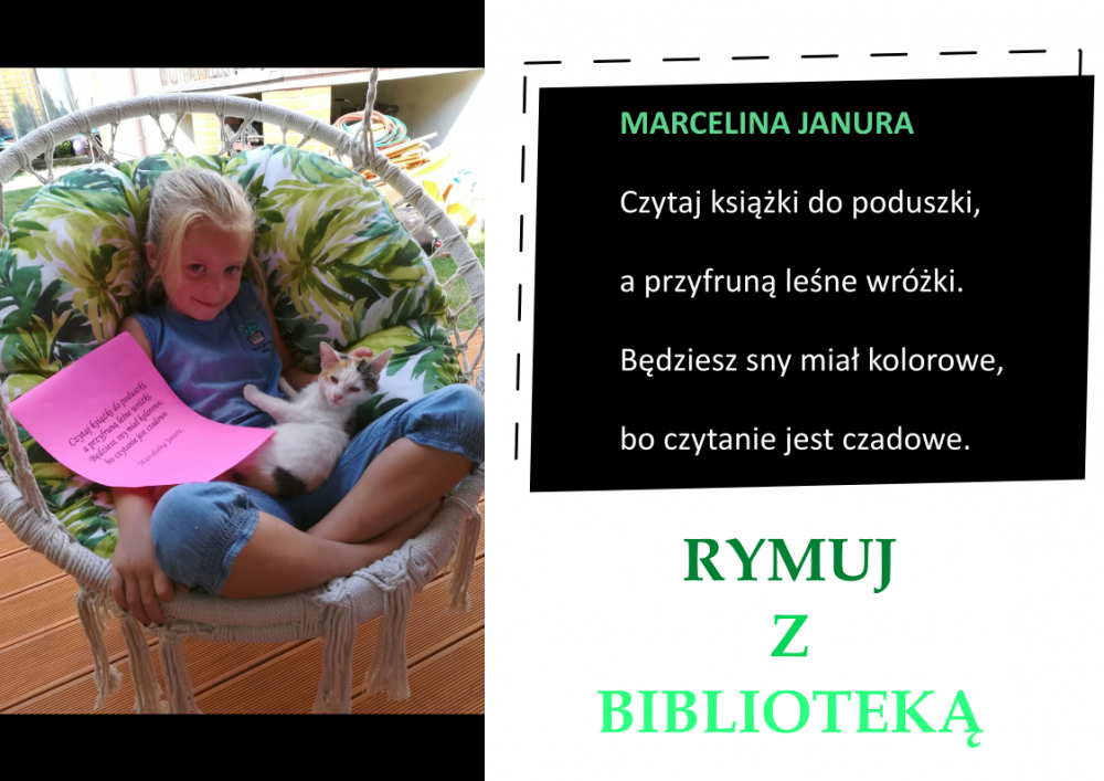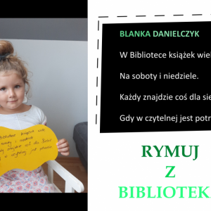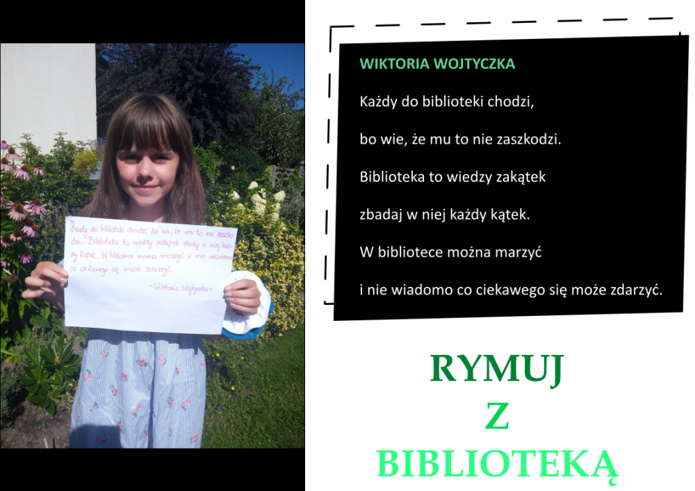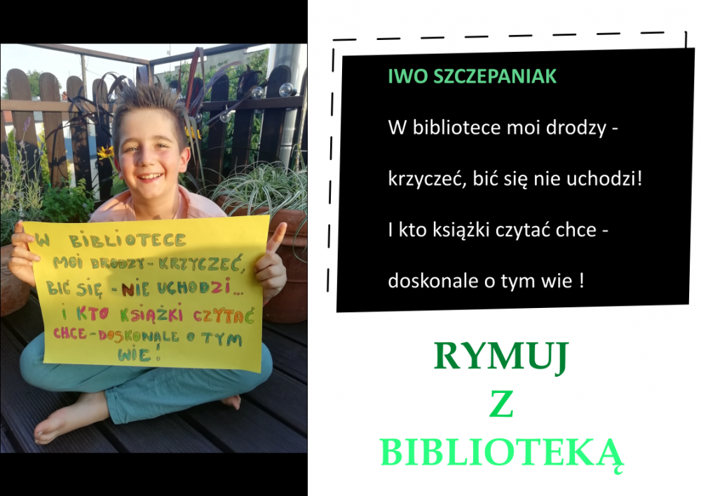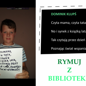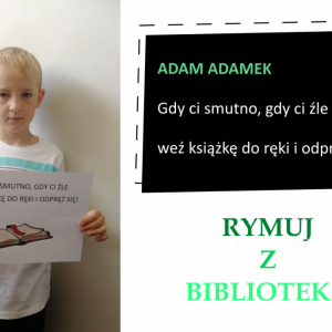 Drodzy Czytelnicy! Otrzymaliśmy aż 27 zgłoszeń do konkursu „Rymuj z biblioteką”! Niestety 4 z nich są spoza naszej gminy, zatem zgodnie z regulaminem nie zostały zakwalifikowane do konkursu. Tak więc łącznie prezentujemy 23 zgłoszenia. Wszystkie są absolutnie wspaniałe, wpadające w ucho i przede wszystkim: jedyne w swoim rodzaju!