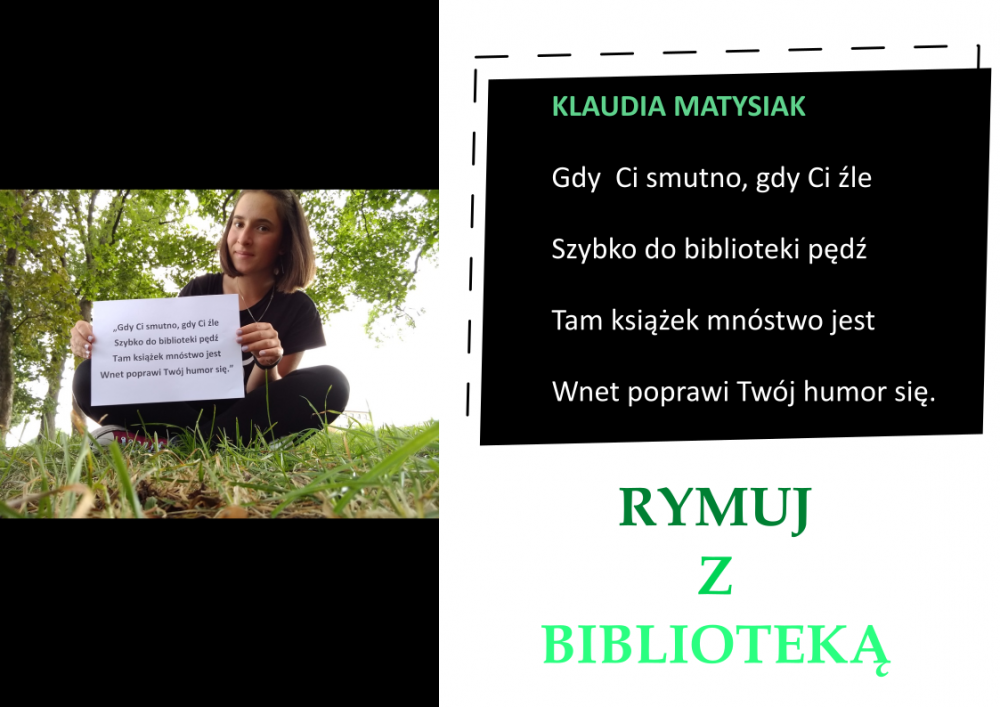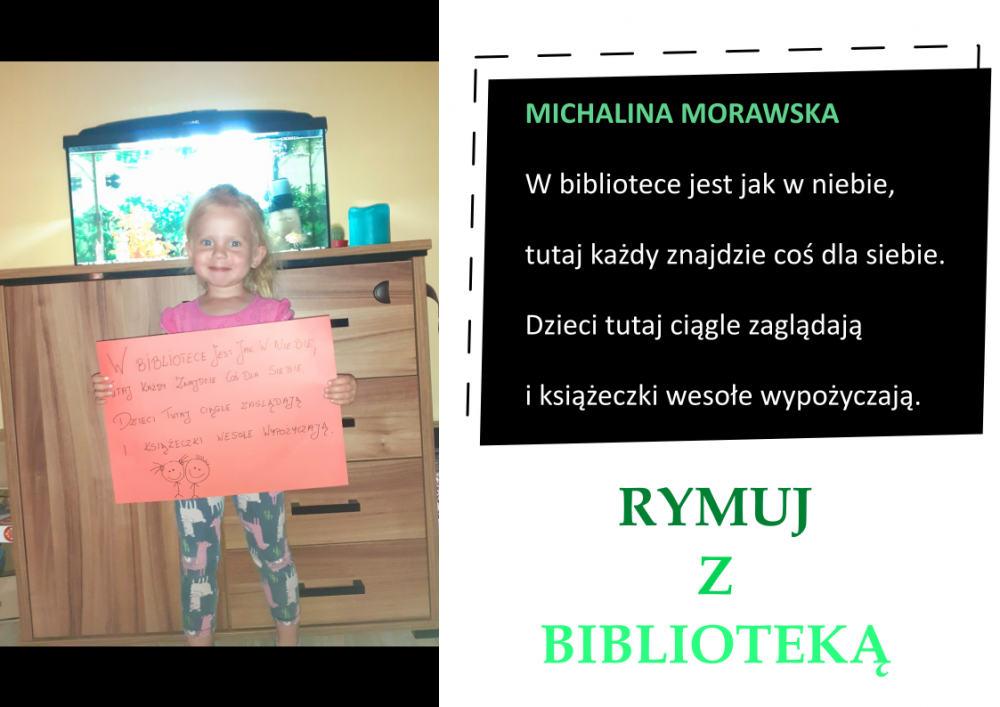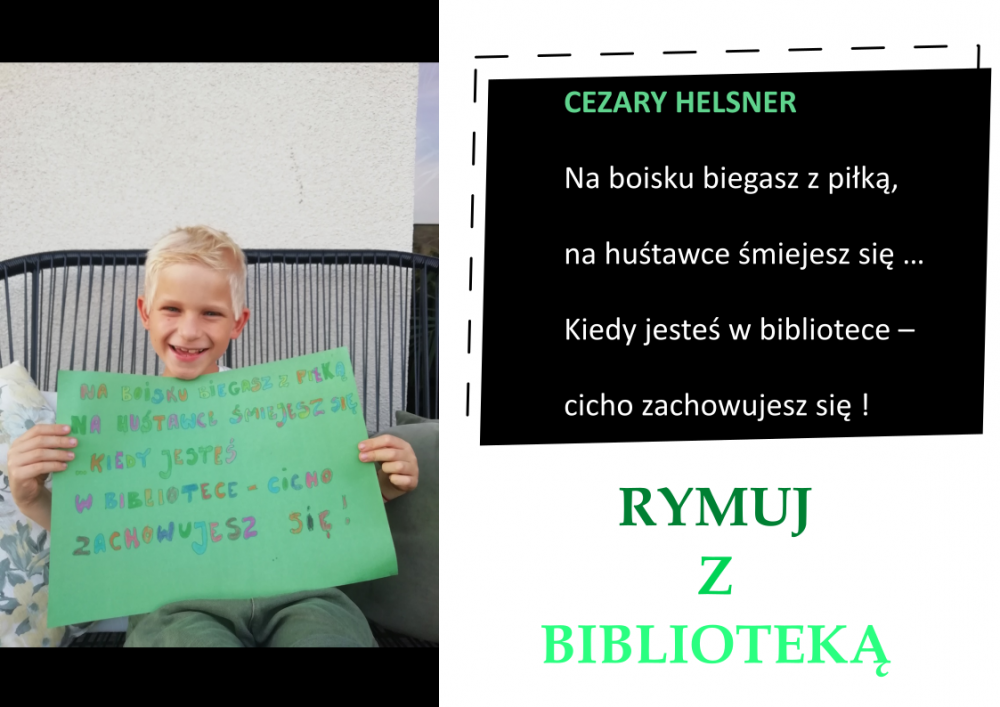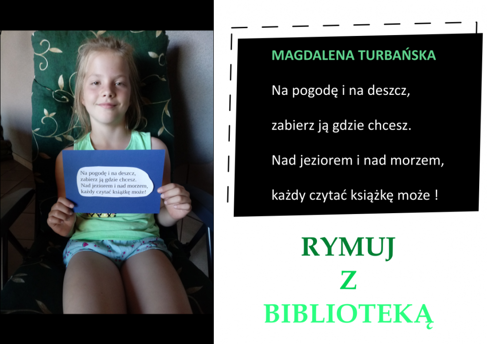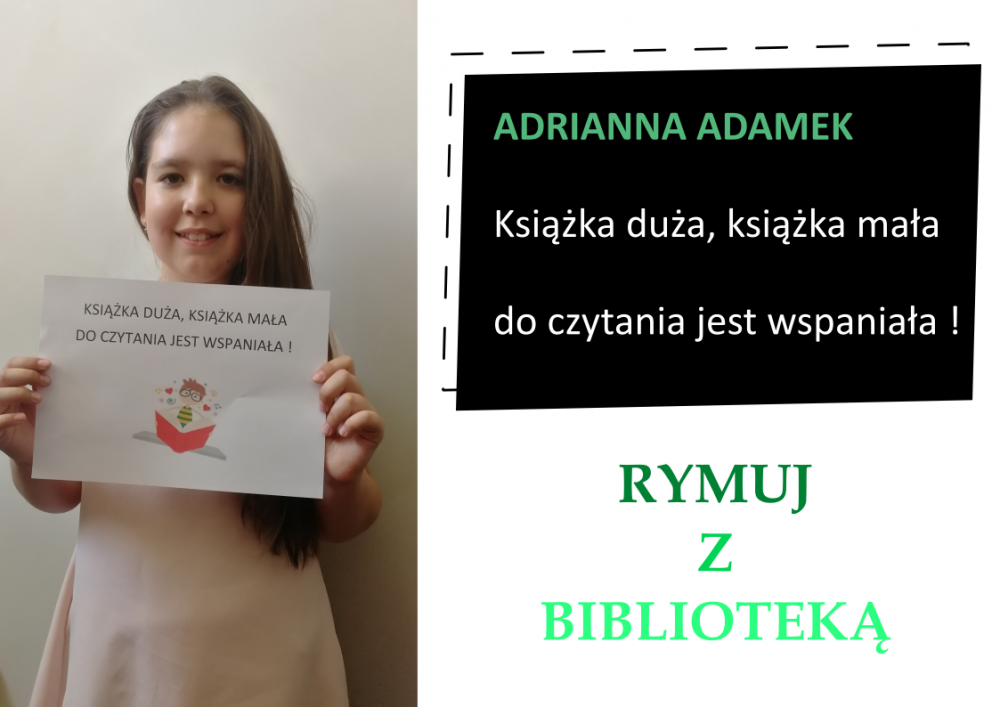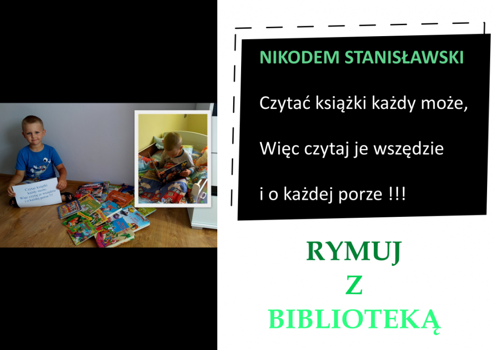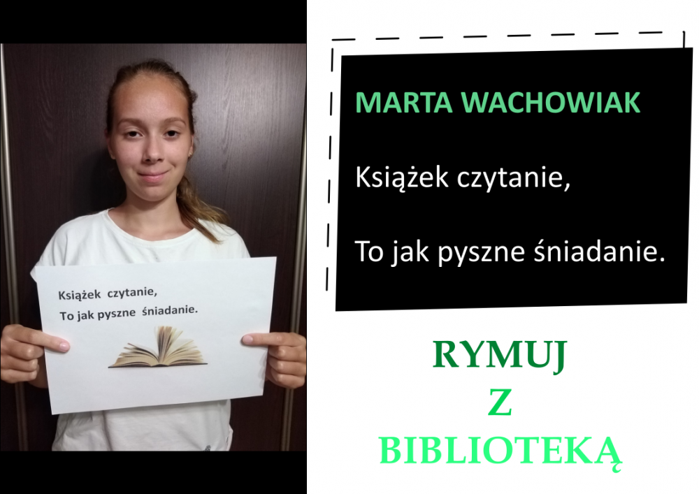 Drodzy Czytelnicy! Otrzymaliśmy aż 27 zgłoszeń do konkursu „Rymuj z biblioteką”! Niestety 4 z nich są spoza naszej gminy, zatem zgodnie z regulaminem nie zostały zakwalifikowane do konkursu. Tak więc łącznie prezentujemy 23 zgłoszenia. Wszystkie są absolutnie wspaniałe, wpadające w ucho i przede wszystkim: jedyne w swoim rodzaju!