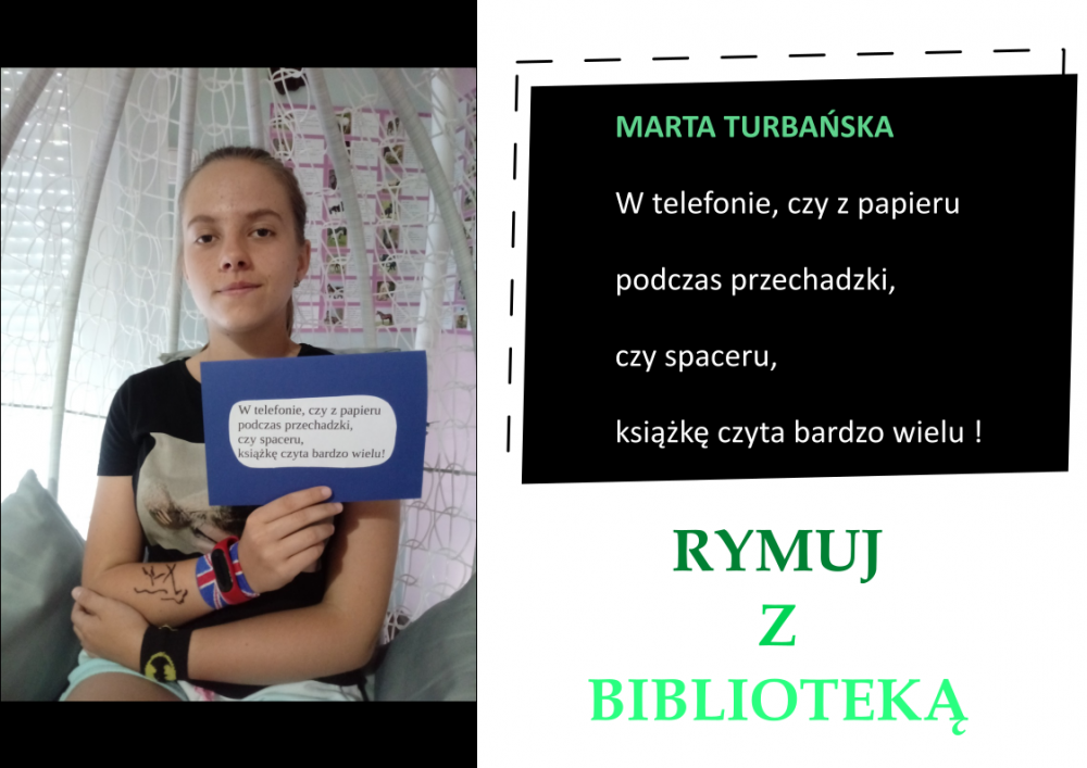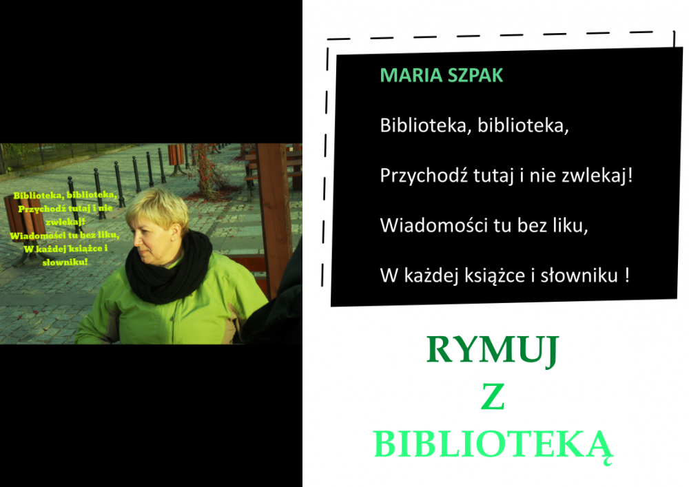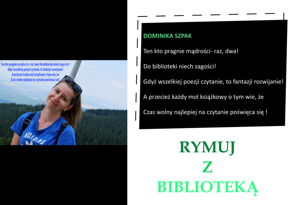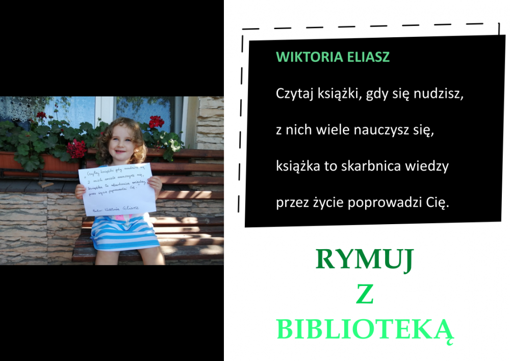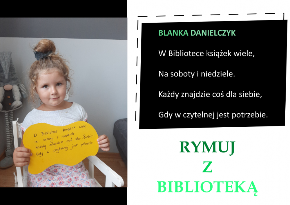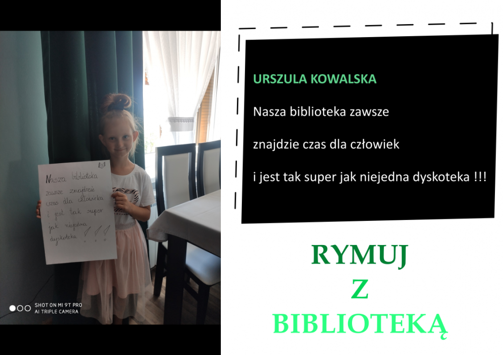 Drodzy Czytelnicy! Otrzymaliśmy aż 27 zgłoszeń do konkursu „Rymuj z biblioteką”! Niestety 4 z nich są spoza naszej gminy, zatem zgodnie z regulaminem nie zostały zakwalifikowane do konkursu. Tak więc łącznie prezentujemy 23 zgłoszenia. Wszystkie są absolutnie wspaniałe, wpadające w ucho i przede wszystkim: jedyne w swoim rodzaju!