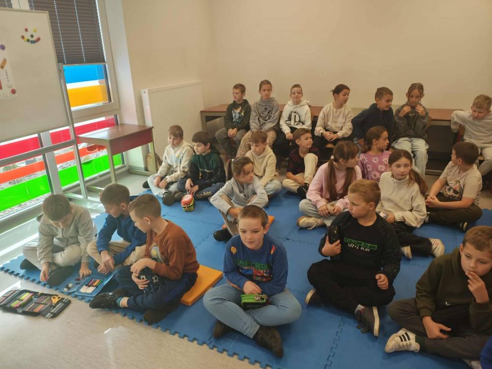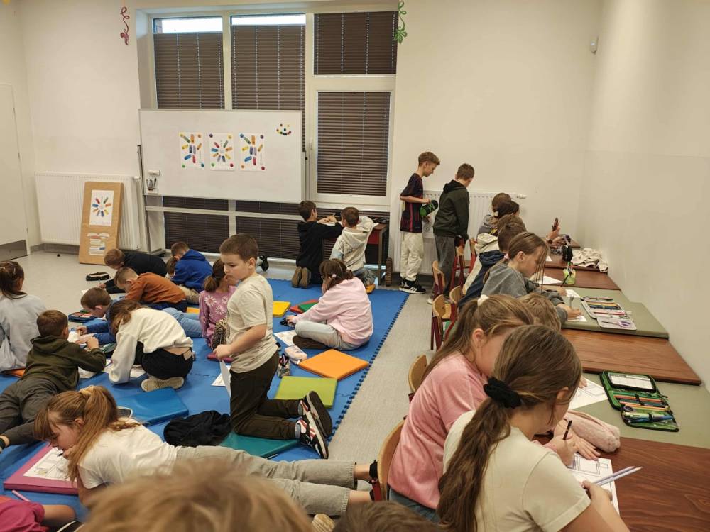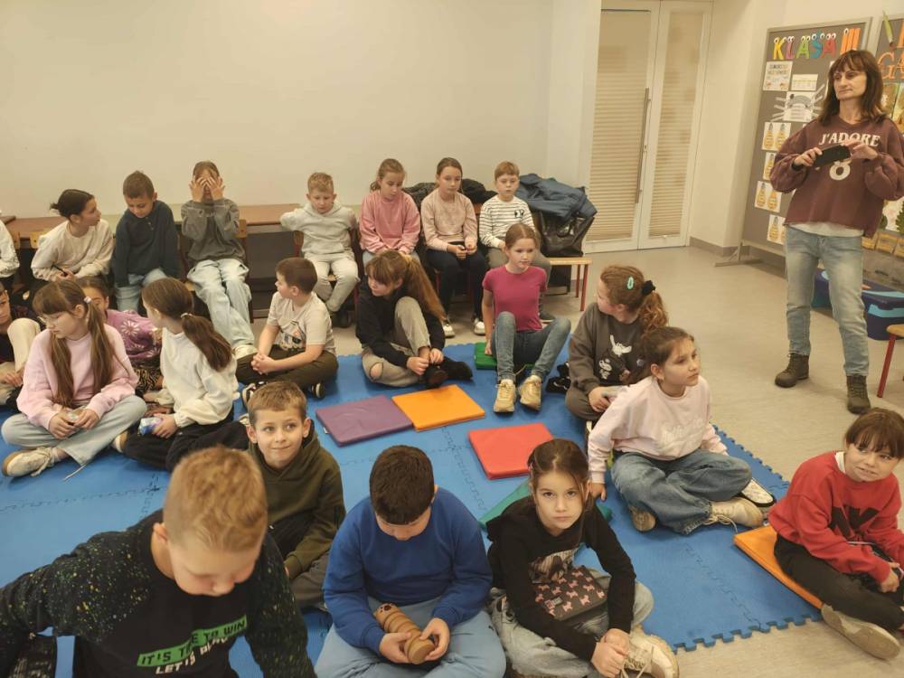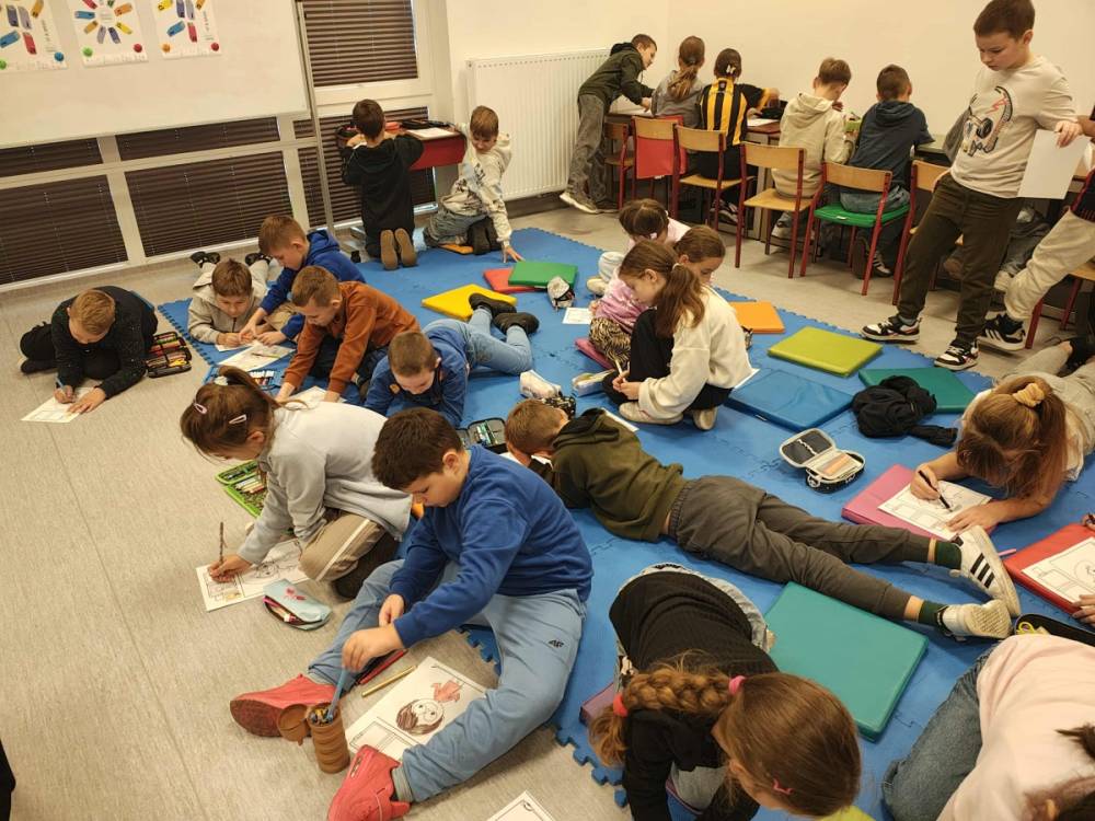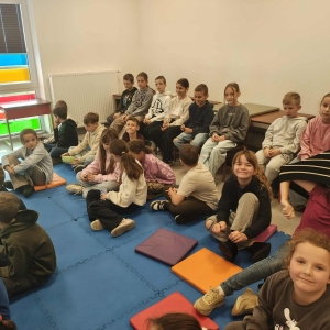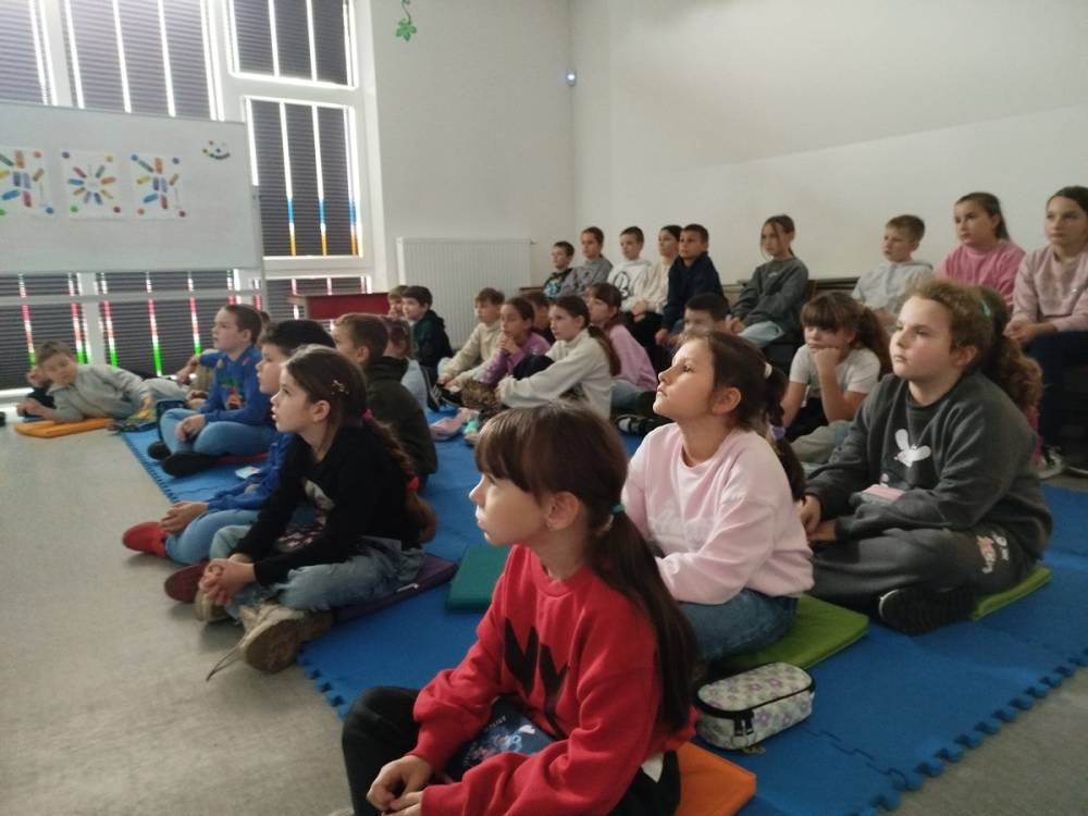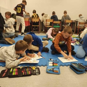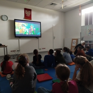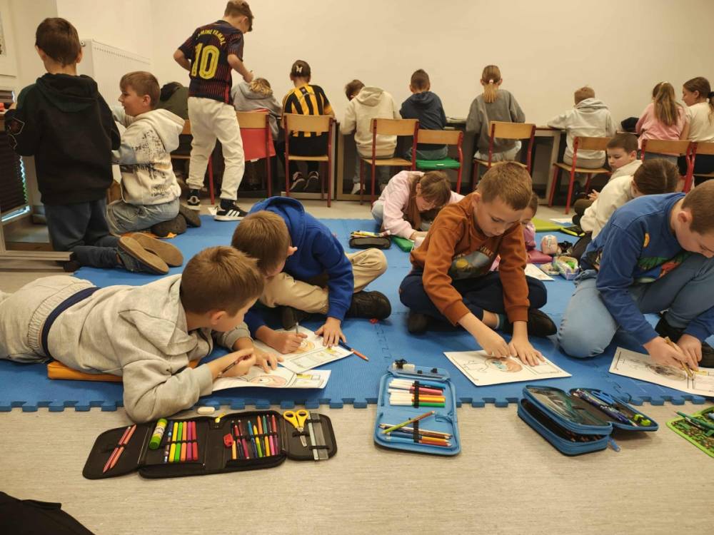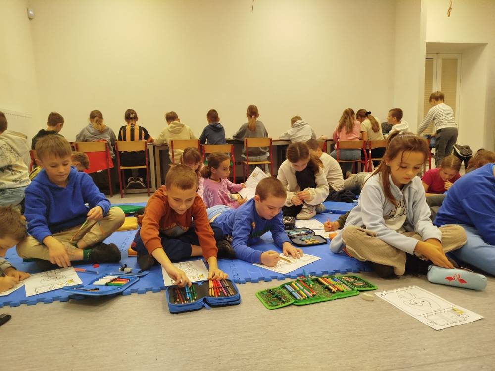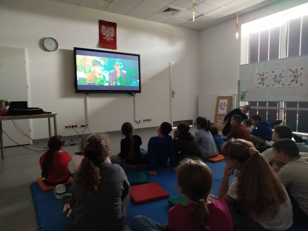 Galeria przedstawia zdjęcia z seansu filmowego w ramach akcji Noc Bibliotek. Na zdjęciach uczniowie ze Szkoły Podstawowej w Smolicach oglądają film. Wykonują również pracę plastyczną.