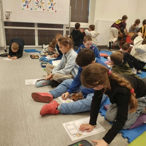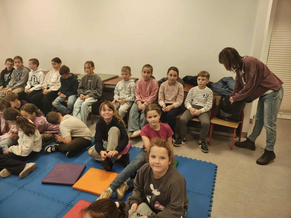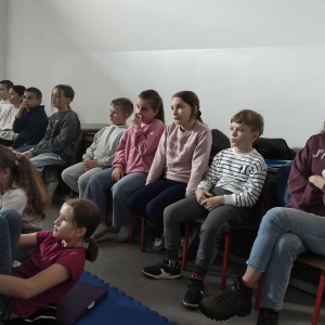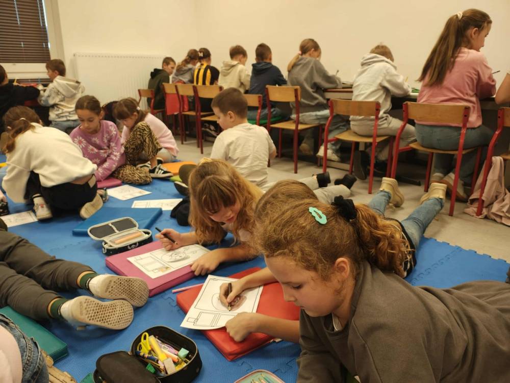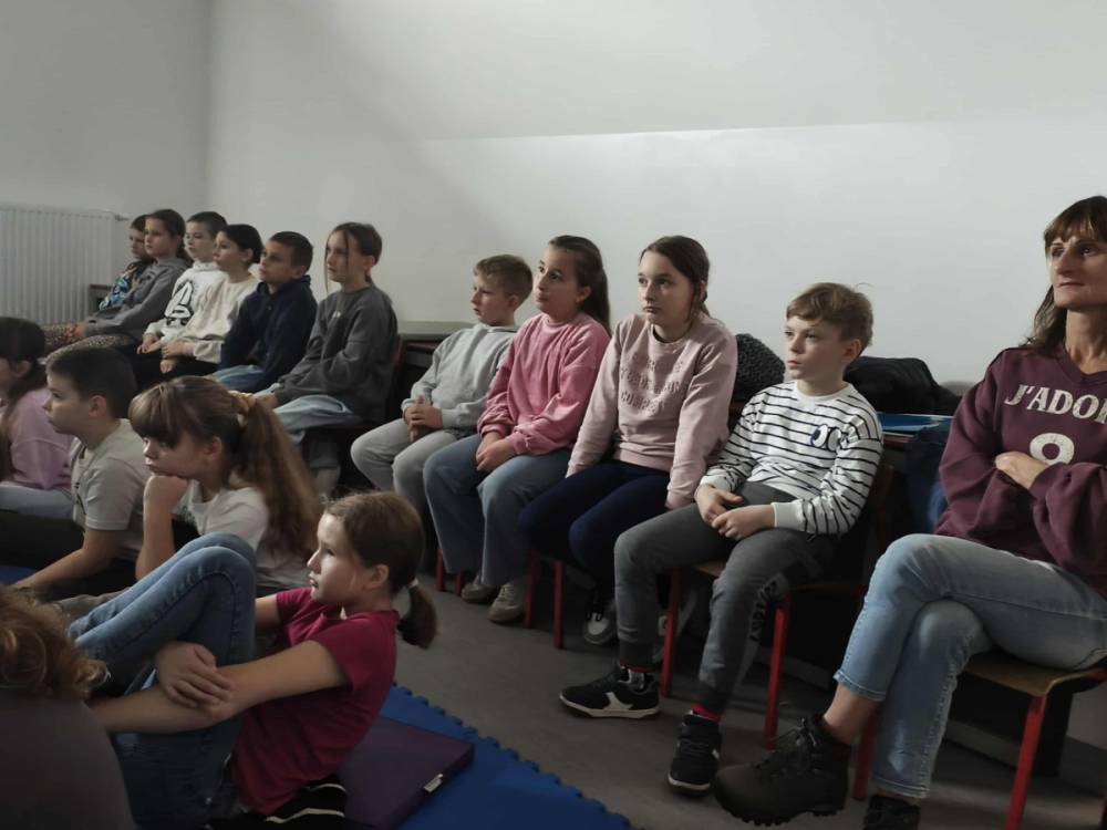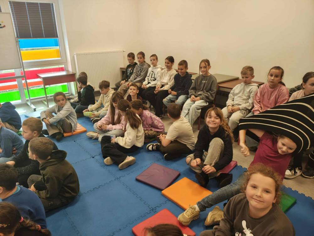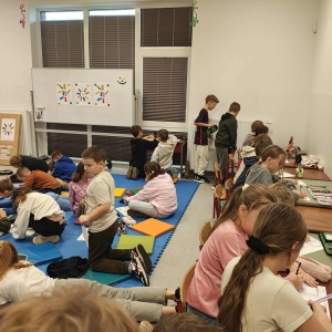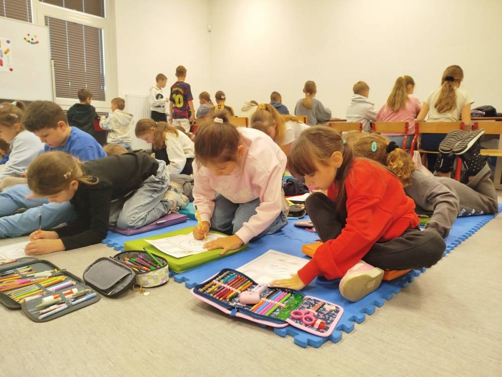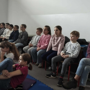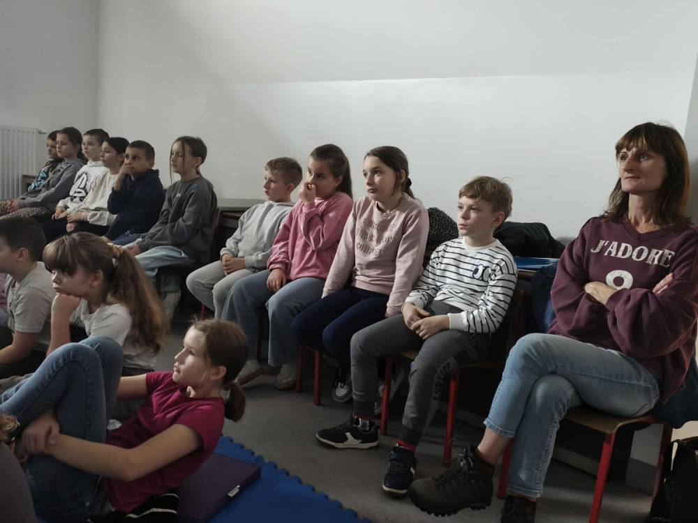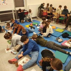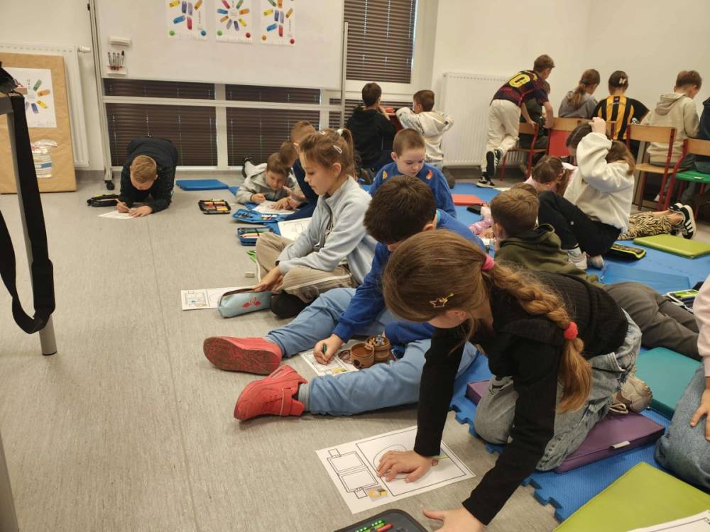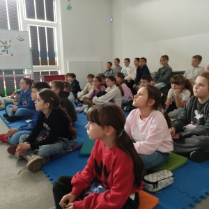 Galeria przedstawia zdjęcia z seansu filmowego w ramach akcji Noc Bibliotek. Na zdjęciach uczniowie ze Szkoły Podstawowej w Smolicach oglądają film. Wykonują również pracę plastyczną.