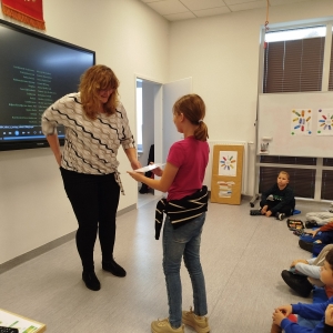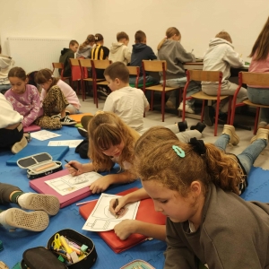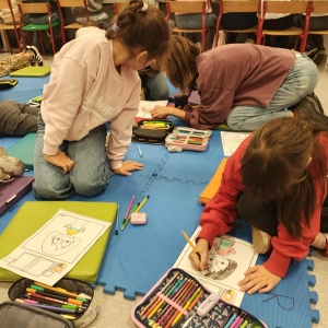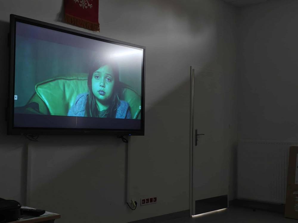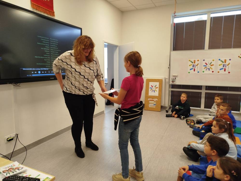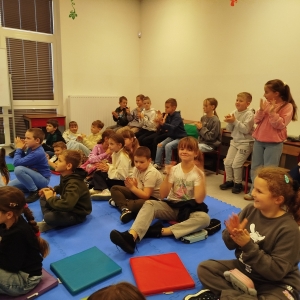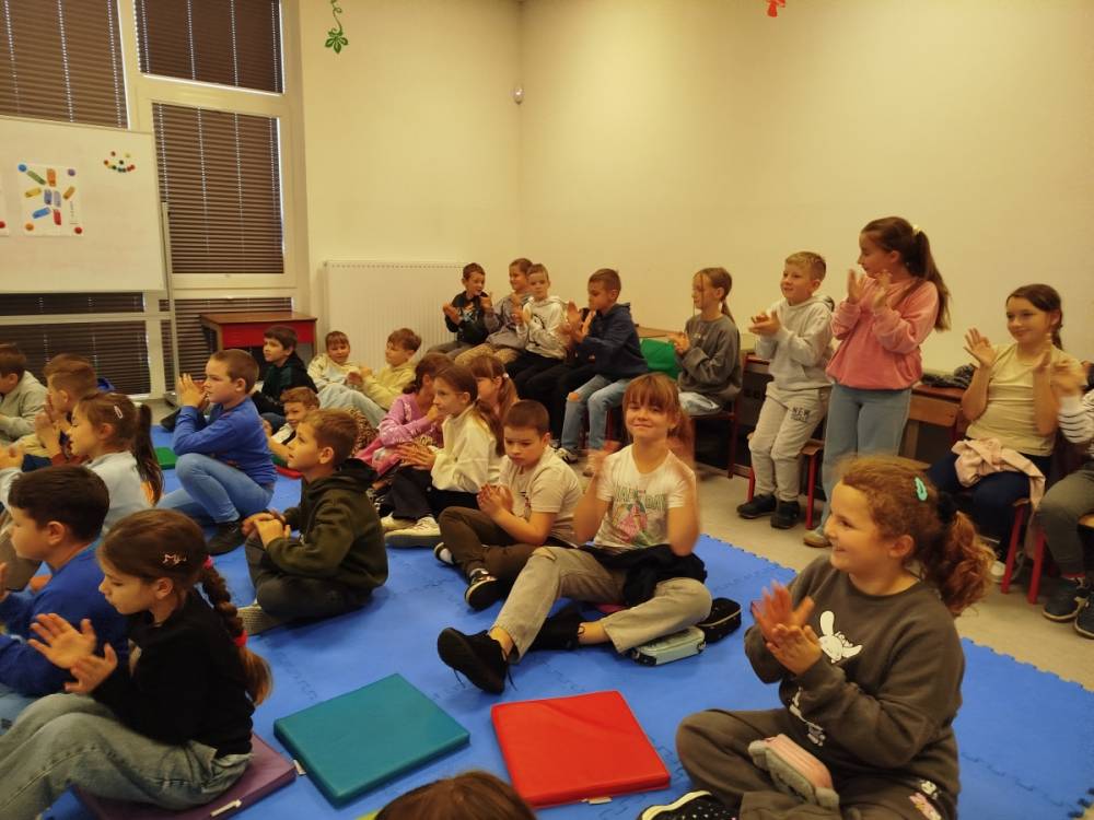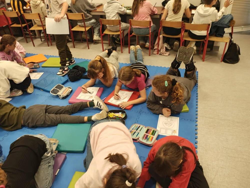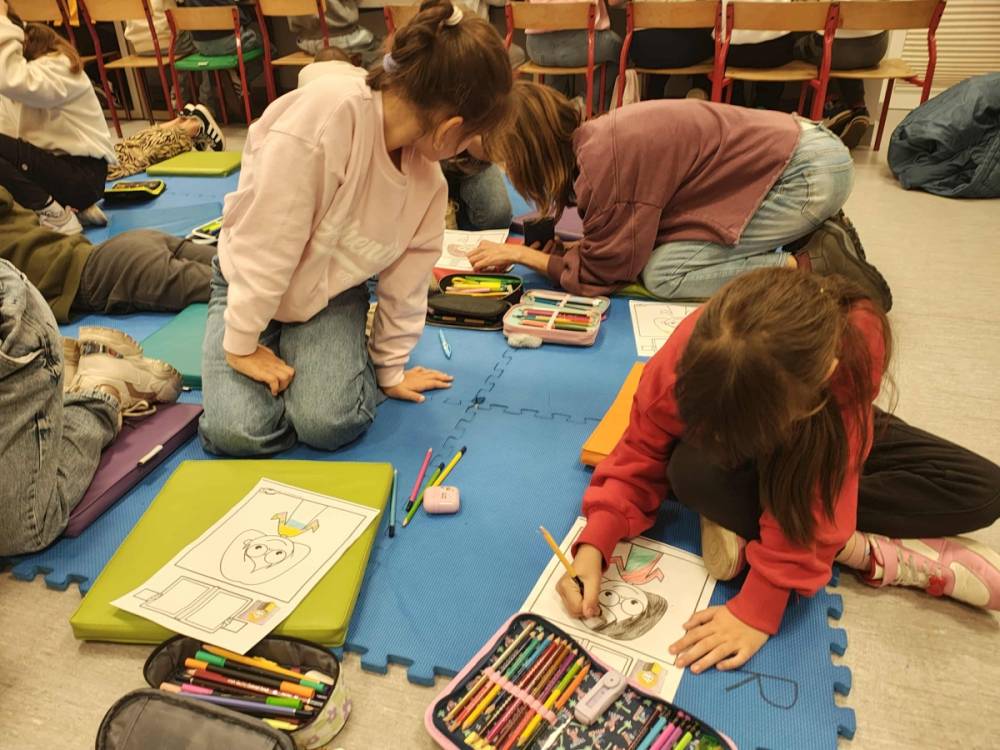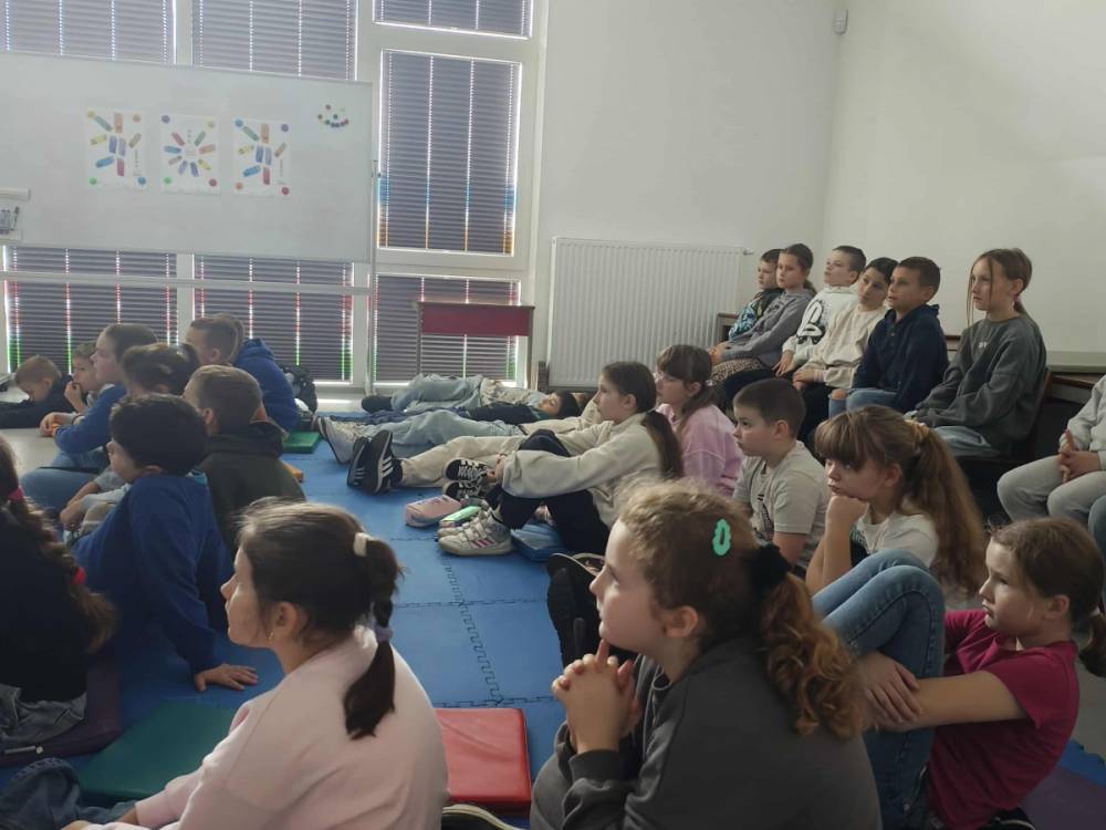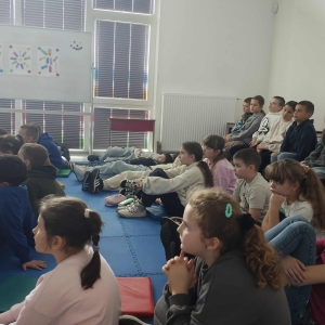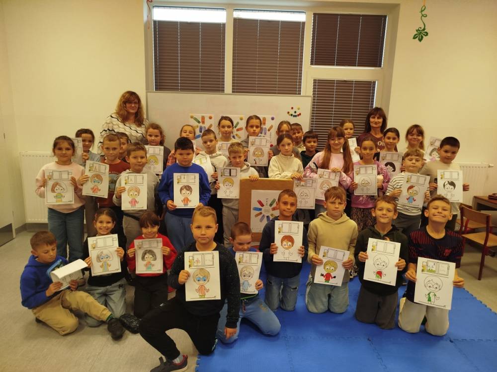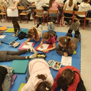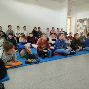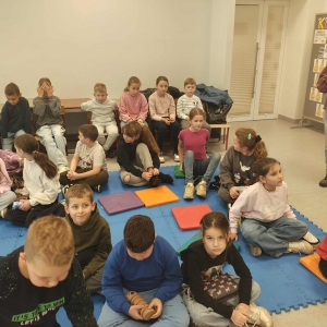 Galeria przedstawia zdjęcia z seansu filmowego w ramach akcji Noc Bibliotek. Na zdjęciach uczniowie ze Szkoły Podstawowej w Smolicach oglądają film. Wykonują również pracę plastyczną.
