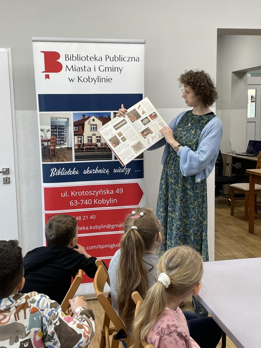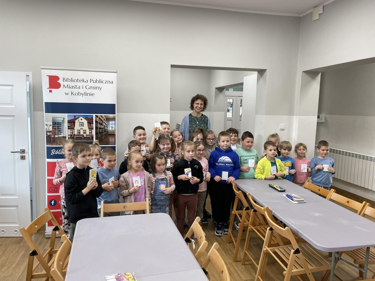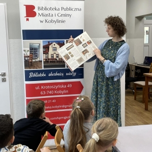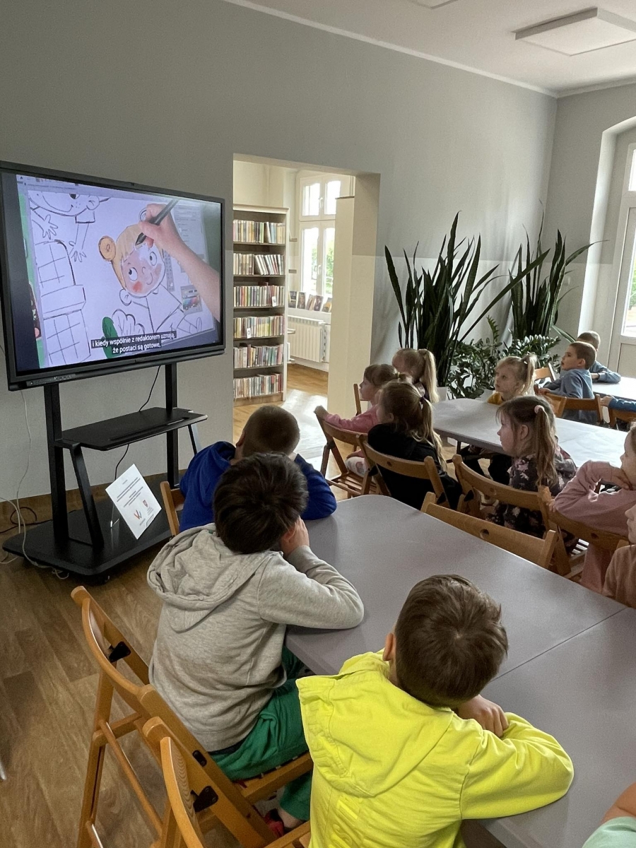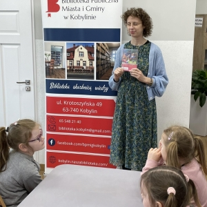 Rozmowę rozpoczęliśmy od tematu książek oraz księgozbioru kobylińskiej książnicy. Dzieci z nie lada zdumieniem przyjęły informację, że księgozbiór naszej biblioteki liczy prawie 20 tysięcy pozycji! Mówiliśmy także o tym jak powstaje książka. Obejrzeliśmy również krótki filmik, który ukazał nam długi proces tworzenia – rozpoczynając od pomysłu pisarza, a kończąc na księgarni, skąd można zakupić daną książkę.