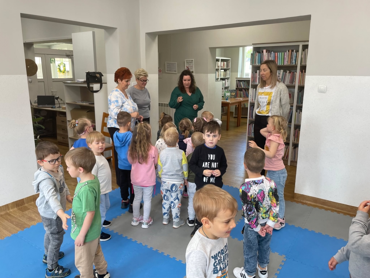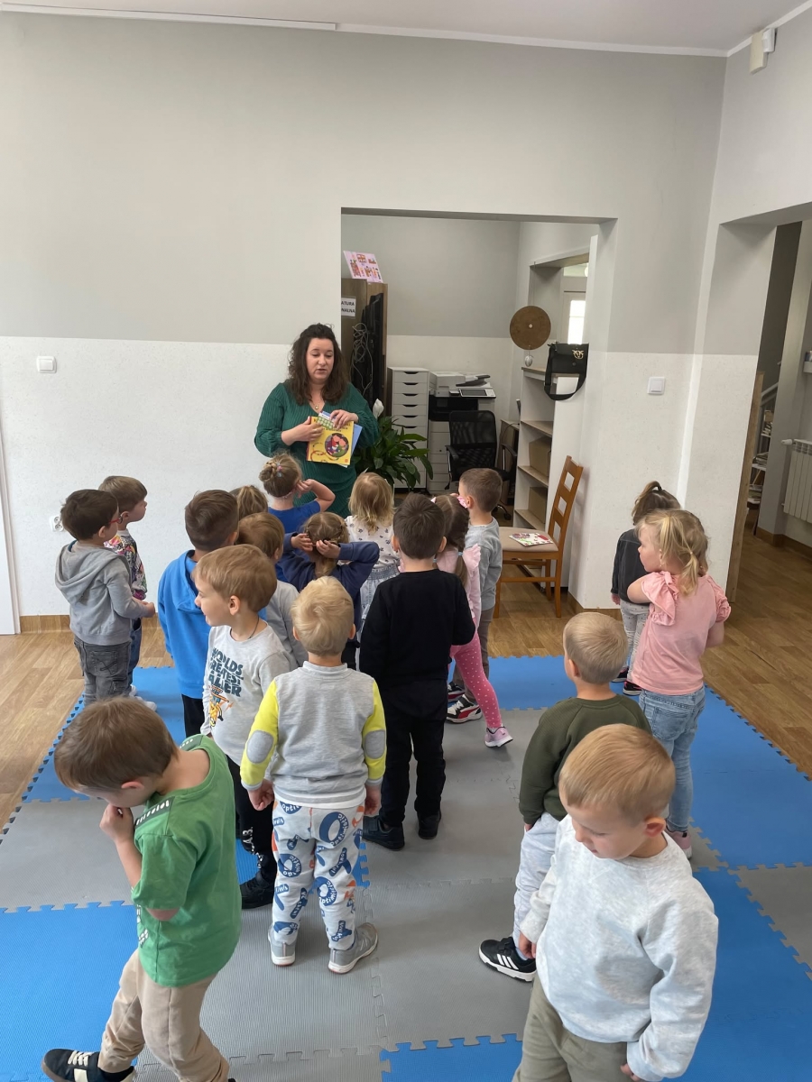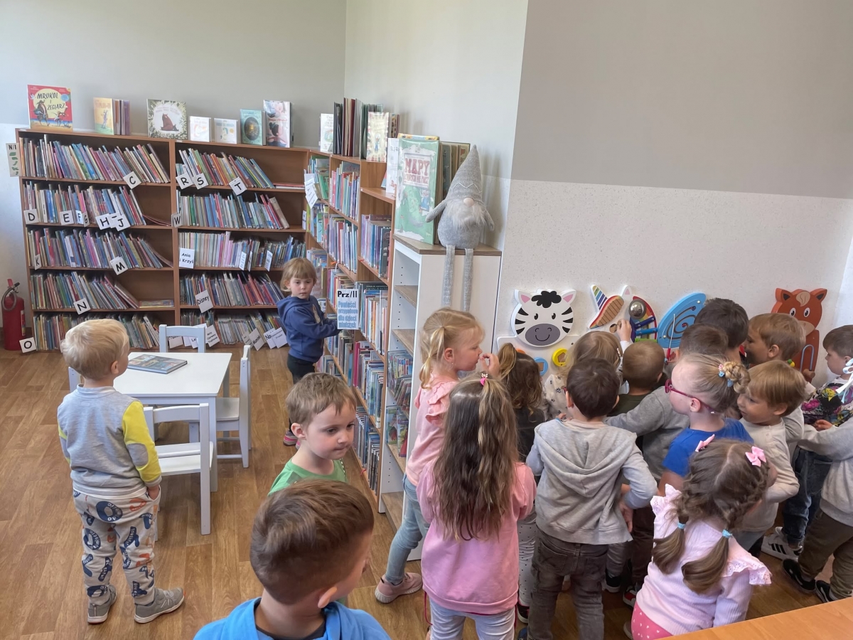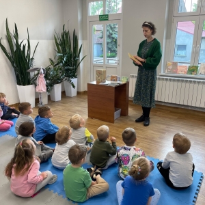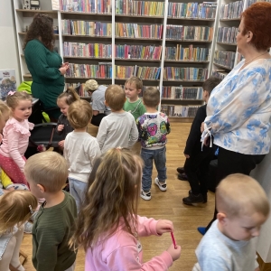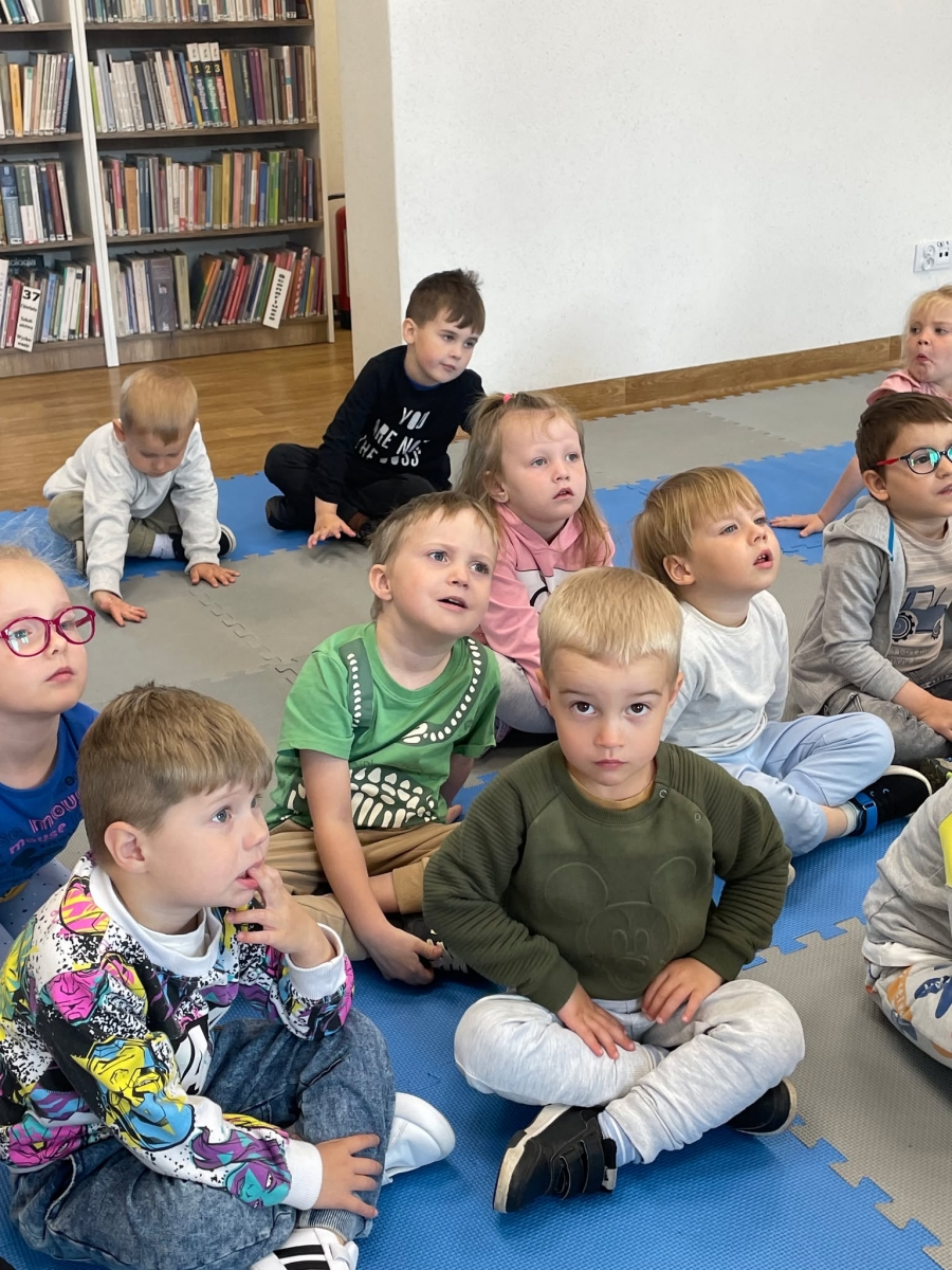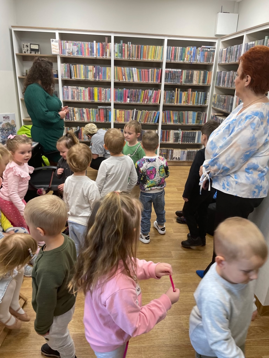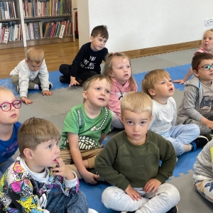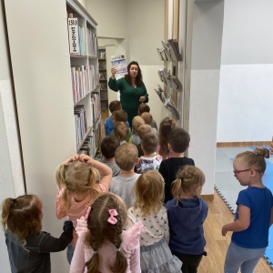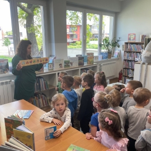 Była to pierwsza wizyta dzieci w naszej bibliotece. Rozmawialiśmy o książkach – o ich różnorodności pod względem formatu oraz tematu. Przedszkolacy wysłuchali książki „Tupcio Chrupcio. Nie chcę jeść!”. Oglądali również książki, z czego najbardziej spodobała im się „Pająk Patryk”.
