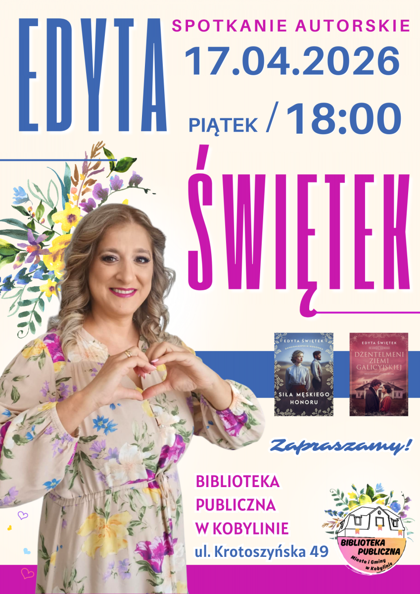 Galeria zdjęć przedstawia plakat, który jest zaproszeniem na spotkanie autorskie z Edytą Swiętek, które odbędzie się 17 kwietnia 2026 roku o godz. 18:00 w Bibliotece Publicznej w Kobylinie. Na plakacie znajduje się także fotografia autorki na beżowym tle.