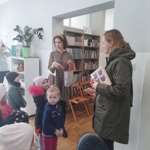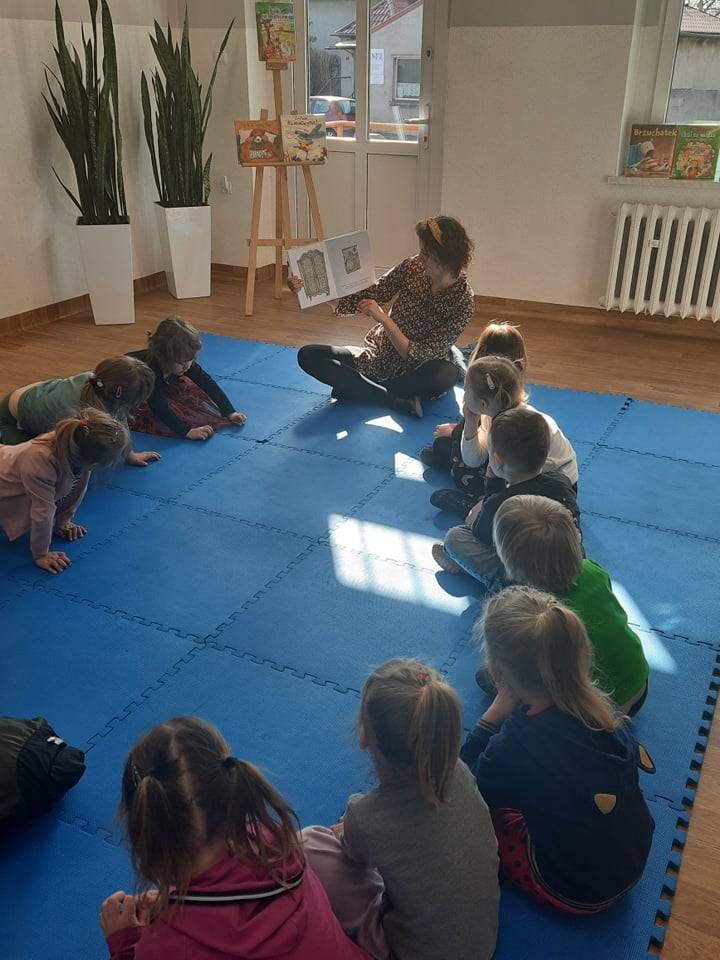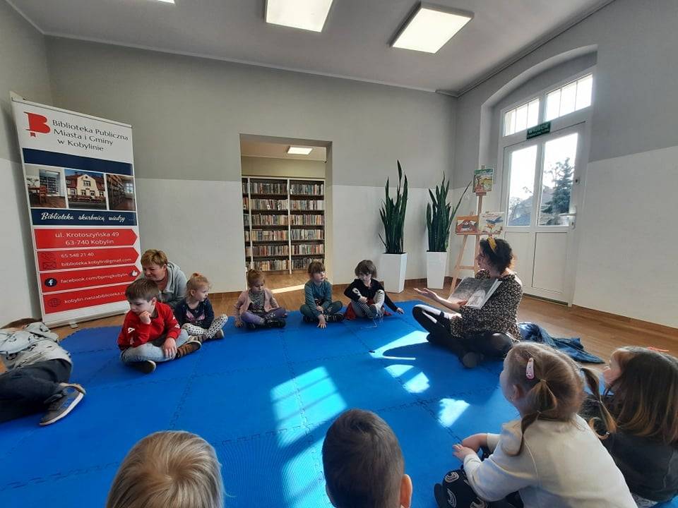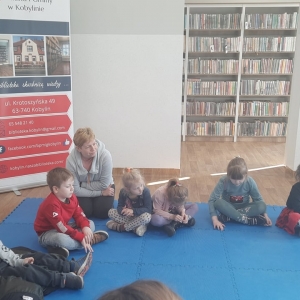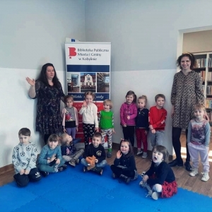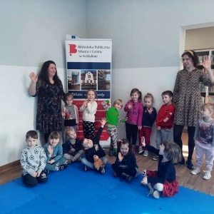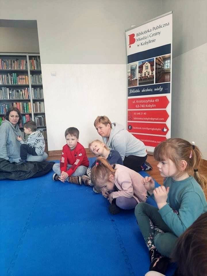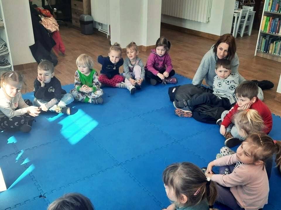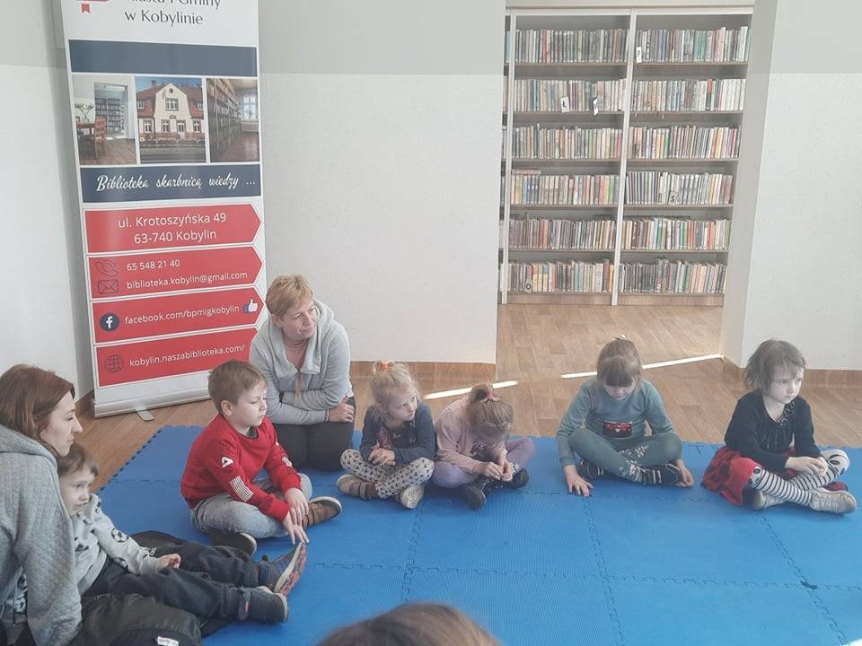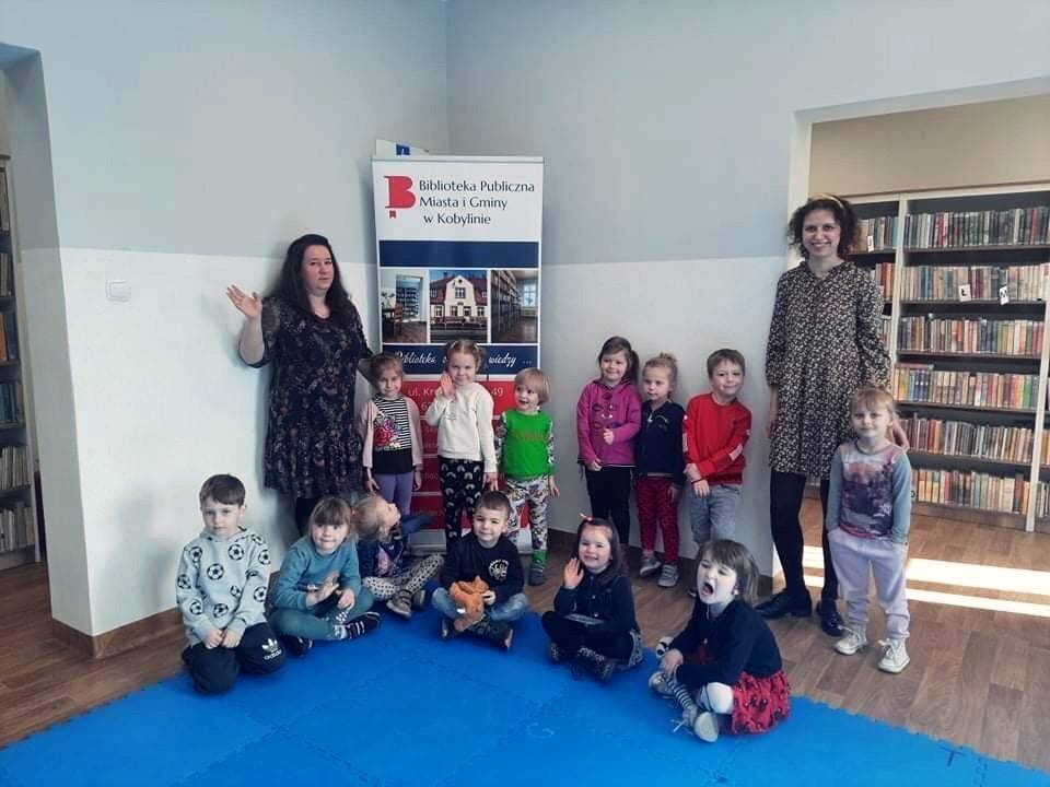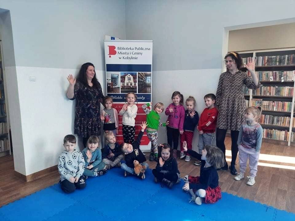 We wtorkowy poranek, 15 marca naszą bibliotekę odwiedziła grupa Smerfów z kobylińskiego przedszkola wraz z wychowawcą, panią Anetą Hądzelek oraz panią Moniką Pilujską.