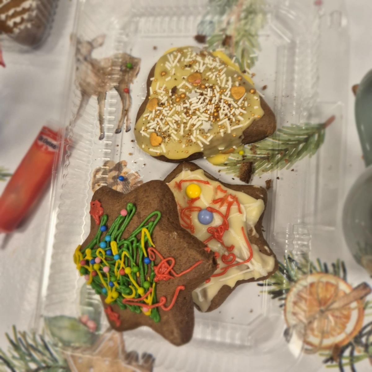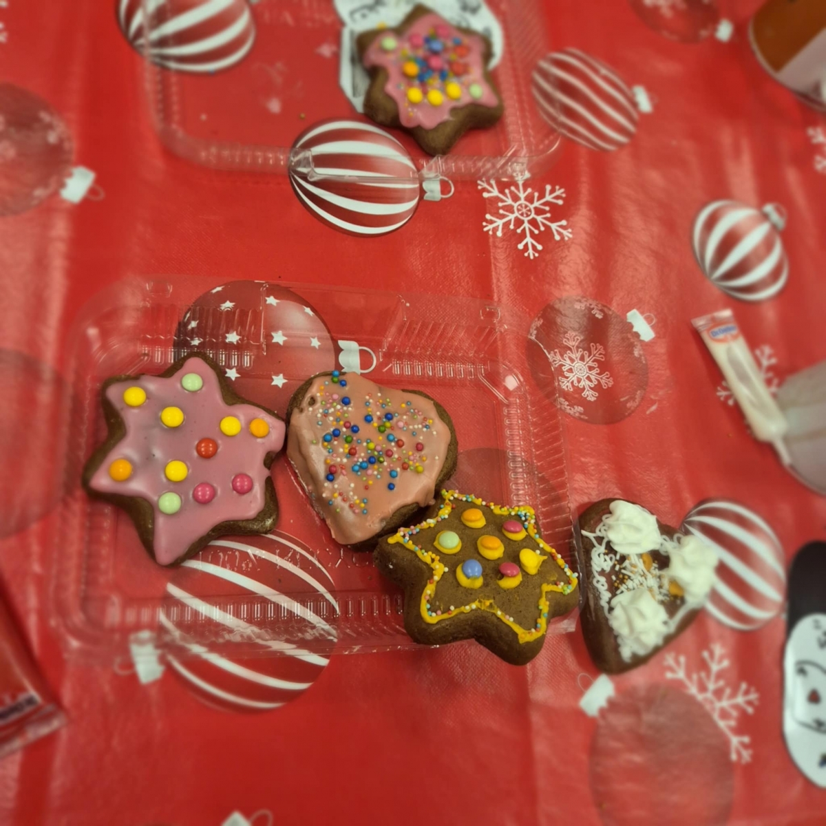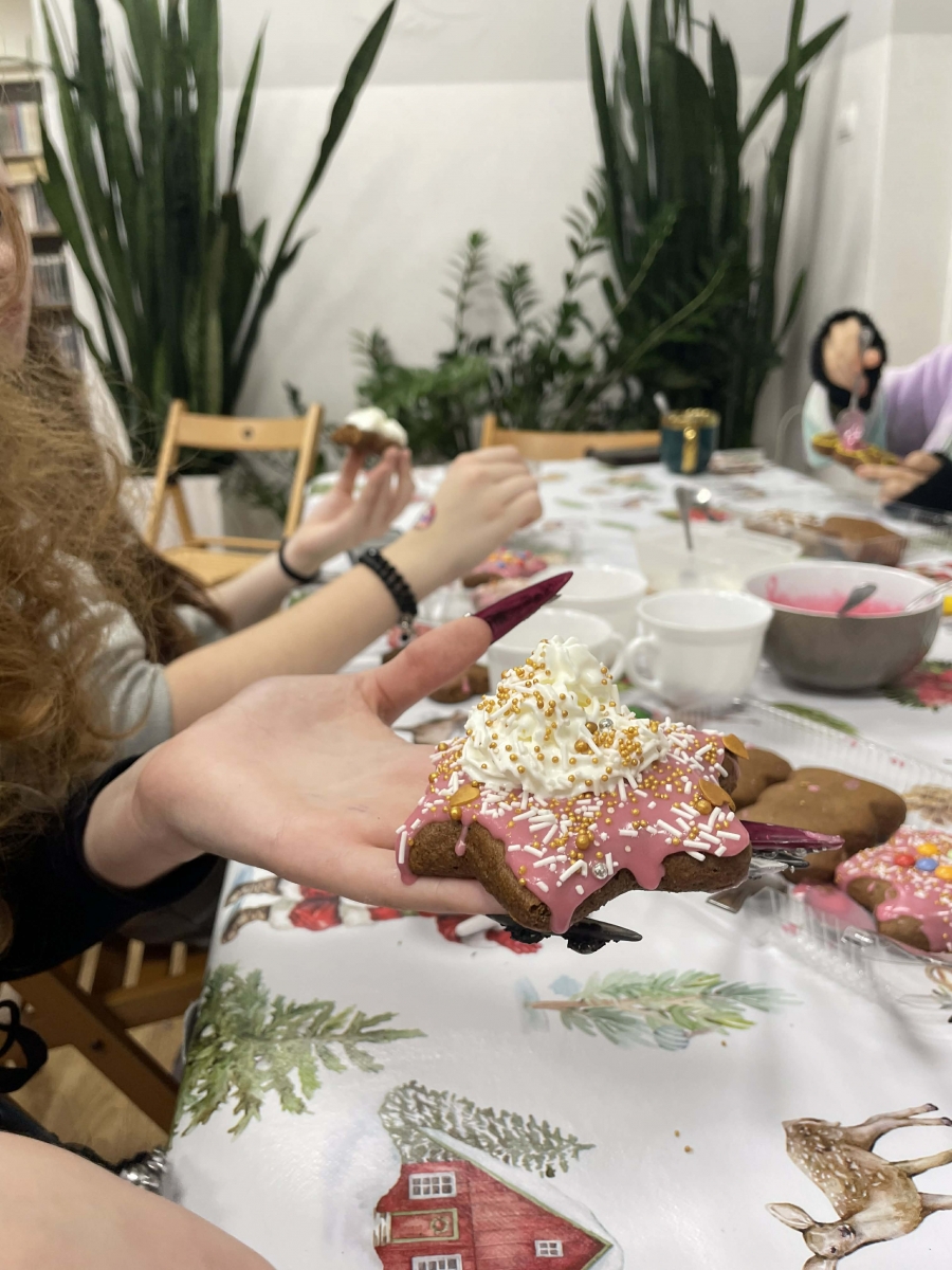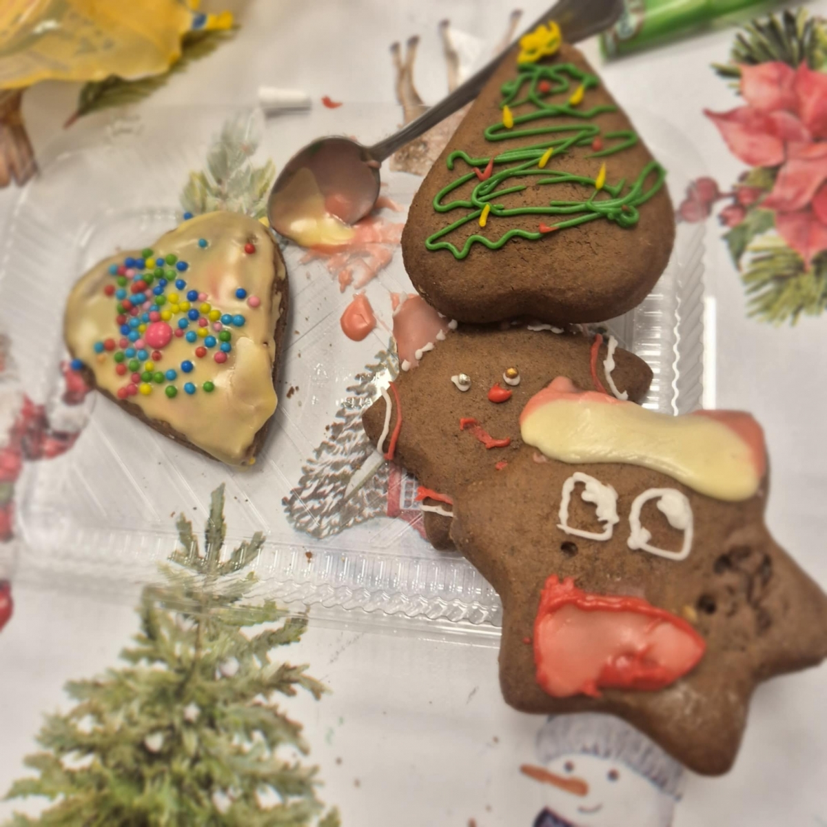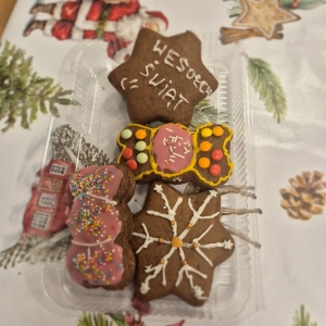 Świąteczne spotkanie w bibliotece nie mogło odbyć się bez lukrowania i zdobienia pierników. Było smacznie i kolorowo. Wszyscy zajadaliśmy pierniki i popijaliśmy gorące kakao.