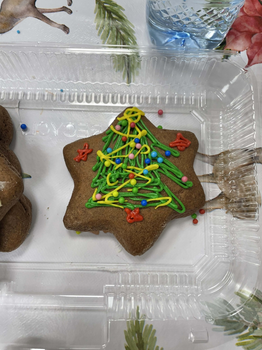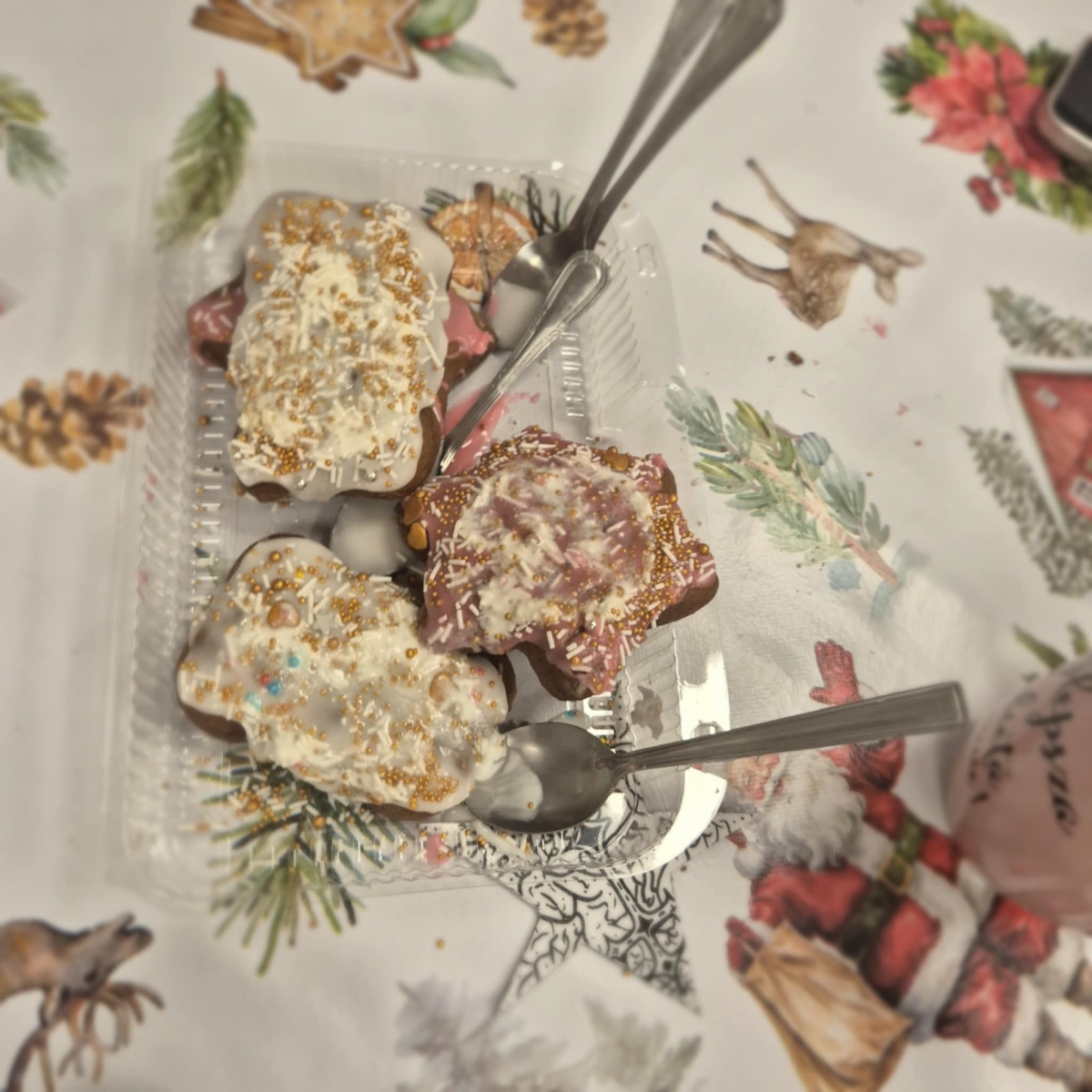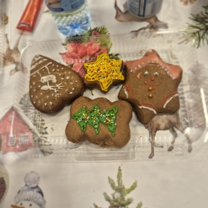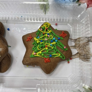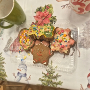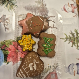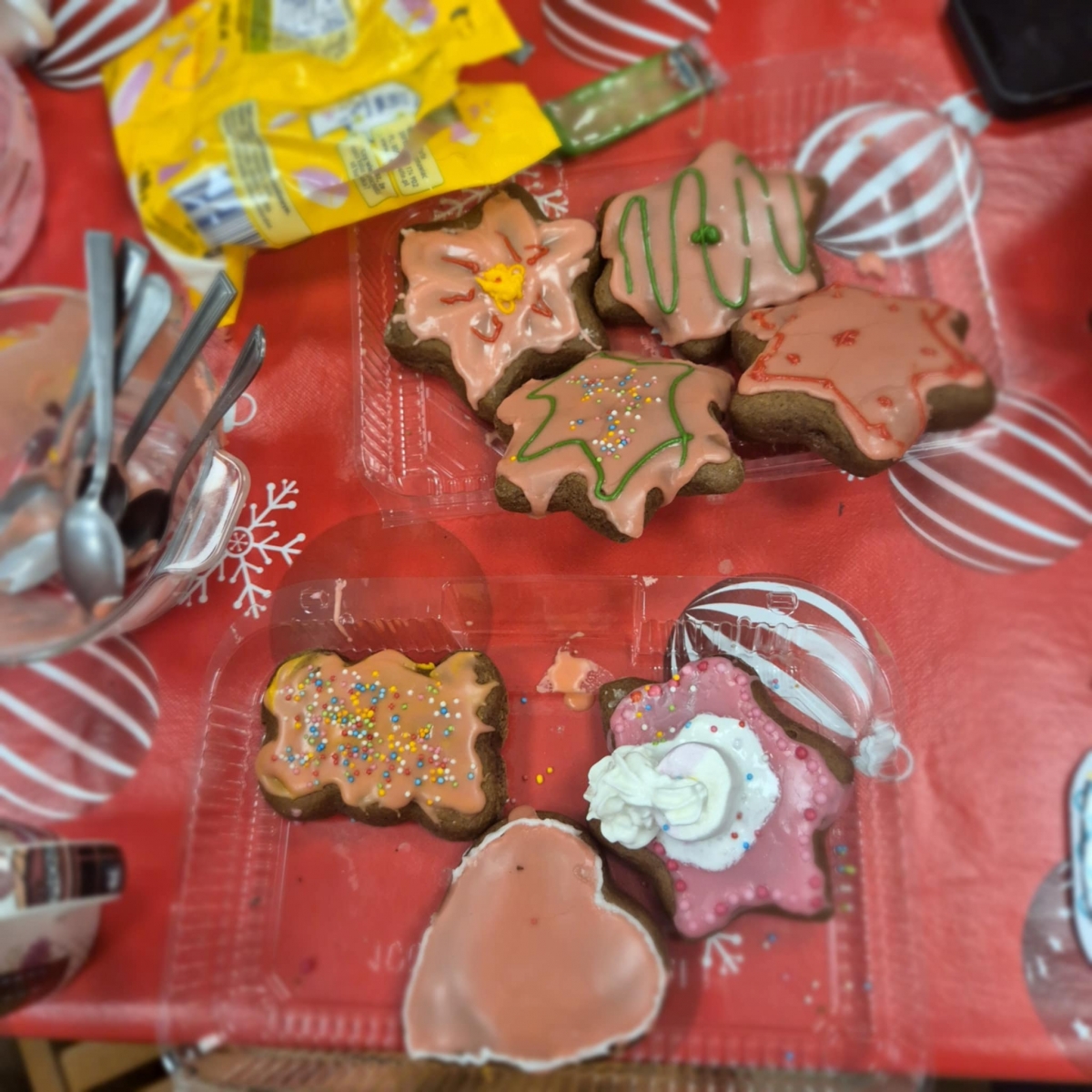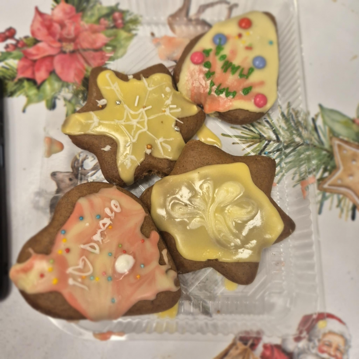 Świąteczne spotkanie w bibliotece nie mogło odbyć się bez lukrowania i zdobienia pierników. Było smacznie i kolorowo. Wszyscy zajadaliśmy pierniki i popijaliśmy gorące kakao.