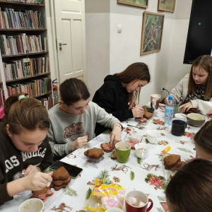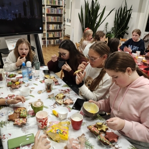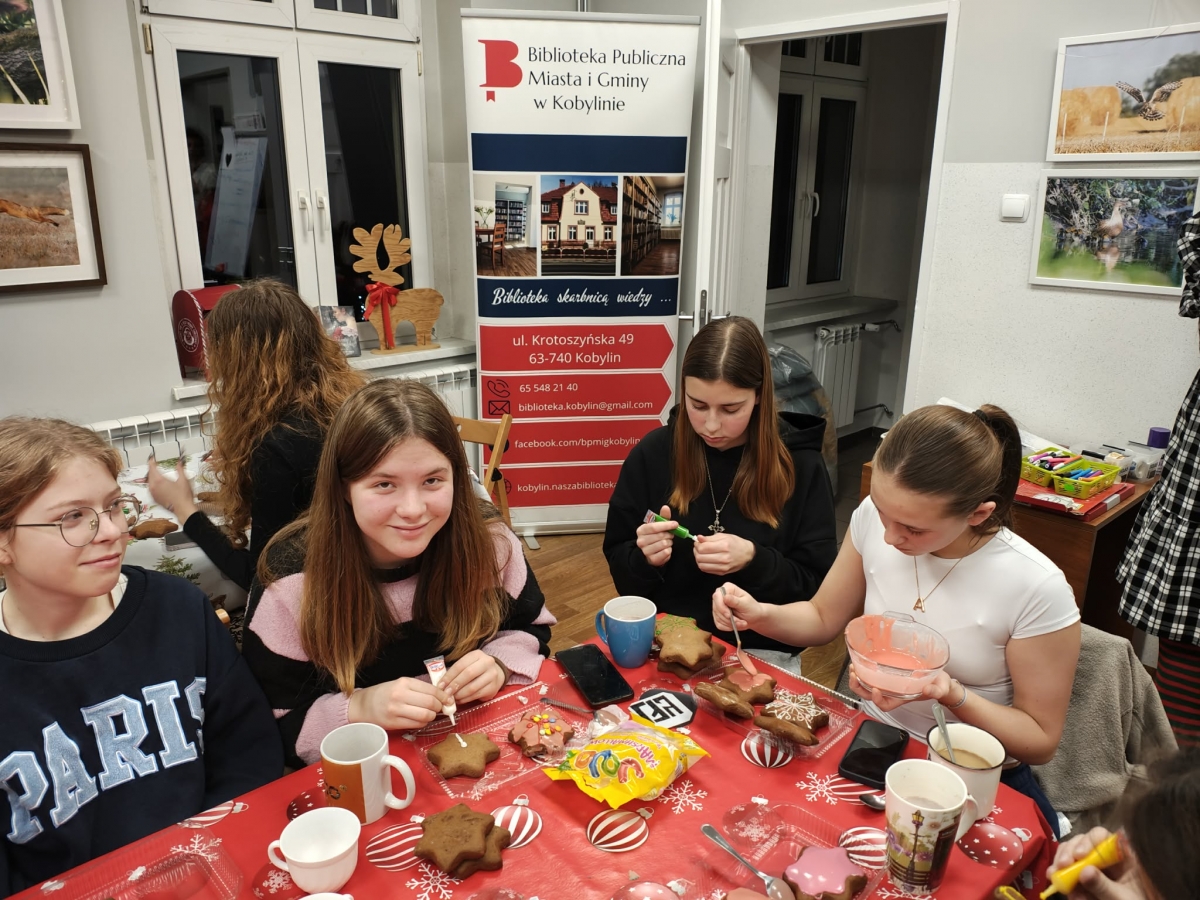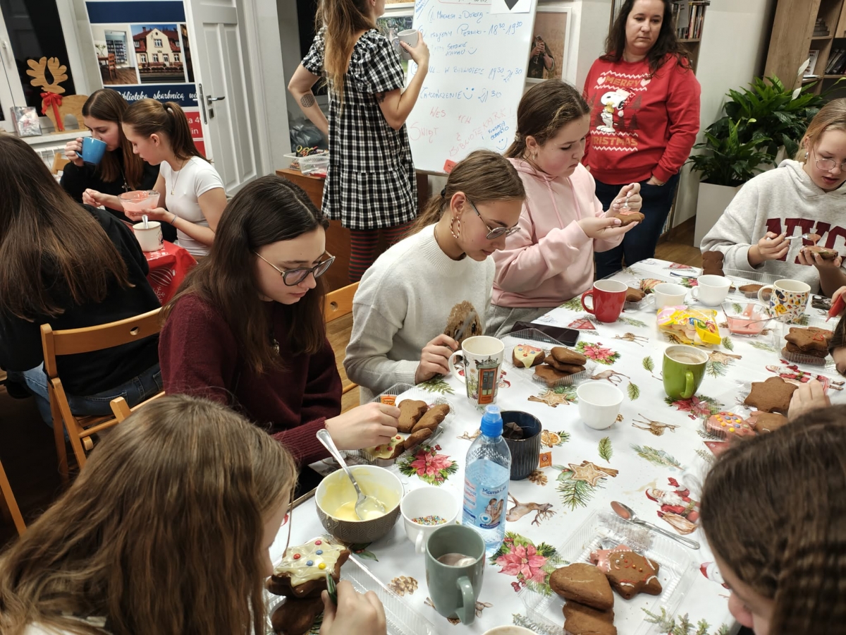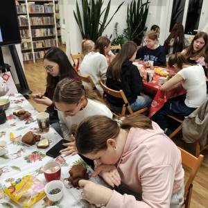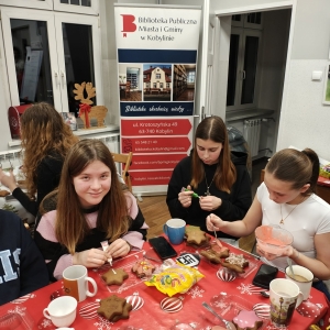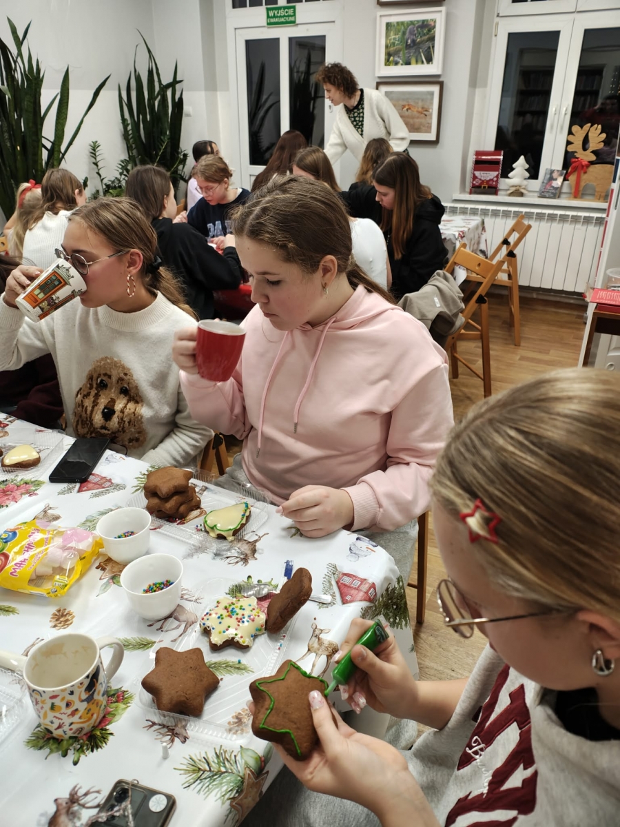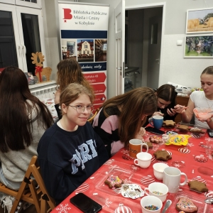 W galerii znajdują się zdjęcia grupy młodzieży i opiekunów podczas zajęć ŚWIĄTECZA BIBLIOTEKA. Uczestnicy tworzą magnesy , lukrują pierniki, piją kakao, wspólnie rozmawiają, bawią się.