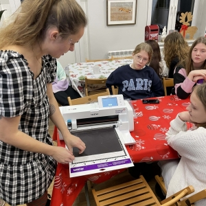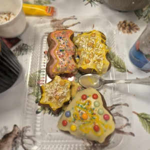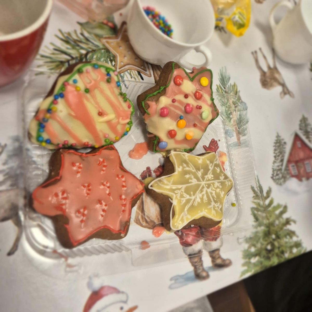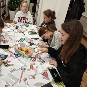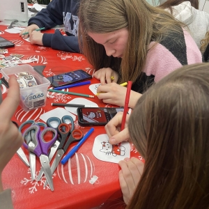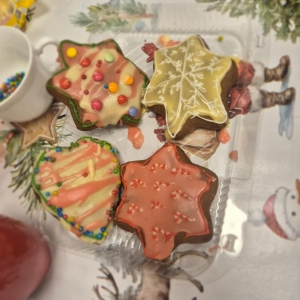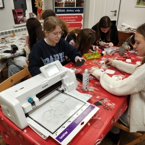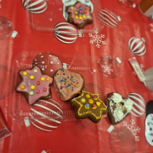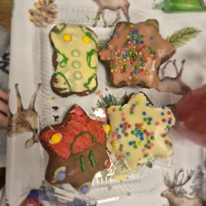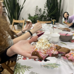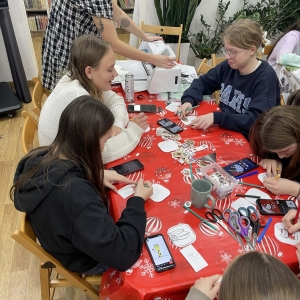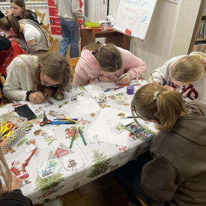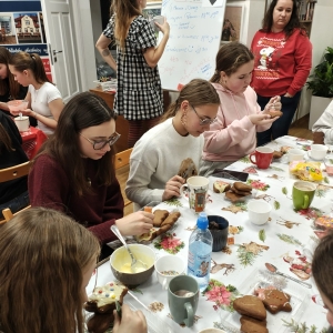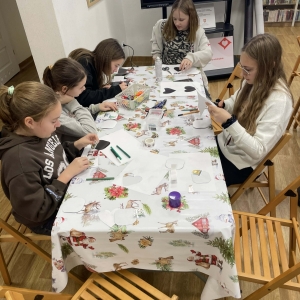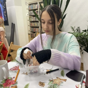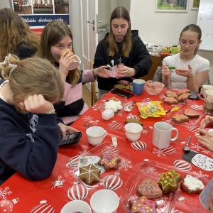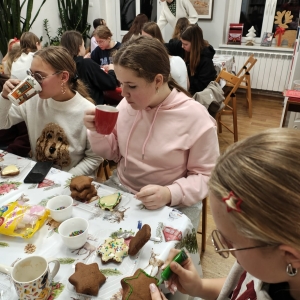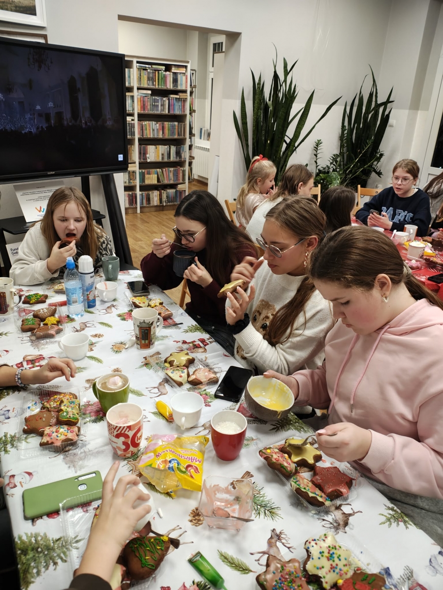 W galerii znajdują się zdjęcia grupy młodzieży i opiekunów podczas zajęć ŚWIĄTECZA BIBLIOTEKA. Uczestnicy tworzą magnesy , lukrują pierniki, piją kakao, wspólnie rozmawiają, bawią się.