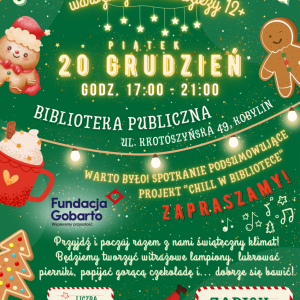ŚWIĄTECZNA BIBLIOTEKA – oto tytuł naszego grudniowego spotkania! Jest ono organizowane w ramach projektu CHILL W BIBLIOTECE dzięki II edycji programu „Wspieramy Przyszłość” Fundacji Gobarto.
