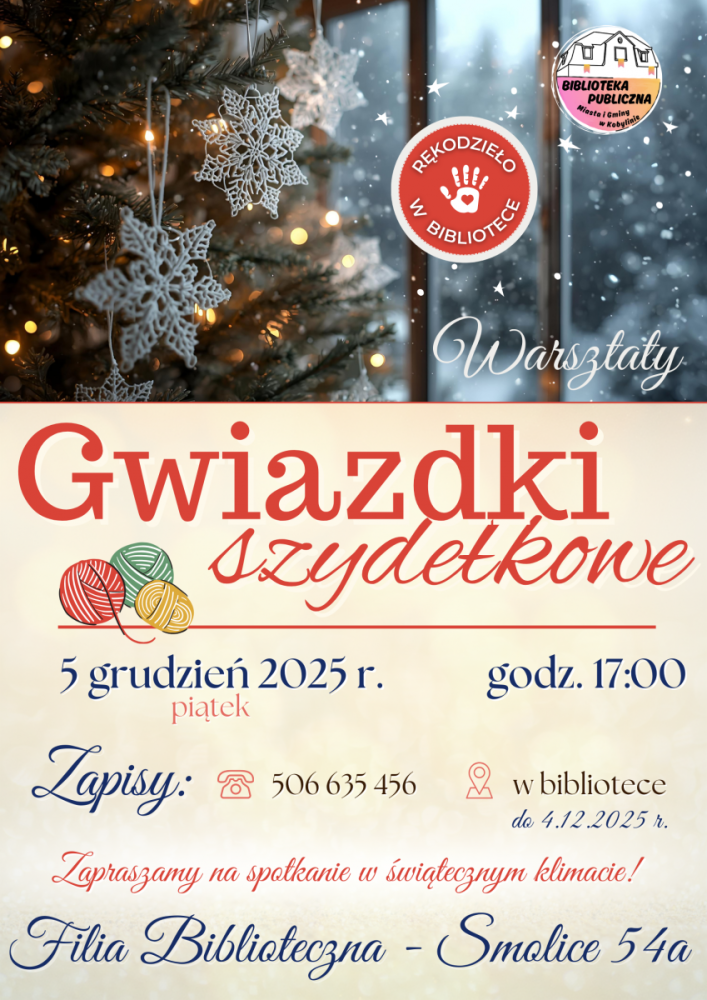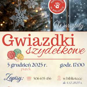 Zapraszamy na świąteczne warsztaty szydełkowe do Filii Bibliotecznej w Smolicach. Podczas spotkania będziemy dziergały ozdoby świąteczne.