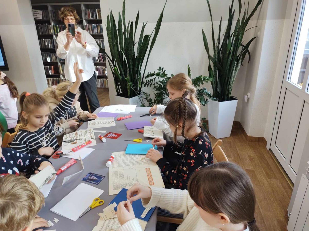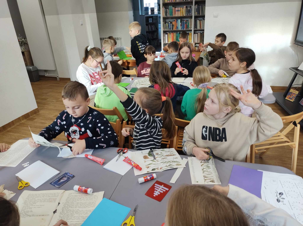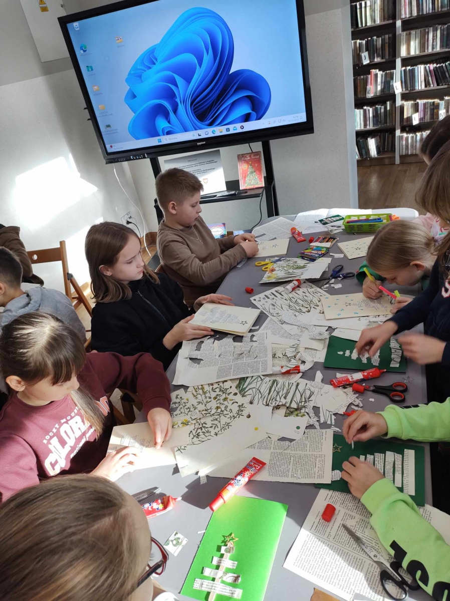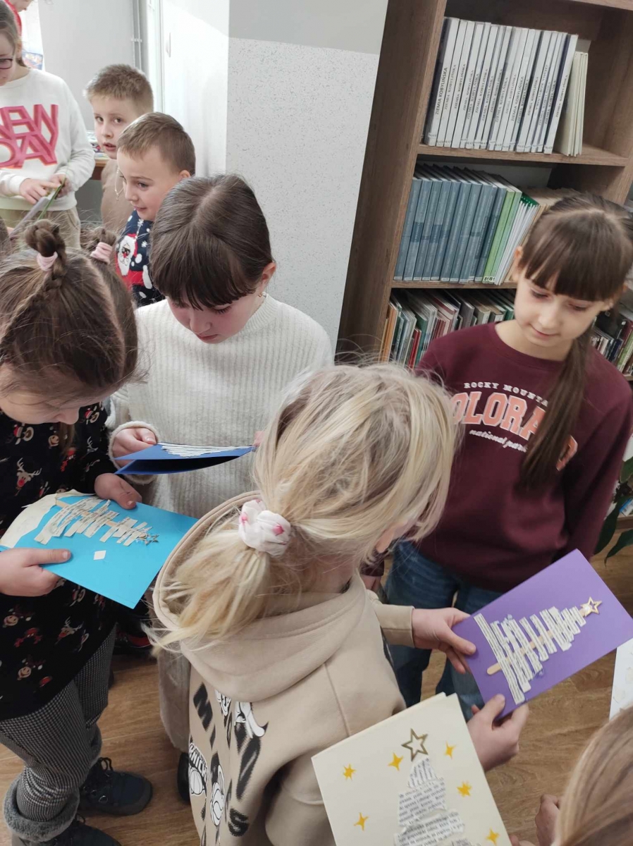 Na końcu uczniowie tworzyli kartki świąteczne z wykorzystaniem zniszczonych kart książki, ucząc się przy tym sztuki odnawialnej. Kartki będą podarunkiem dla najbliższych dzieciom osób.