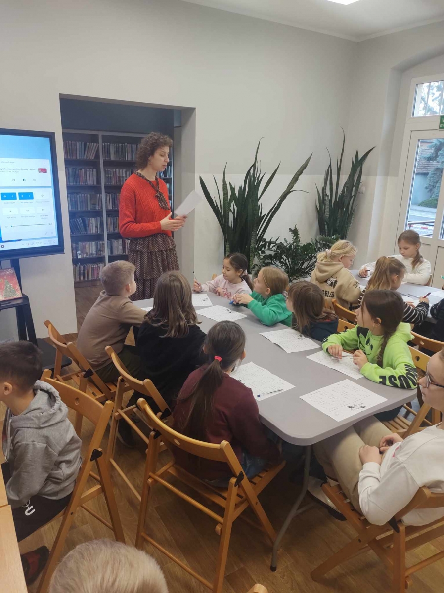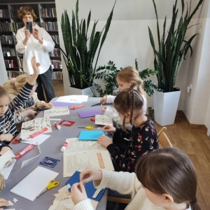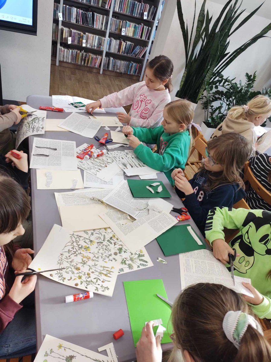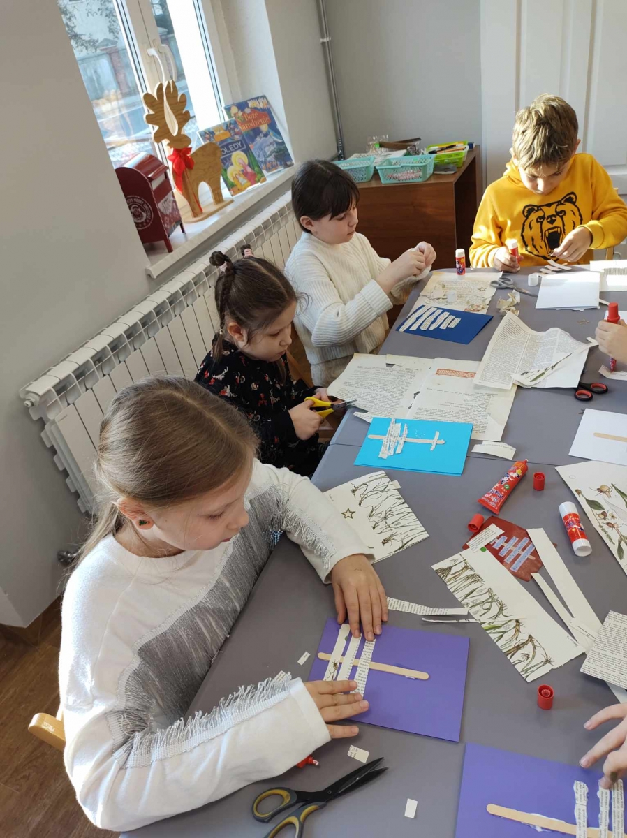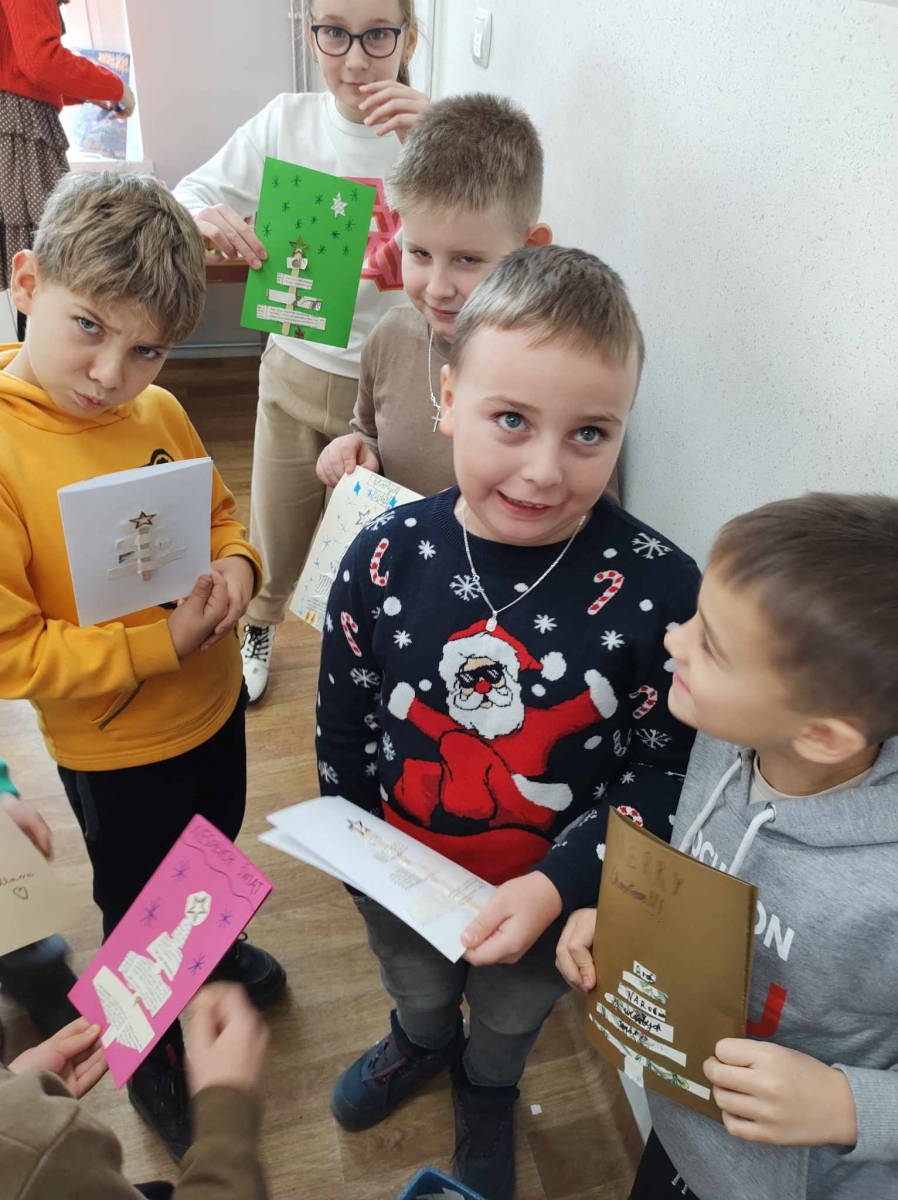 Na końcu uczniowie tworzyli kartki świąteczne z wykorzystaniem zniszczonych kart książki, ucząc się przy tym sztuki odnawialnej. Kartki będą podarunkiem dla najbliższych dzieciom osób.