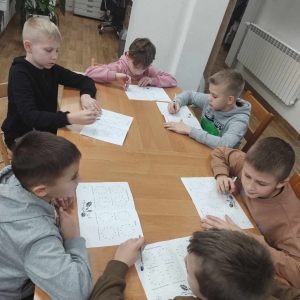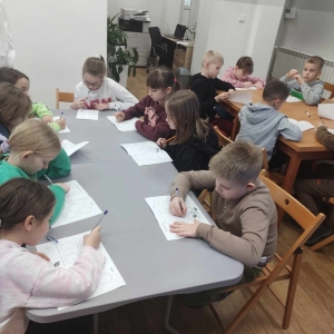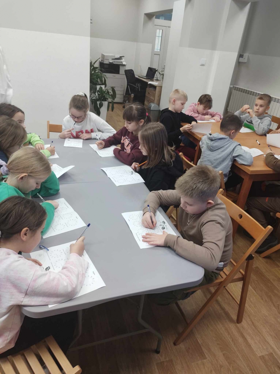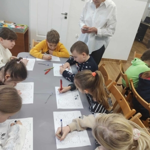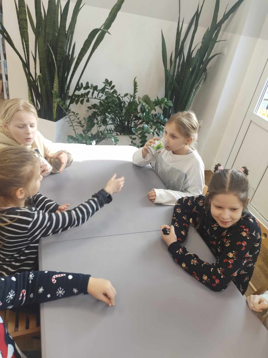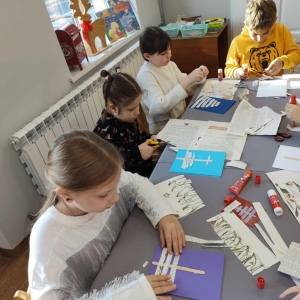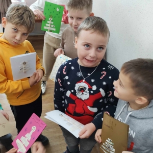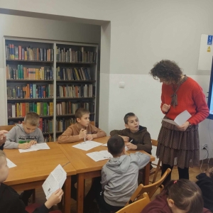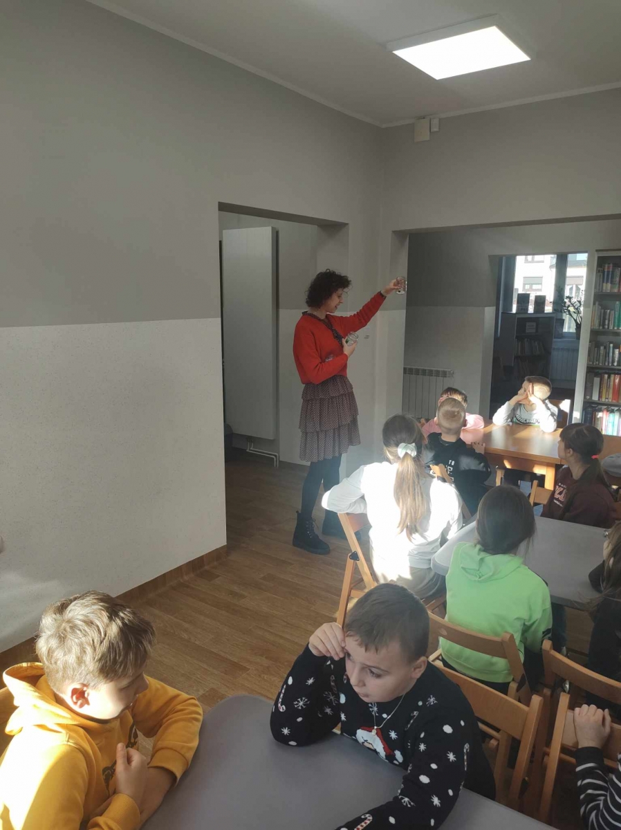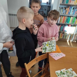 Na końcu uczniowie tworzyli kartki świąteczne z wykorzystaniem zniszczonych kart książki, ucząc się przy tym sztuki odnawialnej. Kartki będą podarunkiem dla najbliższych dzieciom osób.