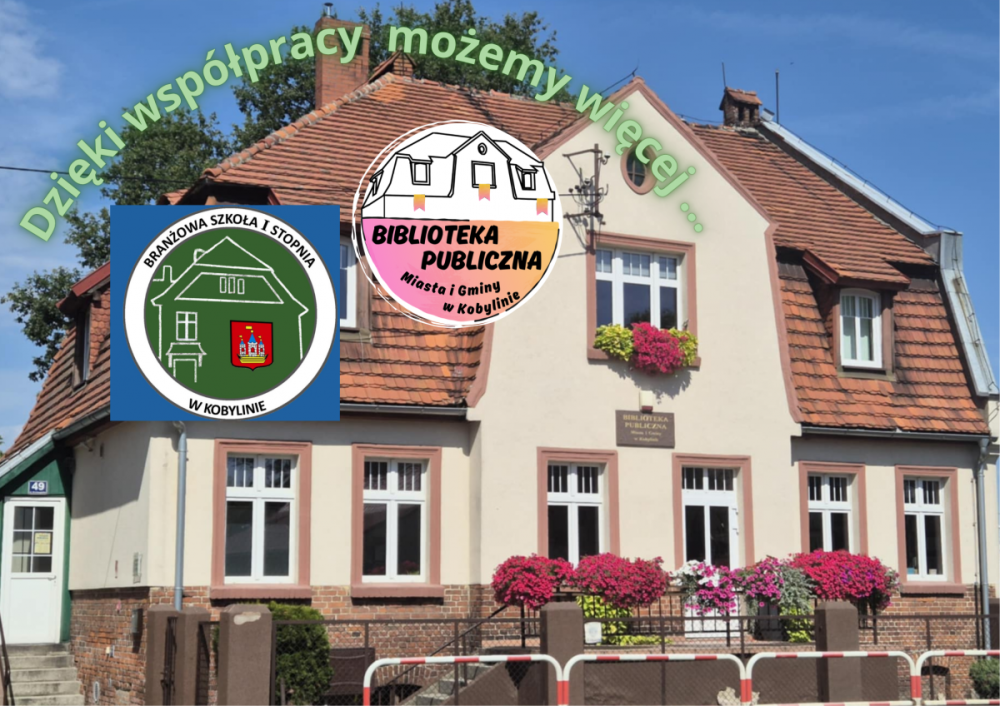 Fotografia przedstawia w tle budynek Biblioteki Publicznej Miasta i Gminy w Kobylinie. W lewym górnym rogu fotografii znajdue się logo Branżowej Szkoły I stopnia w Kobylinie oraz Biblioteki Publicznej. Na fotografii umieszczono równiez hasło ,,Dzięki współpracy możemy więcej ..." .