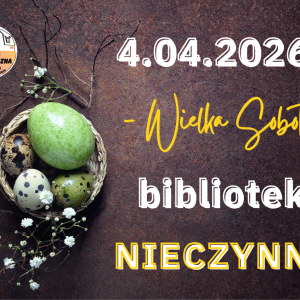 Ilustracja w galerii zdjęć przedstawia informację skierowaną do Czytelników biblioteki, mówiącą o tym, że w dnia 4 kwietnia 2026 r (Wielka Sobota) biblioteka będzie nieczynna. Grafika jest w kolorze ciemnym z elementami zieleni. Po lewej stronie znajduje się gniazdko z zielonymi jajkami - pisankami.