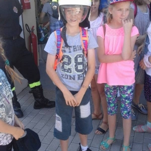 Już na wstępie spotkaliśmy się z serdecznym przyjęciem ze strony strażaka. Pierwszym punktem wycieczki był pokaz umundurowania. Oczywiście nie obyło się również bez przymiarek… Nasi mali strażacy prezentowali się świetnie. Korzystając z pięknej pogody, dalsza część naszego spotkania odbyła się przed remizą strażacką, gdzie mogliśmy obejrzeć wyposażenie i zapoznać się ze sprzętem wozów strażackich. Jakże ogromną atrakcją była przejażdżka wozem strażackim, przy dźwiękach syren, do kolejnego miejsca na naszej liście, czyli na Posterunek Policji w Kobylinie.