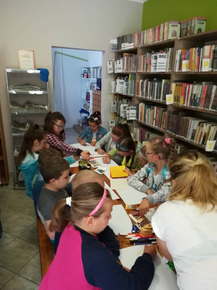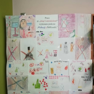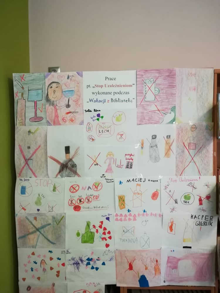 W kolejnym dniu Wakacji z Biblioteką pierwszym punktem spotkania była rozmowa z dziećmi na temat uzależnień. Najmłodsi czytelnicy dowiedzieli się czym są używki oraz jakie szkody wyrządza alkohol w organizmie człowieka. Następnie wspólnie przeanalizowaliśmy co powinniśmy robić, aby żyć zdrowo. Po rozmowach był czas na rysowanie. Temat prac plastycznych brzmiał „Stop uzależnieniom”.