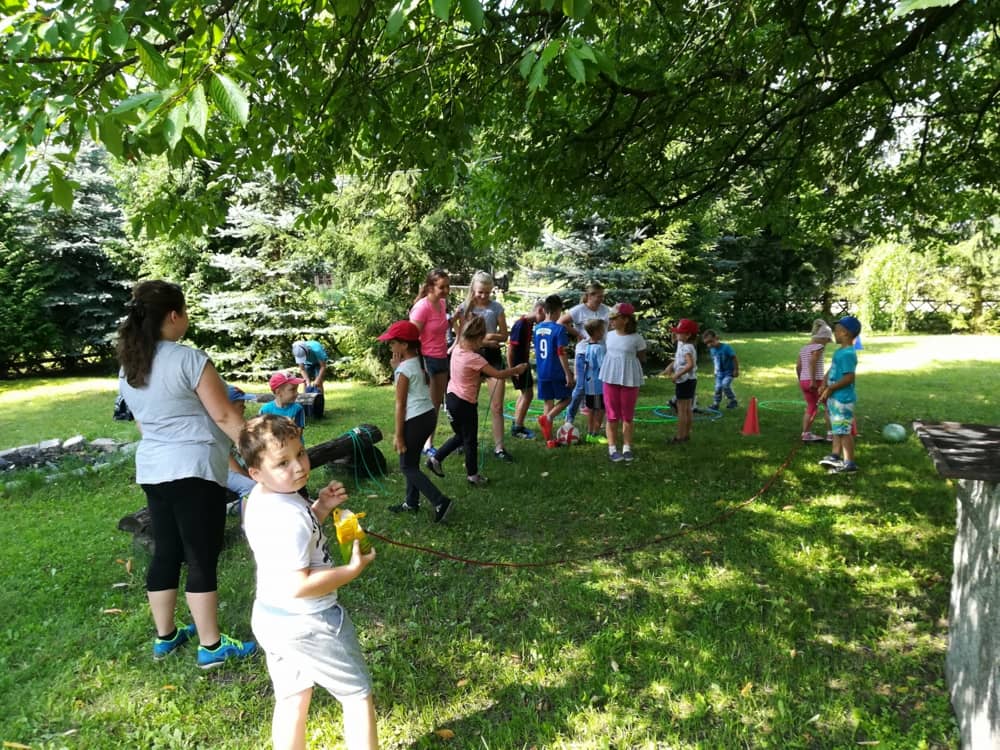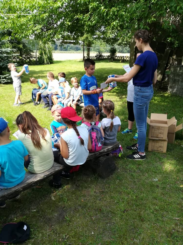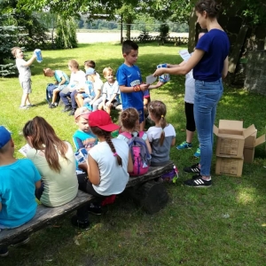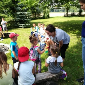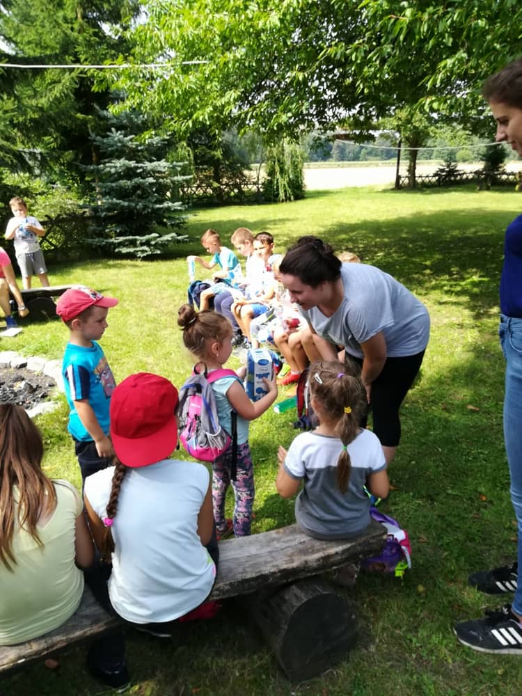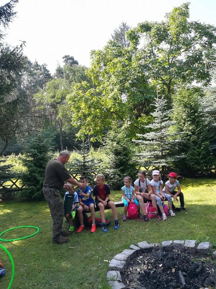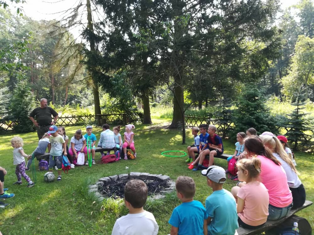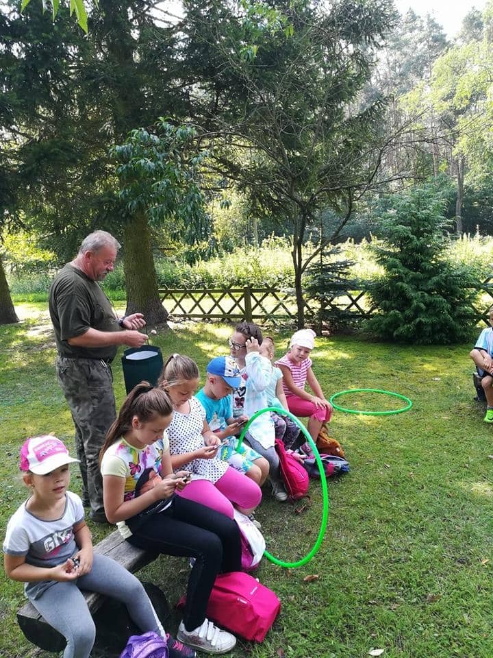 W ostatnim dniu Wakacji z Biblioteką udaliśmy się na teren leśniczówki w Smolicach. Po dotarciu na miejsce leśniczy Pan Krzysztof Błaszyk opowiedział nam pokrótce o pobliskich lasach, podarował każdemu zakładkę do książki oraz życzył udanej zabawy. Następnie odbyły się wyścigi i inne zajęcia ruchowe, po których każdemu zaostrzył się apetyt –nadszedł więc czas na kiełbasę z grilla. Tak właśnie zakończyliśmy Wakacje z Biblioteką w Smolicach. Każdy uczestnik otrzymał imienne podziękowanie oraz dzbanek z kubkami z motywem Kaczora Donalda, który został ufundowany przez firmę Zakłady Mięsne BM Kobylin.