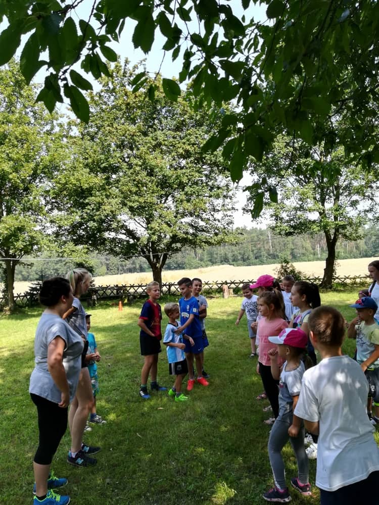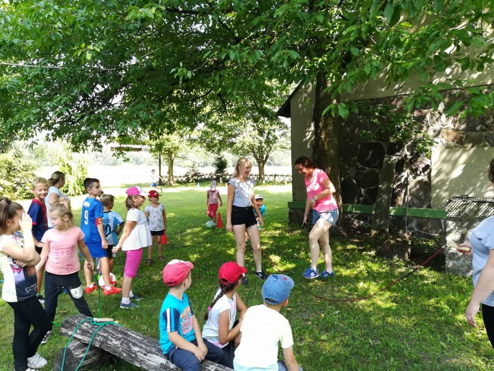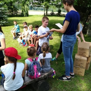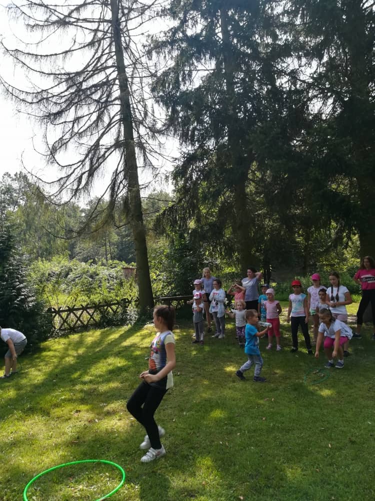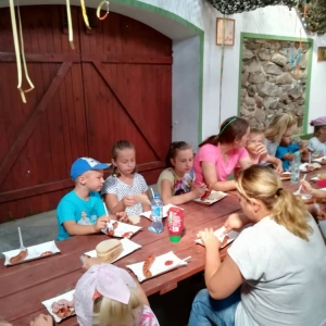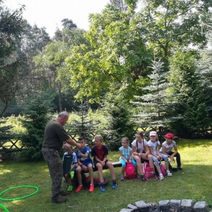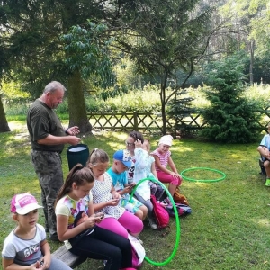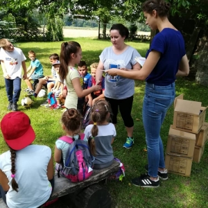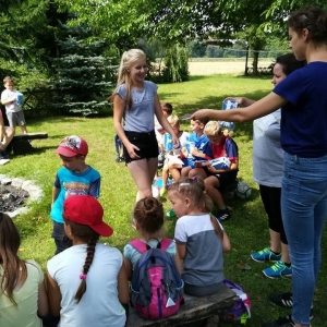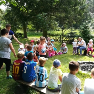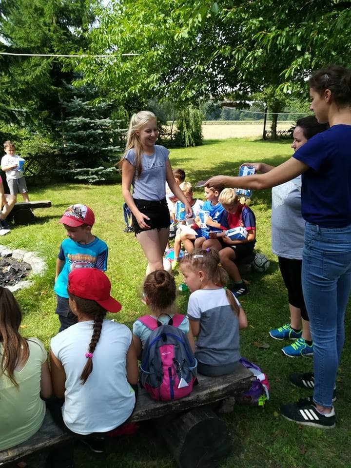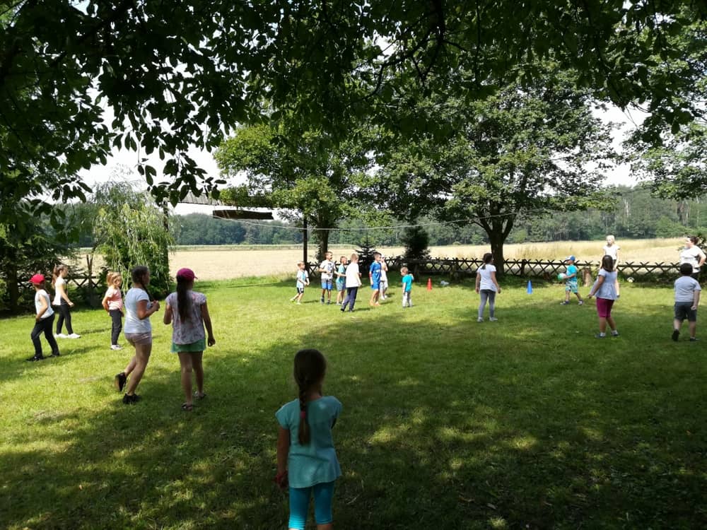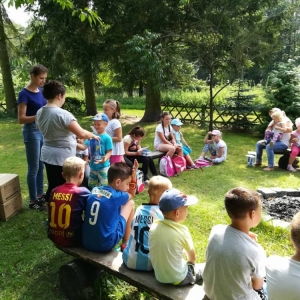 W ostatnim dniu Wakacji z Biblioteką udaliśmy się na teren leśniczówki w Smolicach. Po dotarciu na miejsce leśniczy Pan Krzysztof Błaszyk opowiedział nam pokrótce o pobliskich lasach, podarował każdemu zakładkę do książki oraz życzył udanej zabawy. Następnie odbyły się wyścigi i inne zajęcia ruchowe, po których każdemu zaostrzył się apetyt –nadszedł więc czas na kiełbasę z grilla. Tak właśnie zakończyliśmy Wakacje z Biblioteką w Smolicach. Każdy uczestnik otrzymał imienne podziękowanie oraz dzbanek z kubkami z motywem Kaczora Donalda, który został ufundowany przez firmę Zakłady Mięsne BM Kobylin.