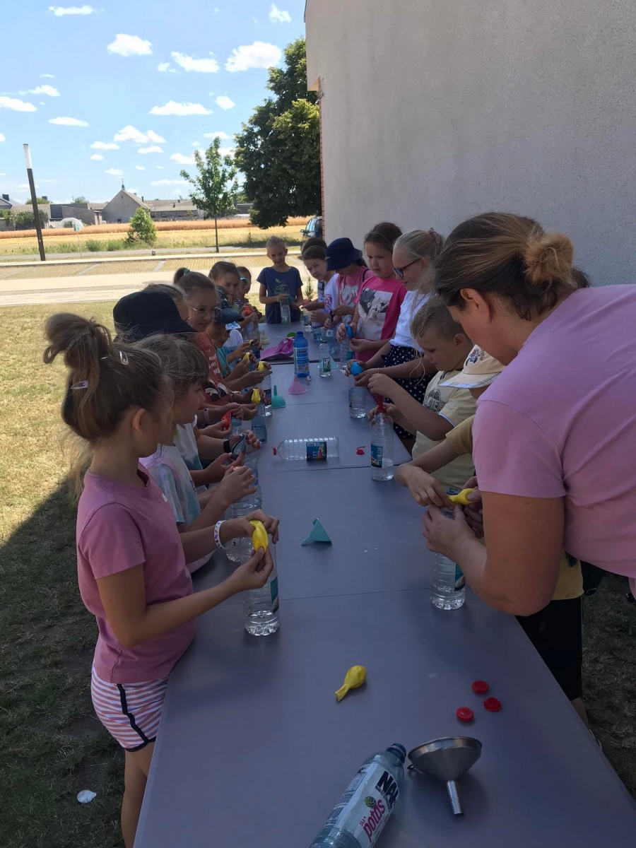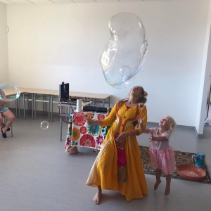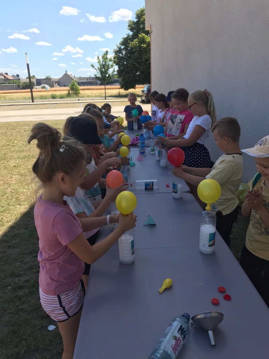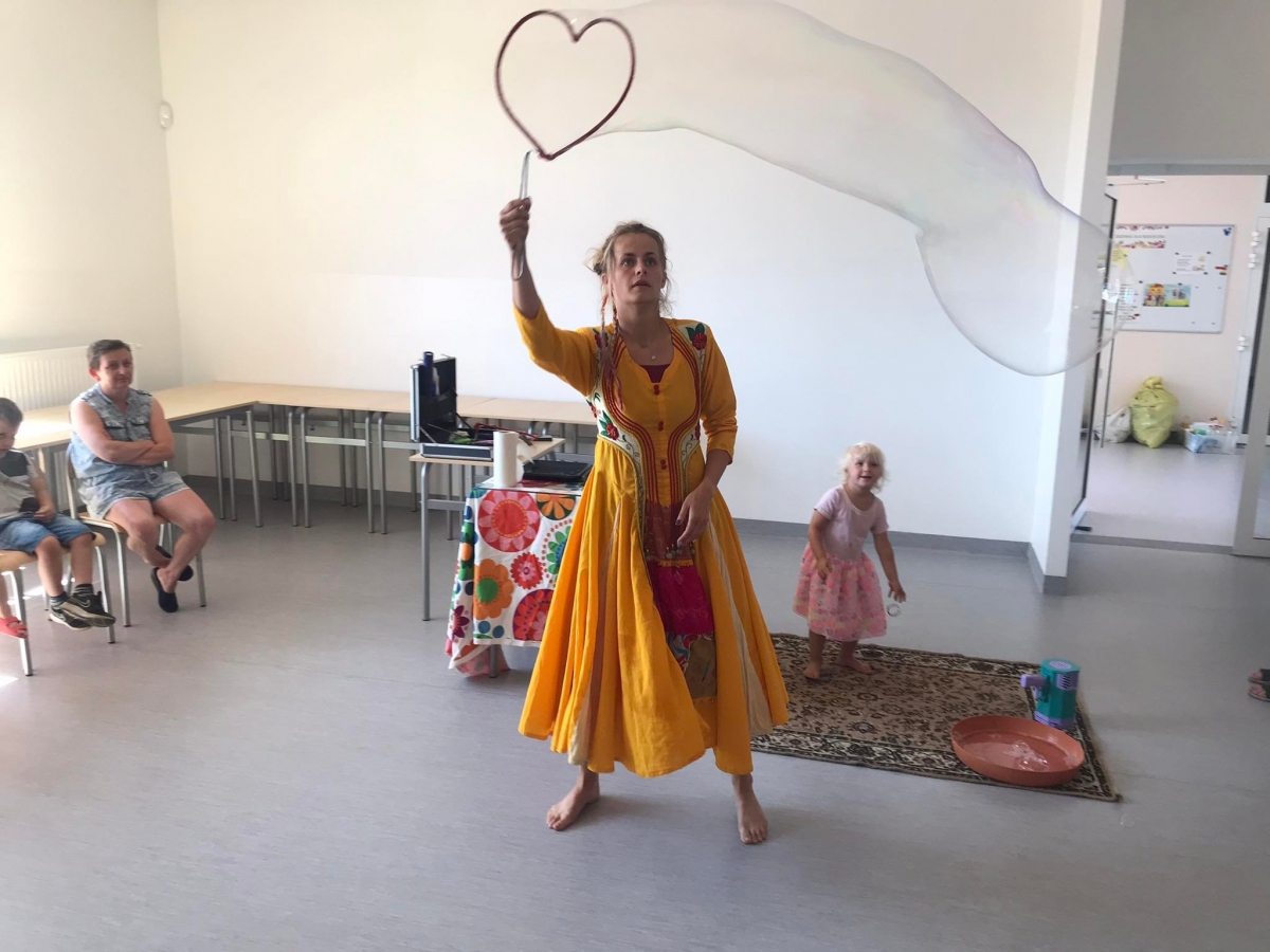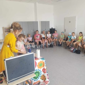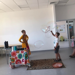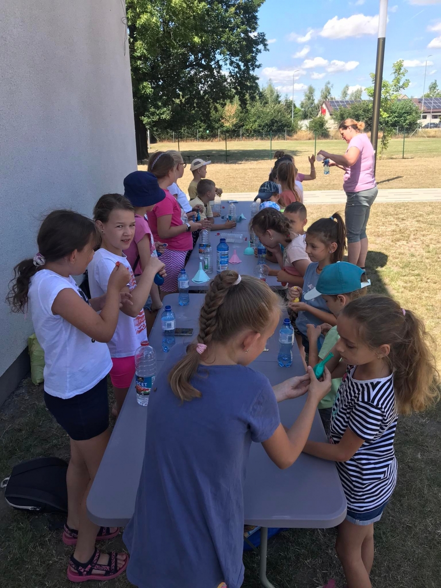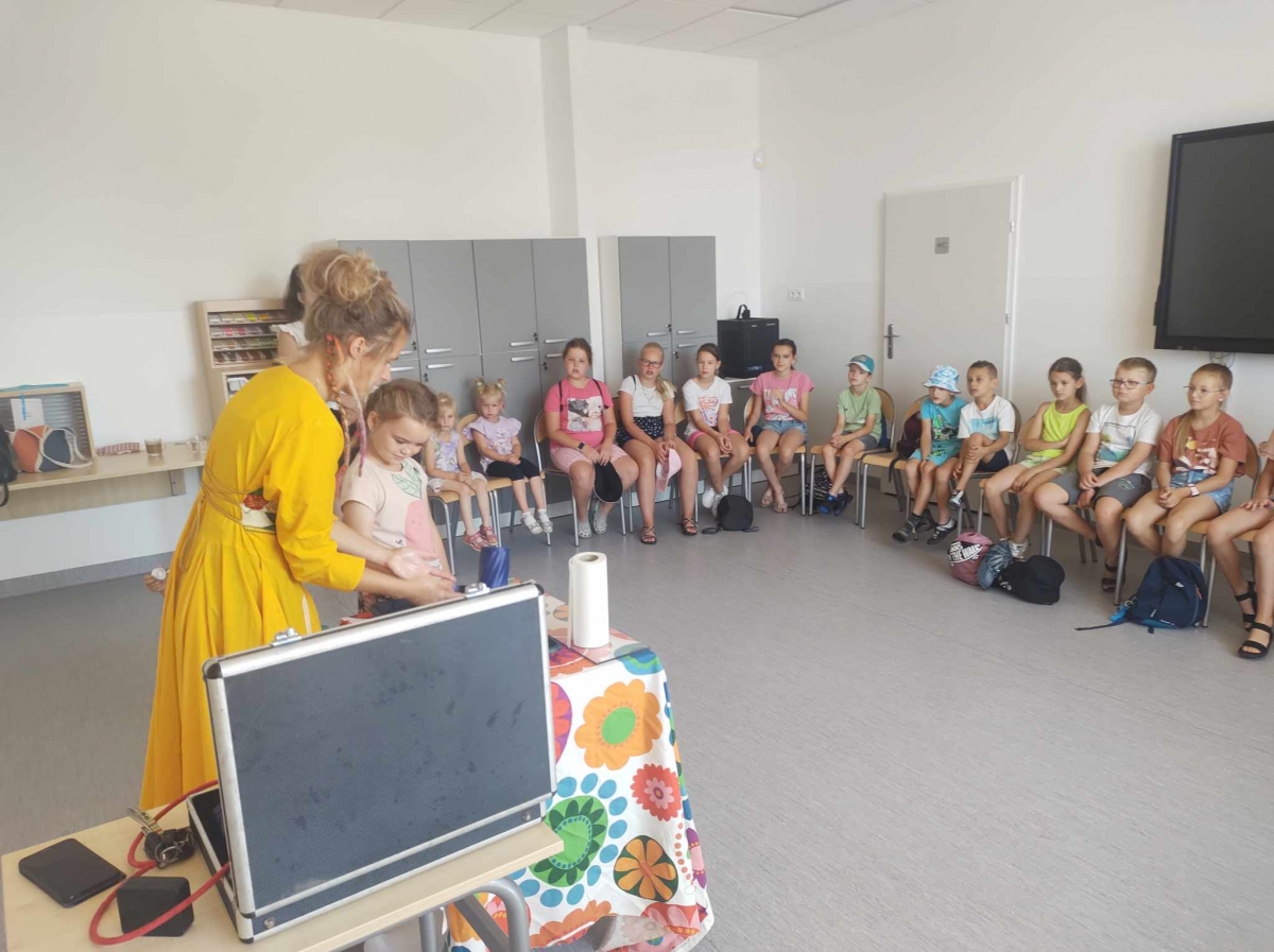 18 lipca 2023 r. Filia Biblioteczna w Smolicach zorganizowała zajęcia dla dzieci w ramach Wakacji z Biblioteką. Dzięki uprzejmości Pani Marleny Kamińskiej działania odbyły się na terenie Przedszkola w Smolicach. Odwiedziła nas niezastąpiona Dorota Jagodzińska DJ – eventy, warsztaty, animacje. Podczas warsztatów z naszym gościem, uczestnicy obejrzeli pokaz baniek mydlanych. Dzieci mogły aktywnie uczestniczyć w ich tworzeniu. Dużym zainteresowaniem cieszyły się bańki posiadające w środku dym. Zebrani chętnie łączyli ze sobą dwie bańki, co okazało się trudnym zadaniem. Warsztaty zakończył pokaz baniek ogniowych, który wywołał okrzyki zachwytu u uczestników.