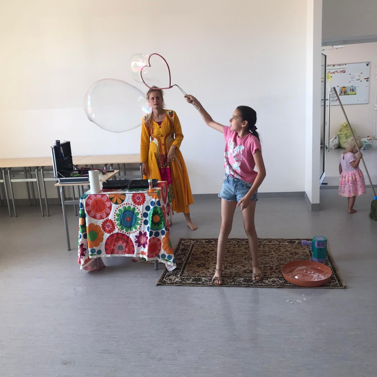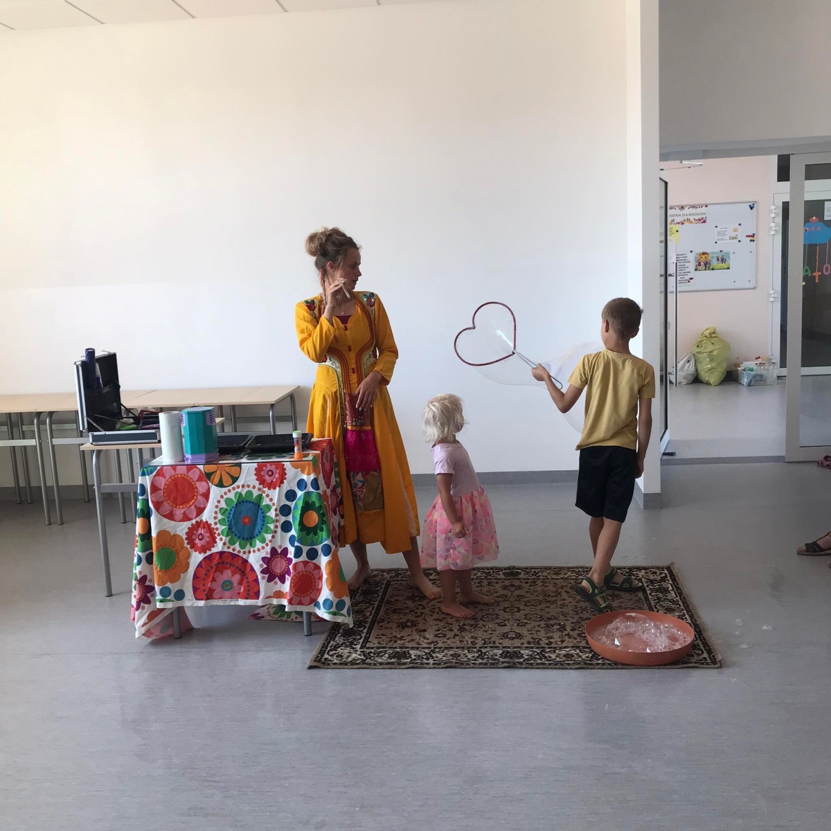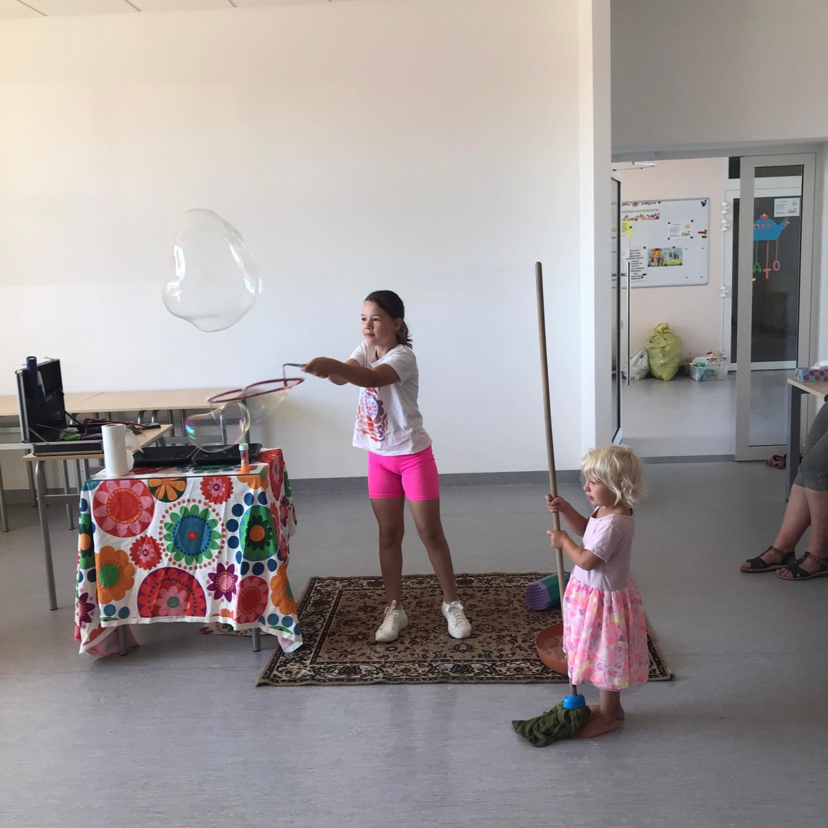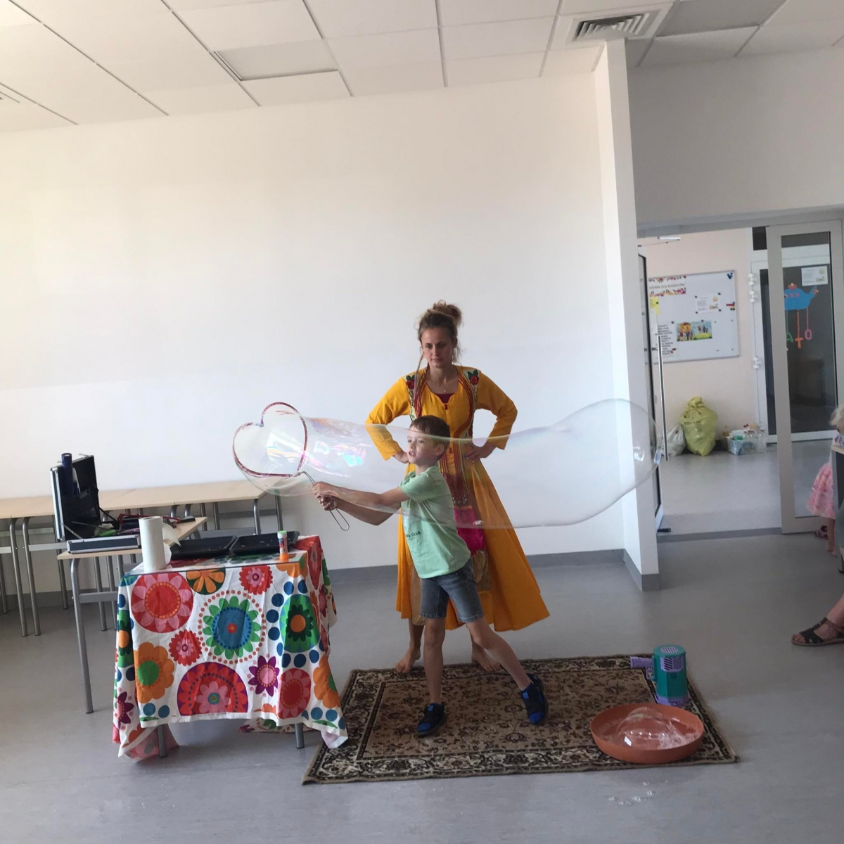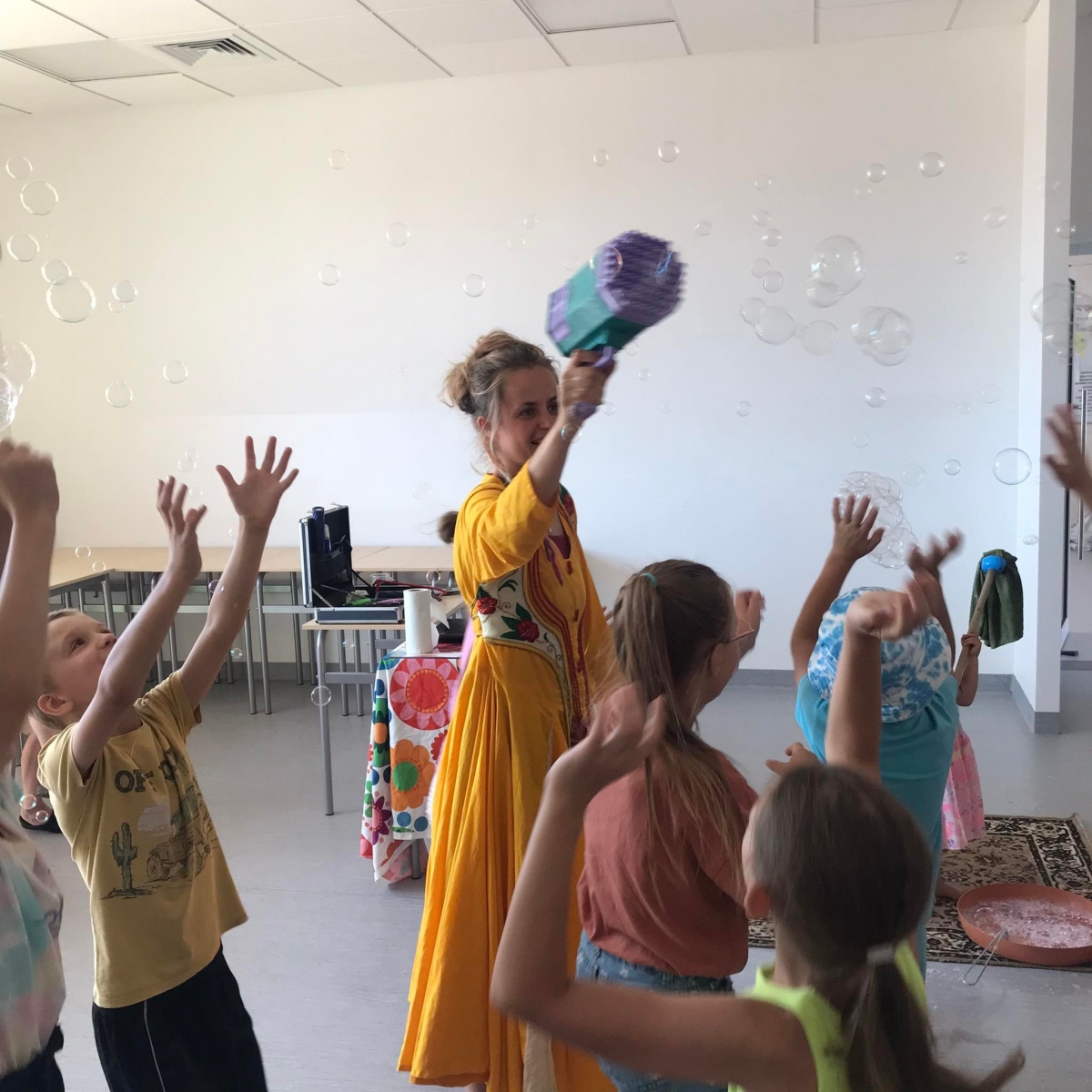 18 lipca 2023 r. Filia Biblioteczna w Smolicach zorganizowała zajęcia dla dzieci w ramach Wakacji z Biblioteką. Dzięki uprzejmości Pani Marleny Kamińskiej działania odbyły się na terenie Przedszkola w Smolicach. Odwiedziła nas niezastąpiona Dorota Jagodzińska DJ – eventy, warsztaty, animacje. Podczas warsztatów z naszym gościem, uczestnicy obejrzeli pokaz baniek mydlanych. Dzieci mogły aktywnie uczestniczyć w ich tworzeniu. Dużym zainteresowaniem cieszyły się bańki posiadające w środku dym. Zebrani chętnie łączyli ze sobą dwie bańki, co okazało się trudnym zadaniem. Warsztaty zakończył pokaz baniek ogniowych, który wywołał okrzyki zachwytu u uczestników.