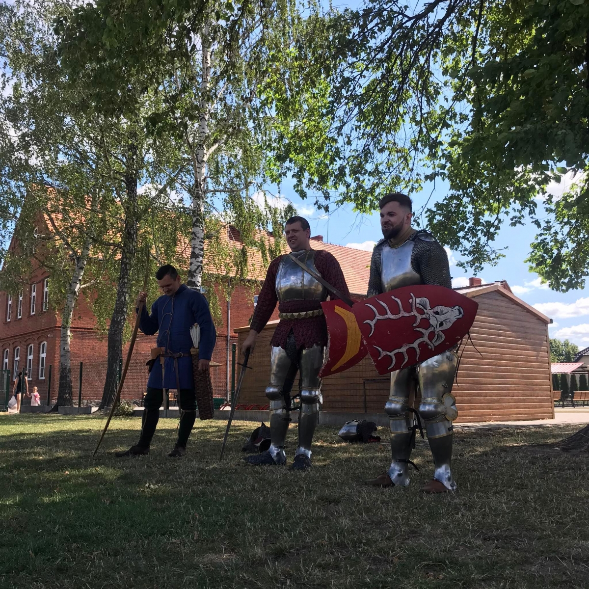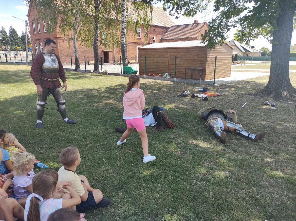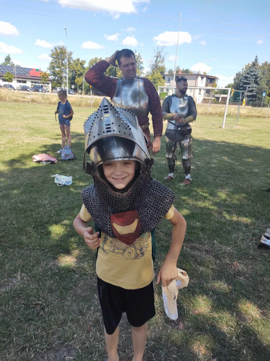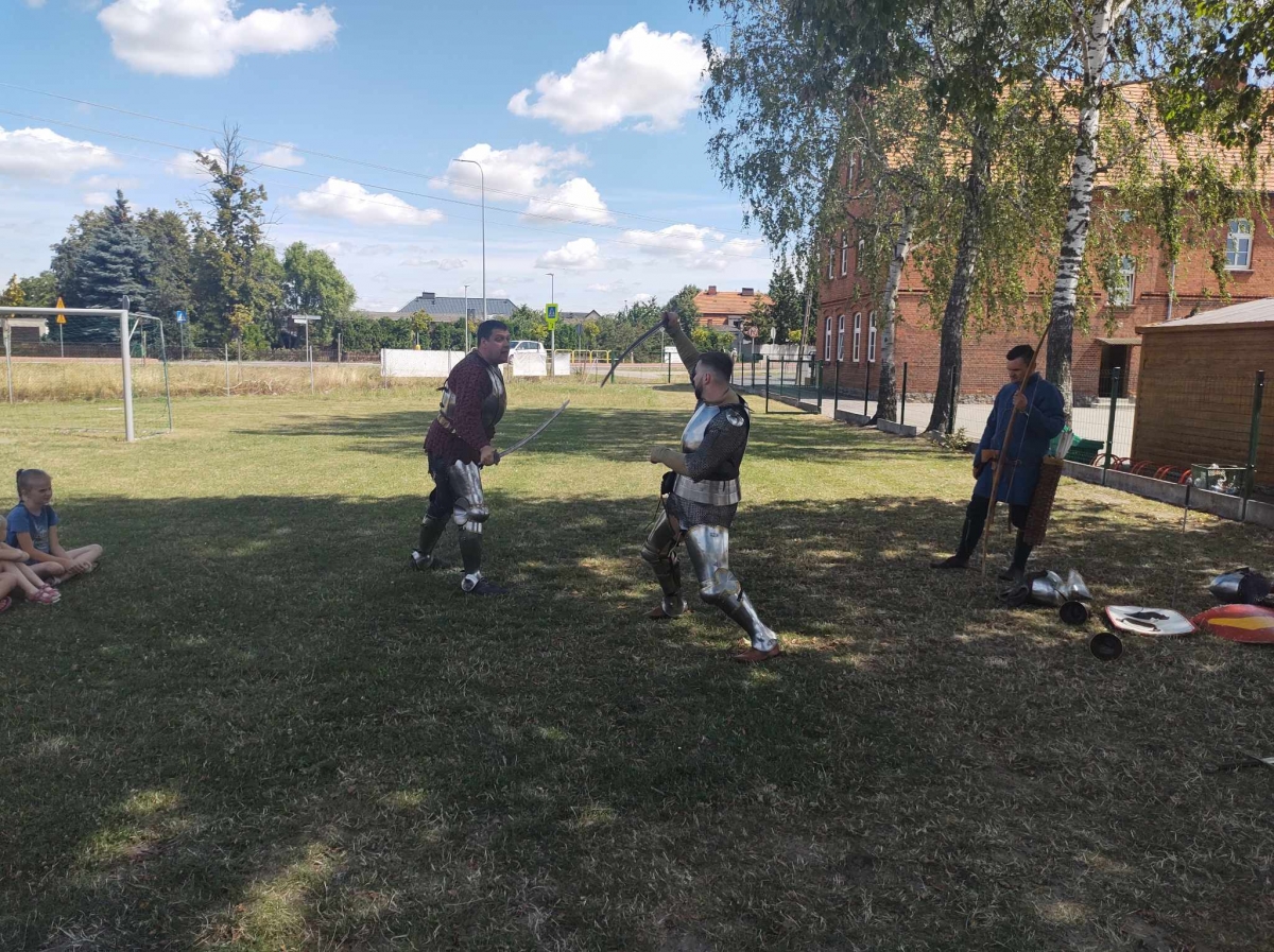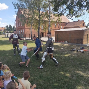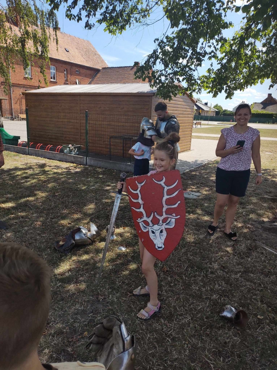 Po spotkaniu z animatorką przyszła pora na przeniesienie się w czasy średniowiecza. Rycerze reprezentujący Poczet Wierzbięty z Krotoszyna pokazali uczestnikom jak kiedyś walczono. Opowiedzieli o swojej broni -mieczach. Zarówno strój jak i broń okazała się bardzo ciężka. Zebrani mogli choć na chwilę wcielić się w rolę rycerzy. Dzieci chętnie przymierzały hełm oraz rękawice niezbędne każdemu rycerzowi. Wielu uczestników odkryło w sobie rycerskiego ducha.
