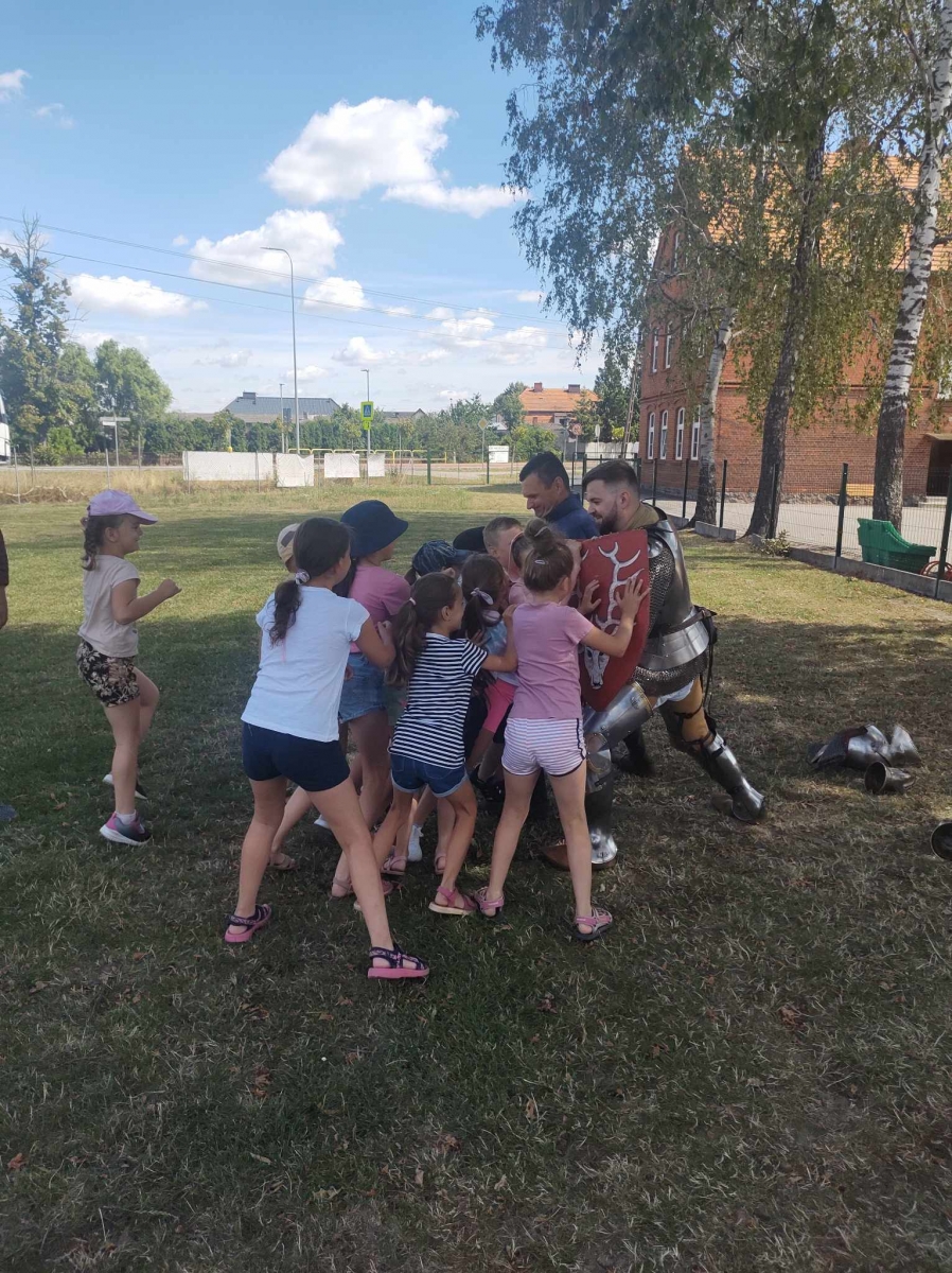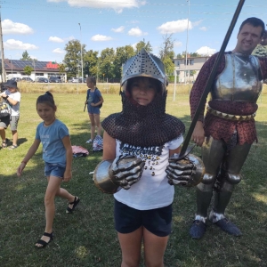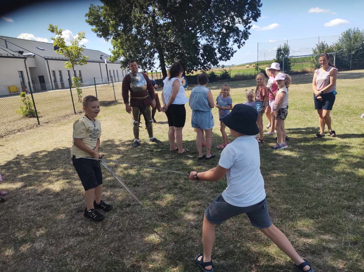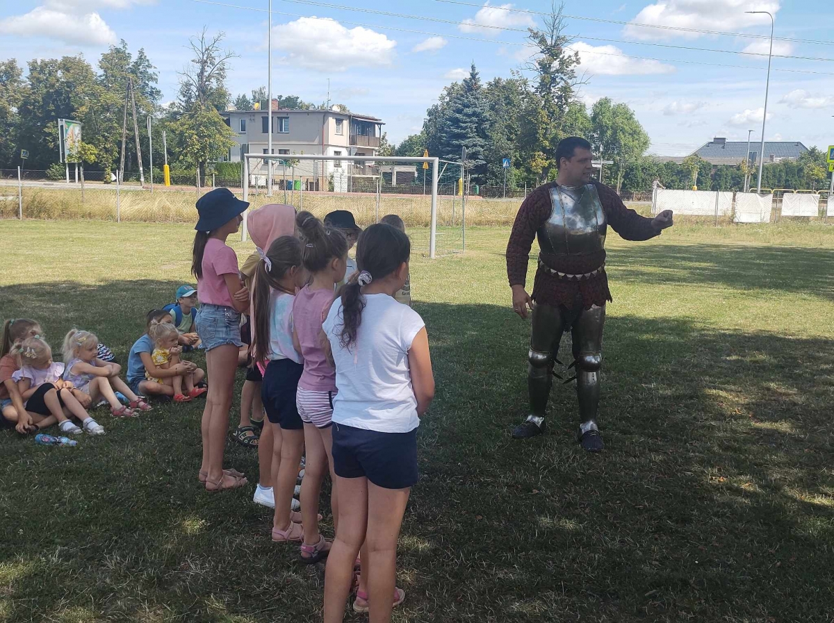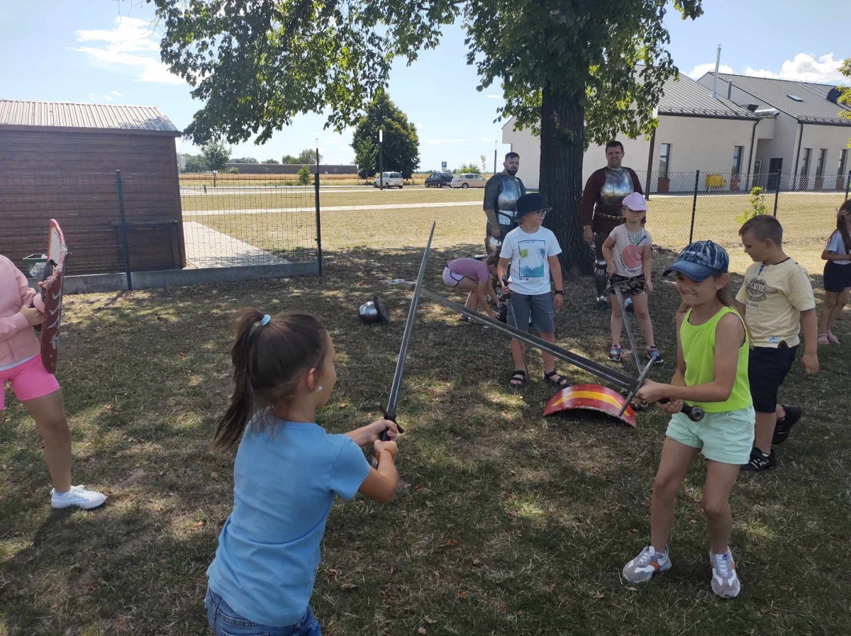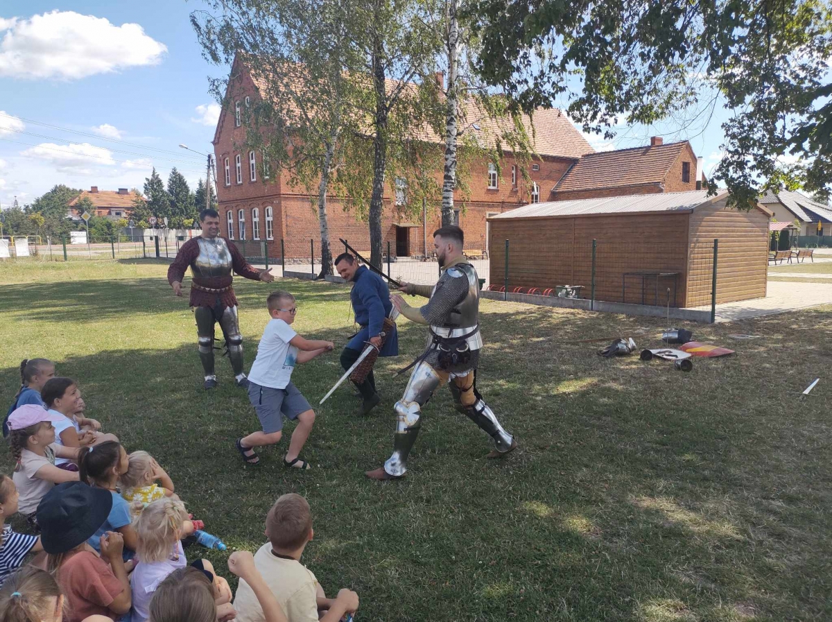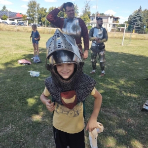 Po spotkaniu z animatorką przyszła pora na przeniesienie się w czasy średniowiecza. Rycerze reprezentujący Poczet Wierzbięty z Krotoszyna pokazali uczestnikom jak kiedyś walczono. Opowiedzieli o swojej broni -mieczach. Zarówno strój jak i broń okazała się bardzo ciężka. Zebrani mogli choć na chwilę wcielić się w rolę rycerzy. Dzieci chętnie przymierzały hełm oraz rękawice niezbędne każdemu rycerzowi. Wielu uczestników odkryło w sobie rycerskiego ducha.
