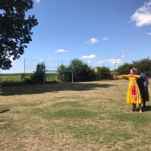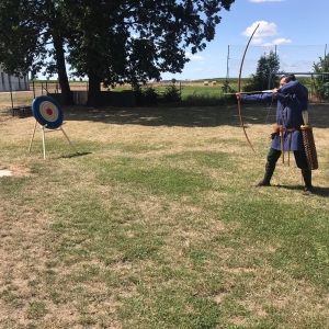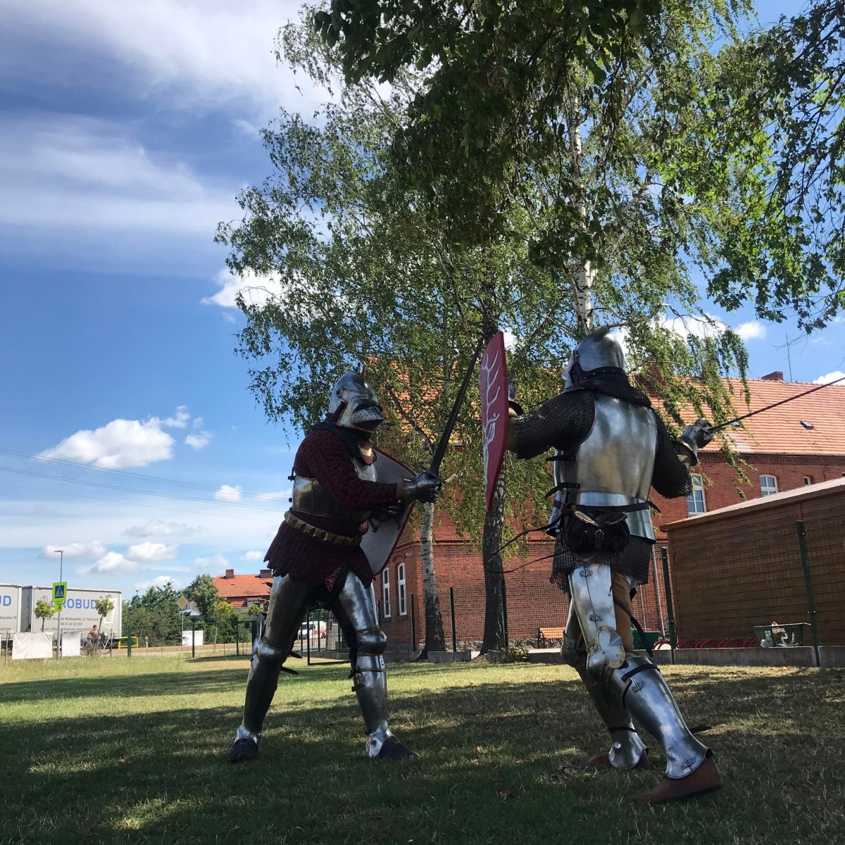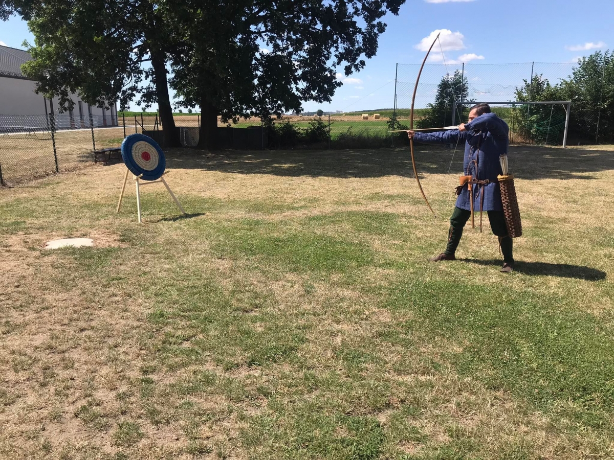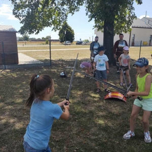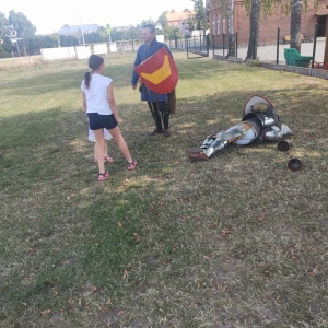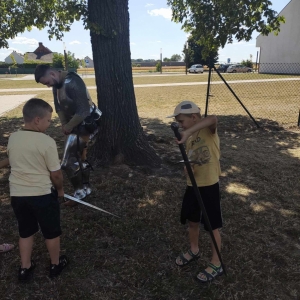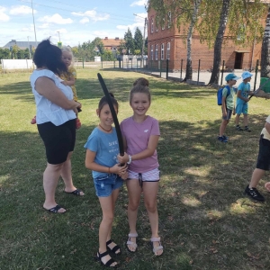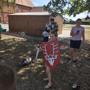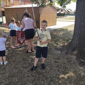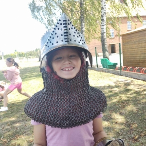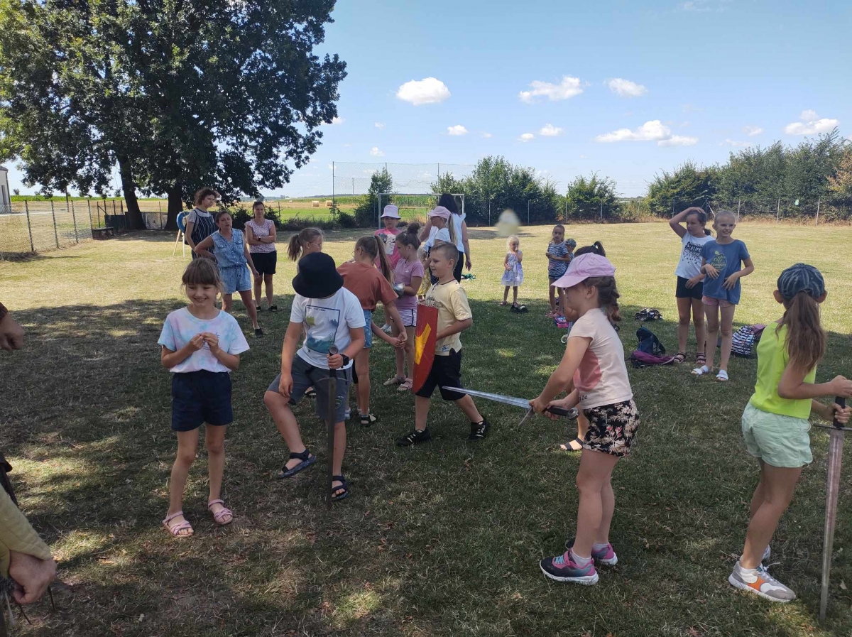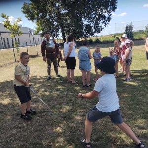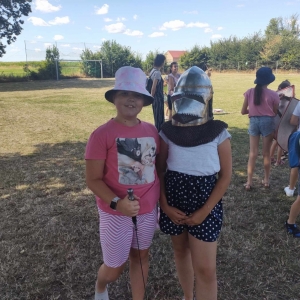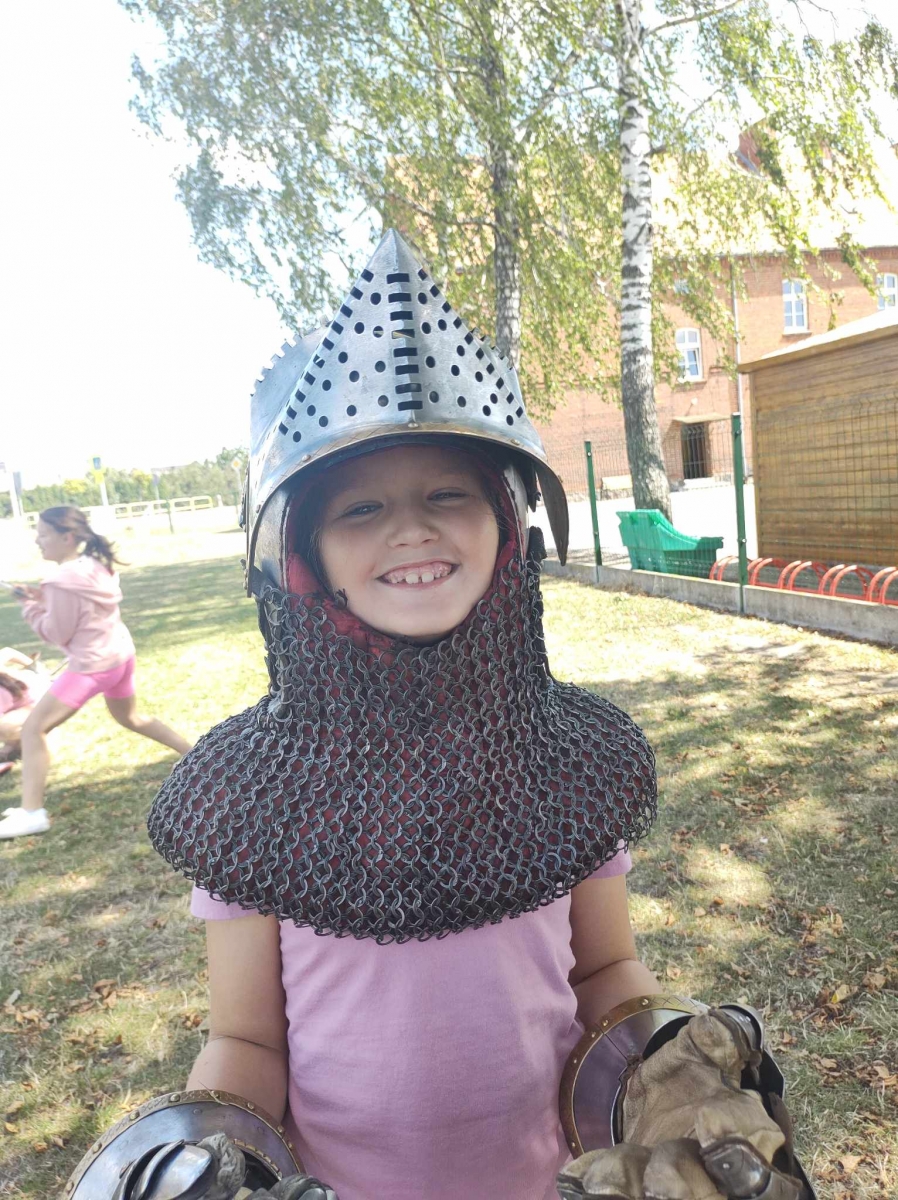Po spotkaniu z animatorką przyszła pora na przeniesienie się w czasy średniowiecza. Rycerze reprezentujący Poczet Wierzbięty z Krotoszyna pokazali uczestnikom jak kiedyś walczono. Opowiedzieli o swojej broni -mieczach. Zarówno strój jak i broń okazała się bardzo ciężka. Zebrani mogli choć na chwilę wcielić się w rolę rycerzy. Dzieci chętnie przymierzały hełm oraz rękawice niezbędne każdemu rycerzowi. Wielu uczestników odkryło w sobie rycerskiego ducha.