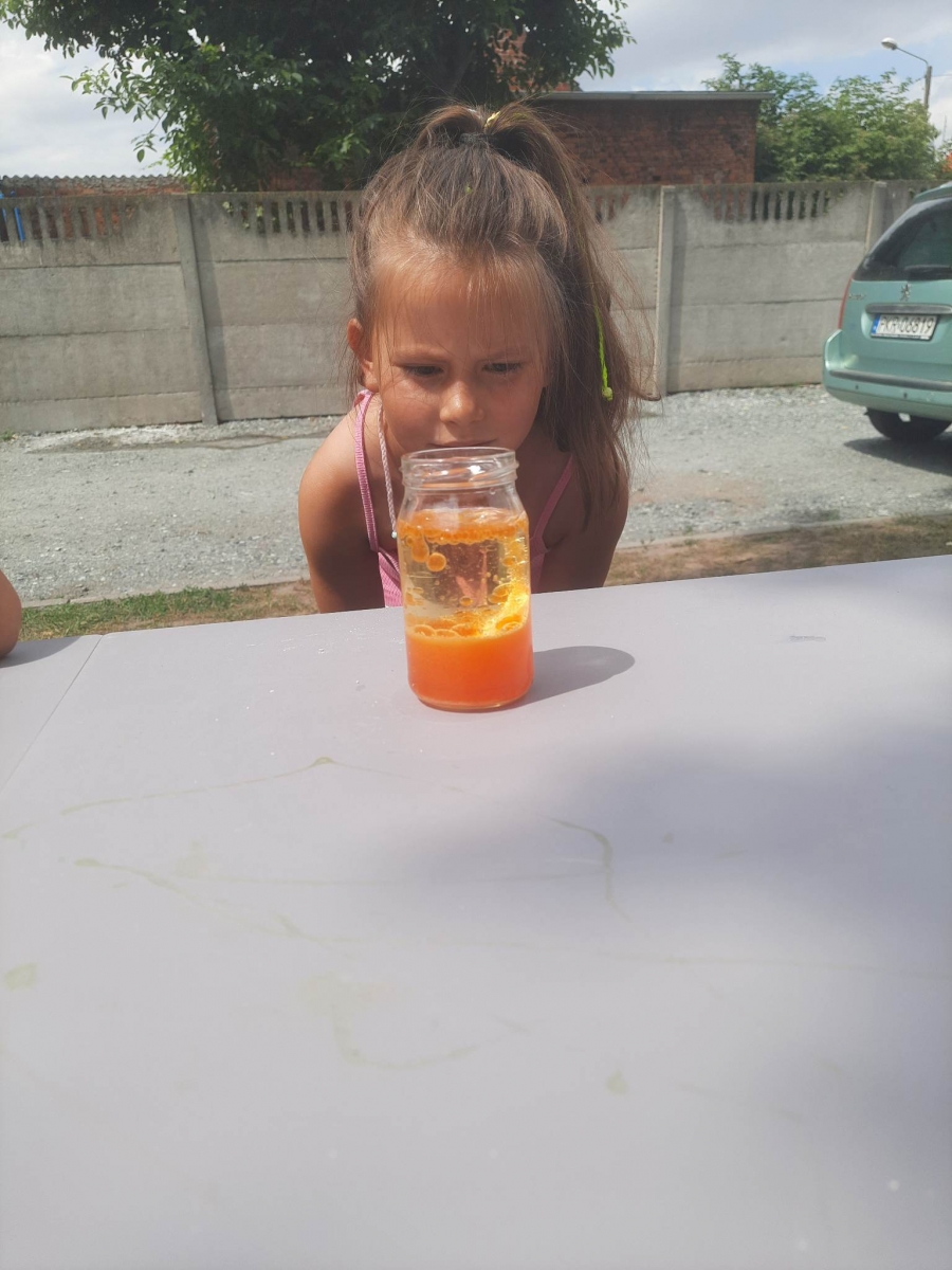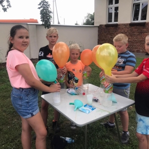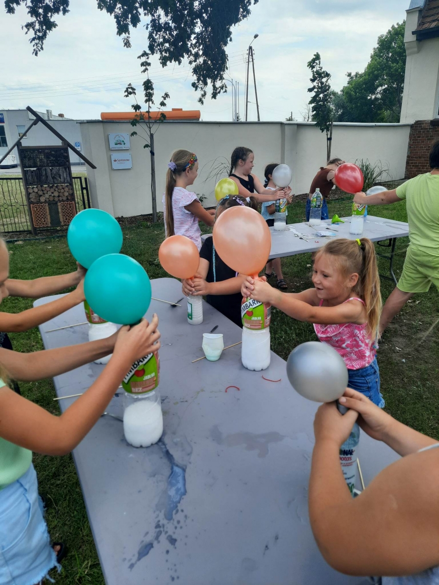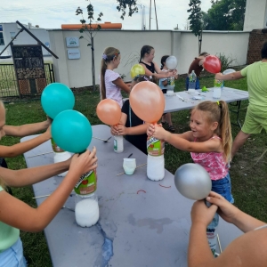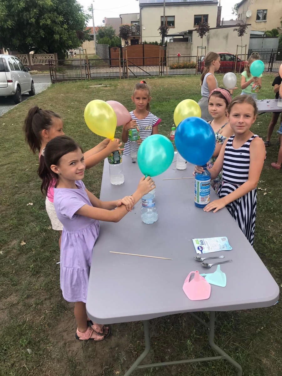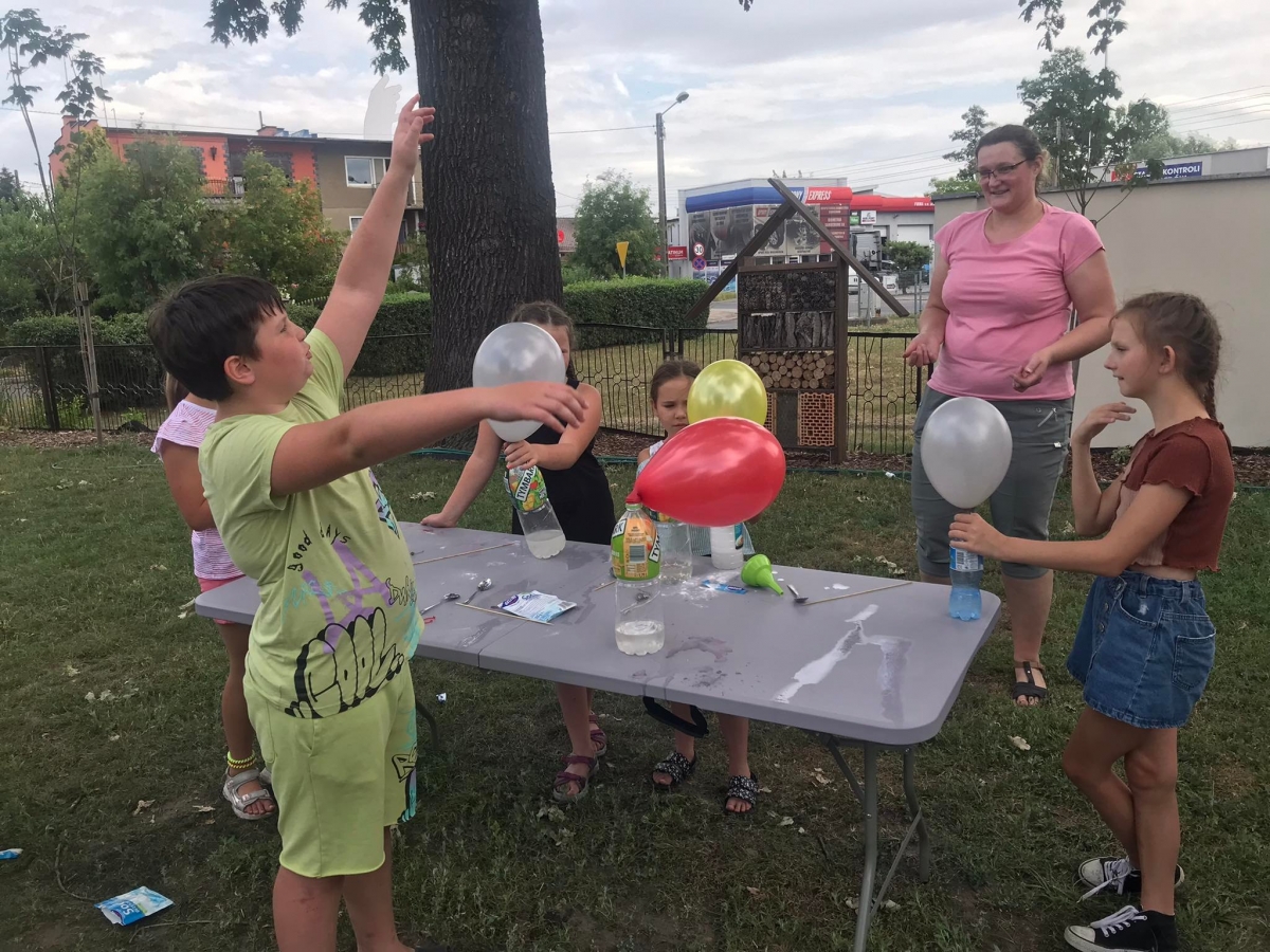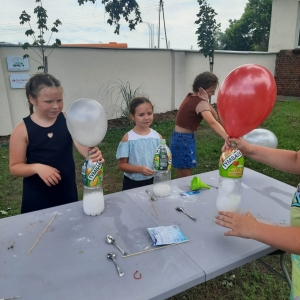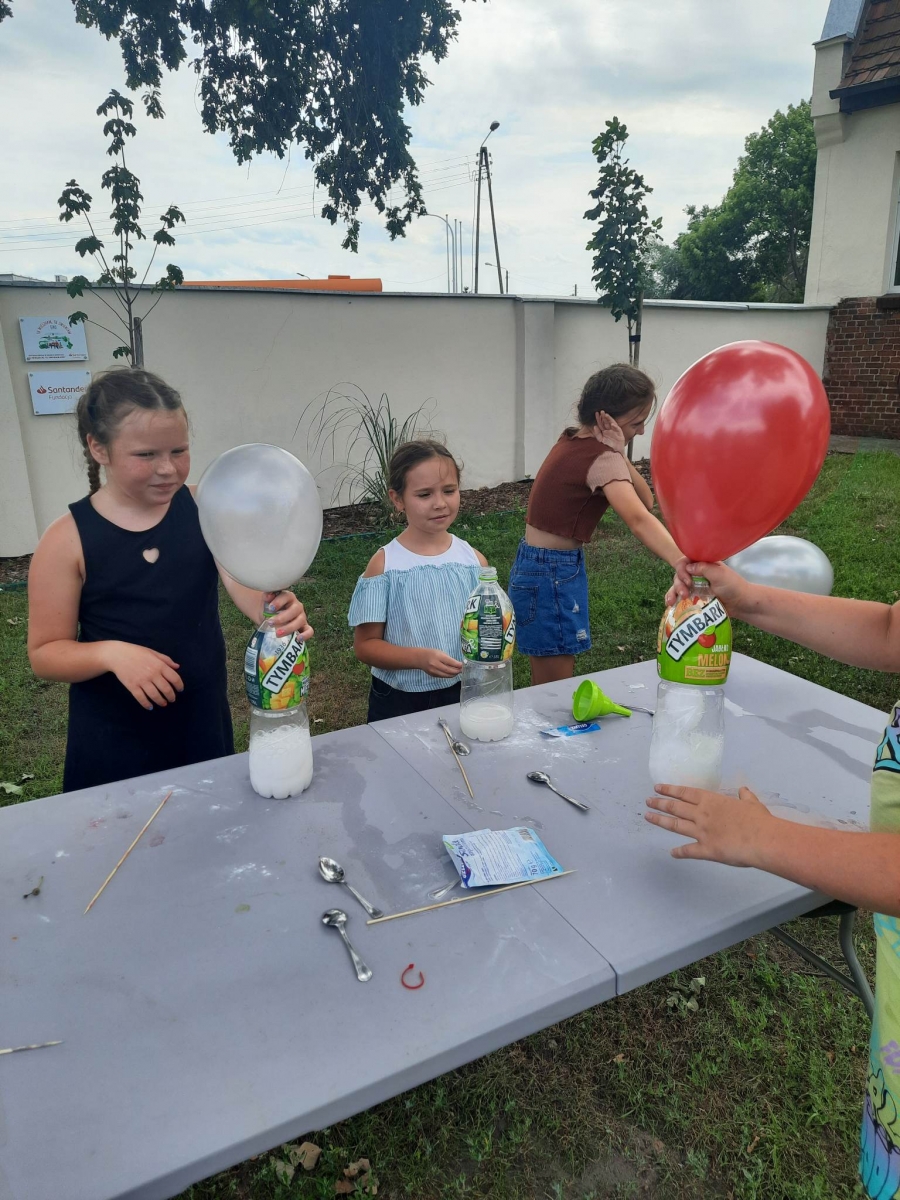 Kolejną część poniedziałkowych Wakacji z Biblioteką spędziliśmy przy eksperymentach. Z dostępnych w każdym domu produktów spożywczych tworzyliśmy wulkany, słoiki pełne magii. Dzięki zachodzącym reakcjom chemicznym nauczyliśmy się jak w prosty sposób można nadmuchać balony.