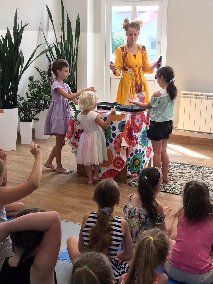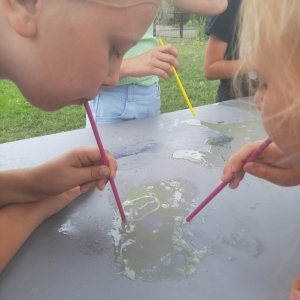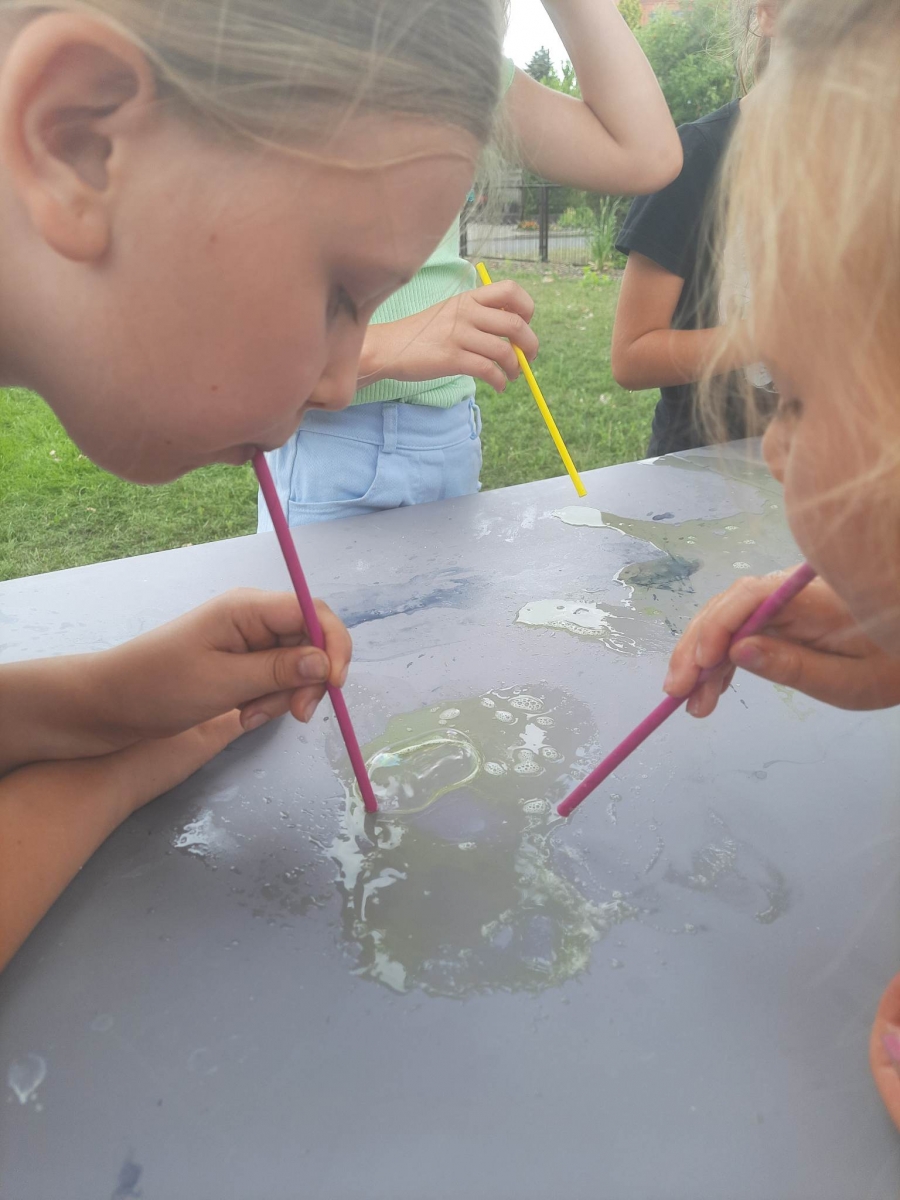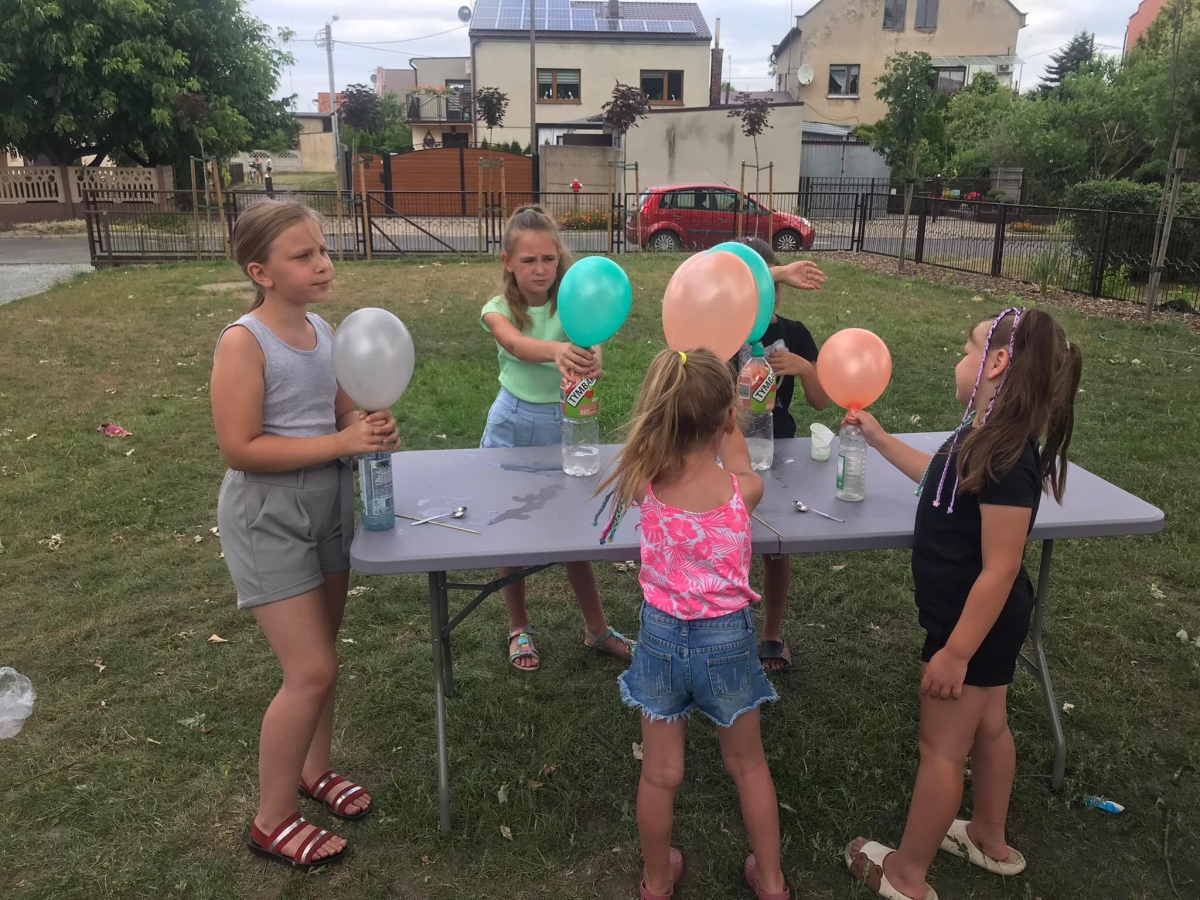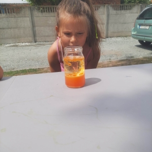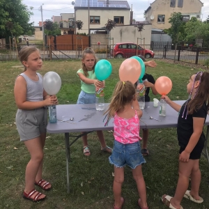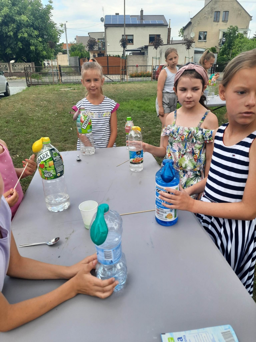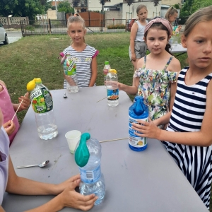 Kolejną część poniedziałkowych Wakacji z Biblioteką spędziliśmy przy eksperymentach. Z dostępnych w każdym domu produktów spożywczych tworzyliśmy wulkany, słoiki pełne magii. Dzięki zachodzącym reakcjom chemicznym nauczyliśmy się jak w prosty sposób można nadmuchać balony.