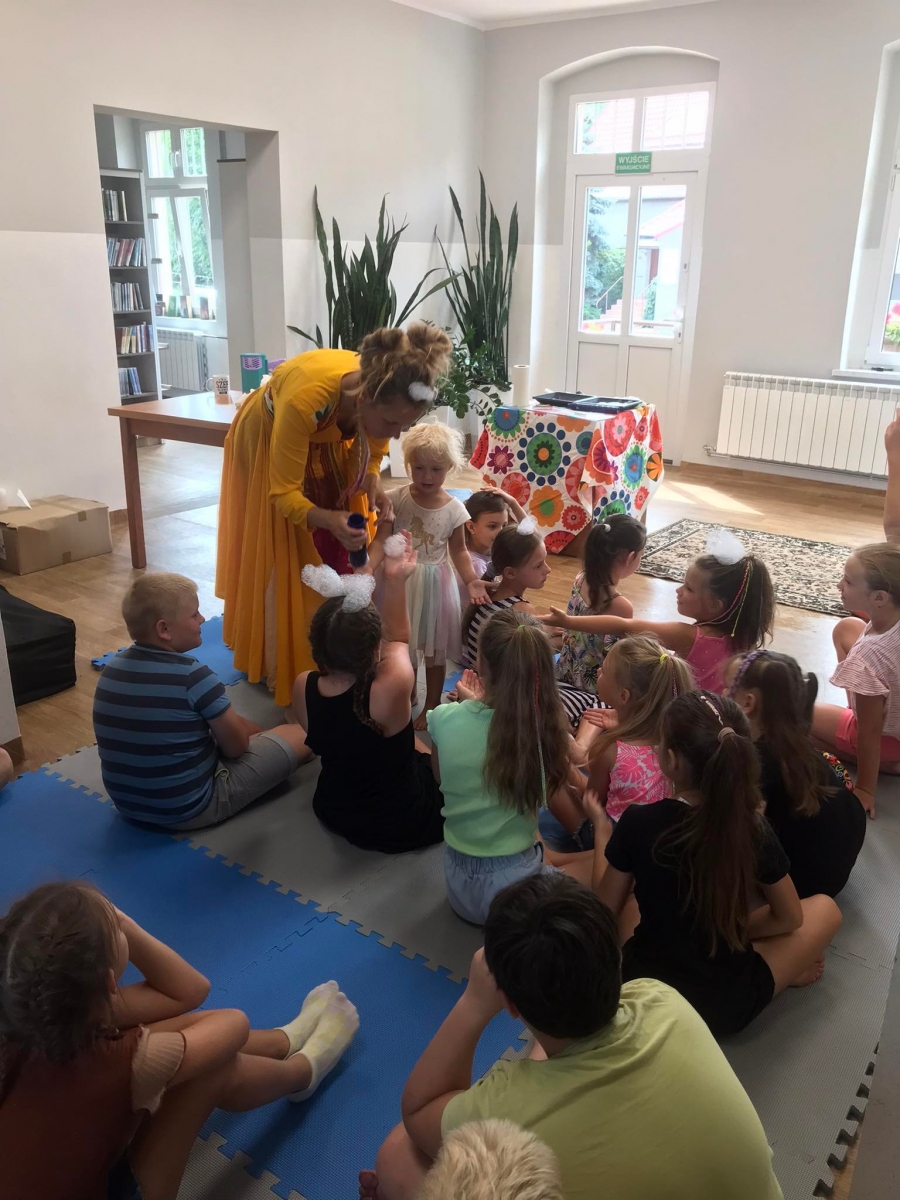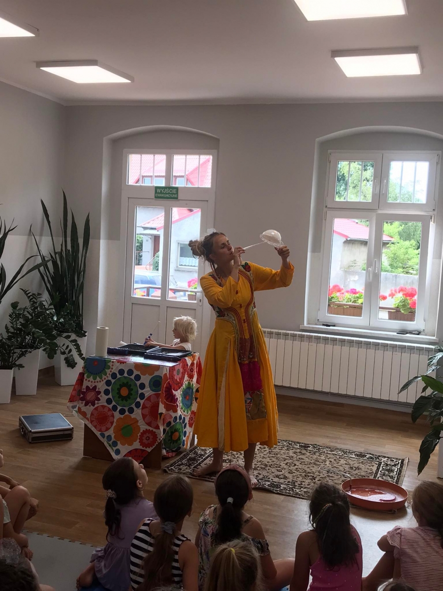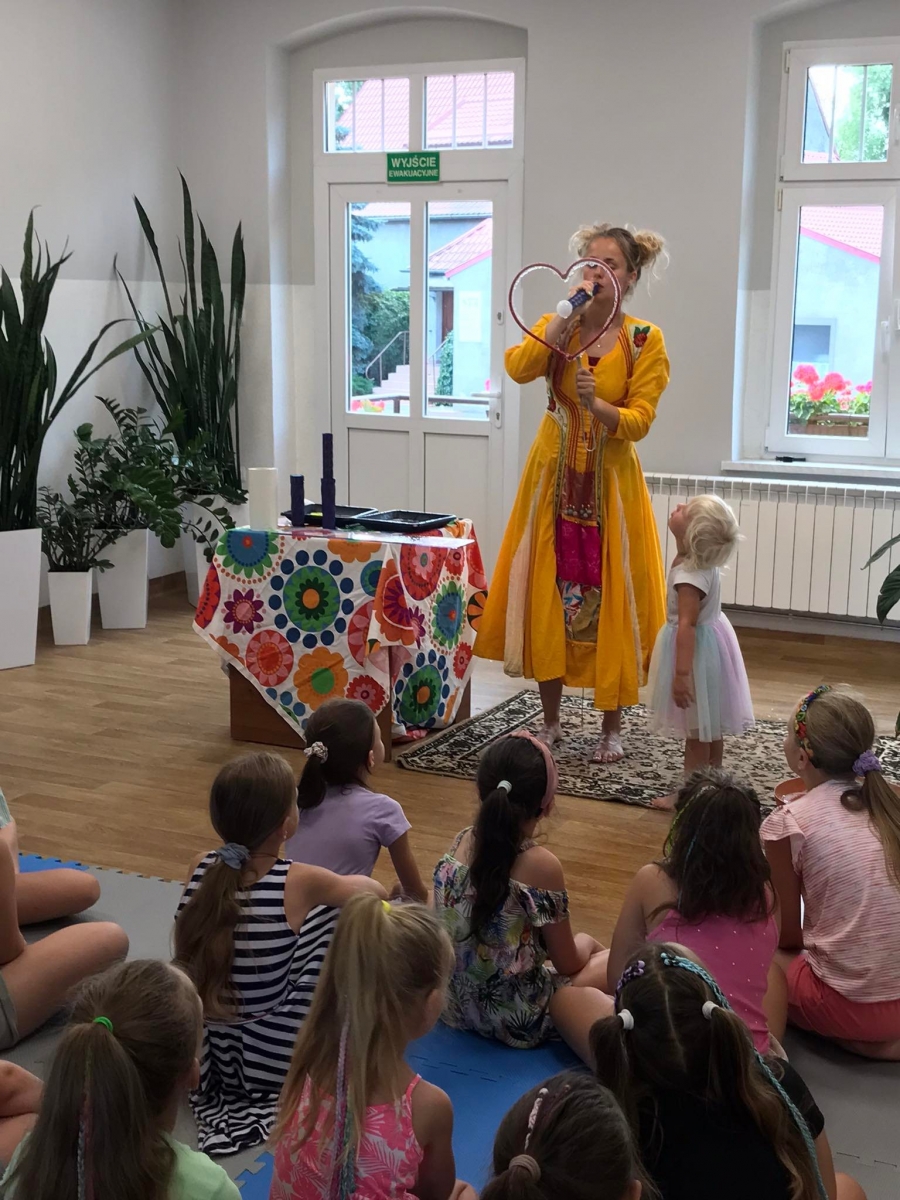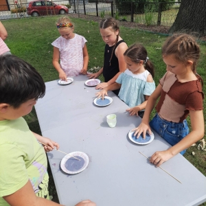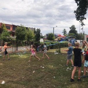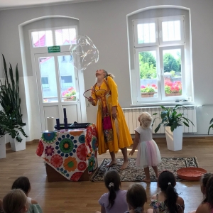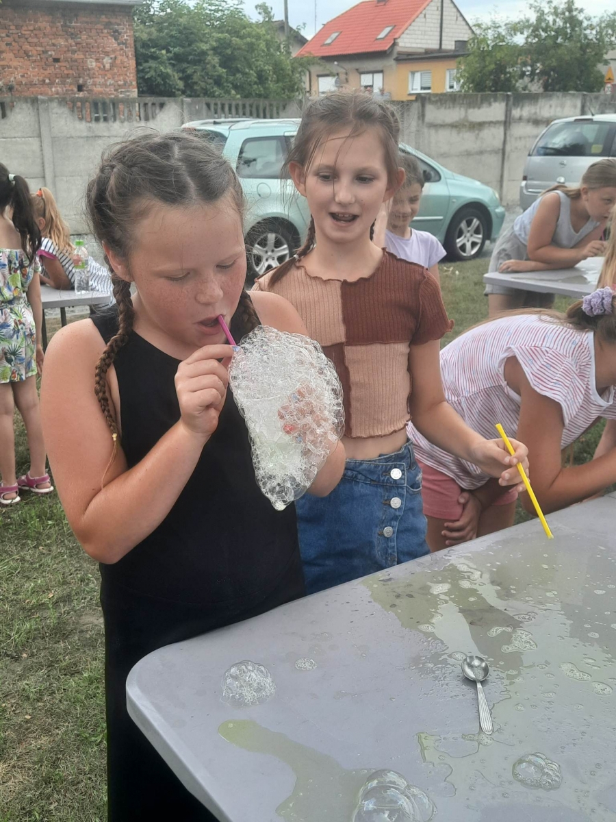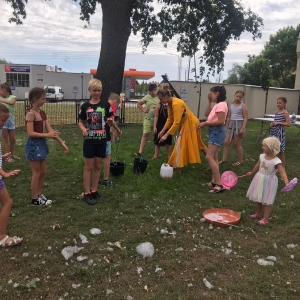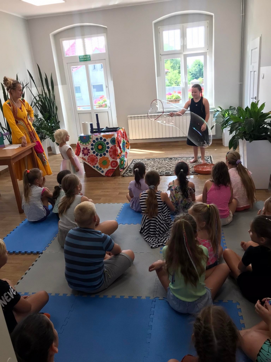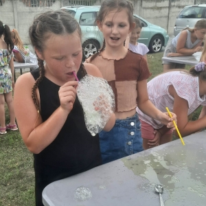 W poniedziałek 17 lipca w kobylińskiej Bibliotece przywitała nas znajoma Dorota Jagodzińska DJ – eventy, warsztaty, animacje. Mieliśmy przyjemność uczestniczyć w bańkowych warsztatach. Wspólnie z Dorotą tworzyliśmy różnego rodzaju bańki mydlane. Powstawały tradycyjne bańki, które każdy z nas zna, ale i takie, które miały w środku dym. Największą furorę wywołały płonące bańki mydlane. Okazało się, że wśród nas jest wielu zdolnych, młodych animatorów kultury.