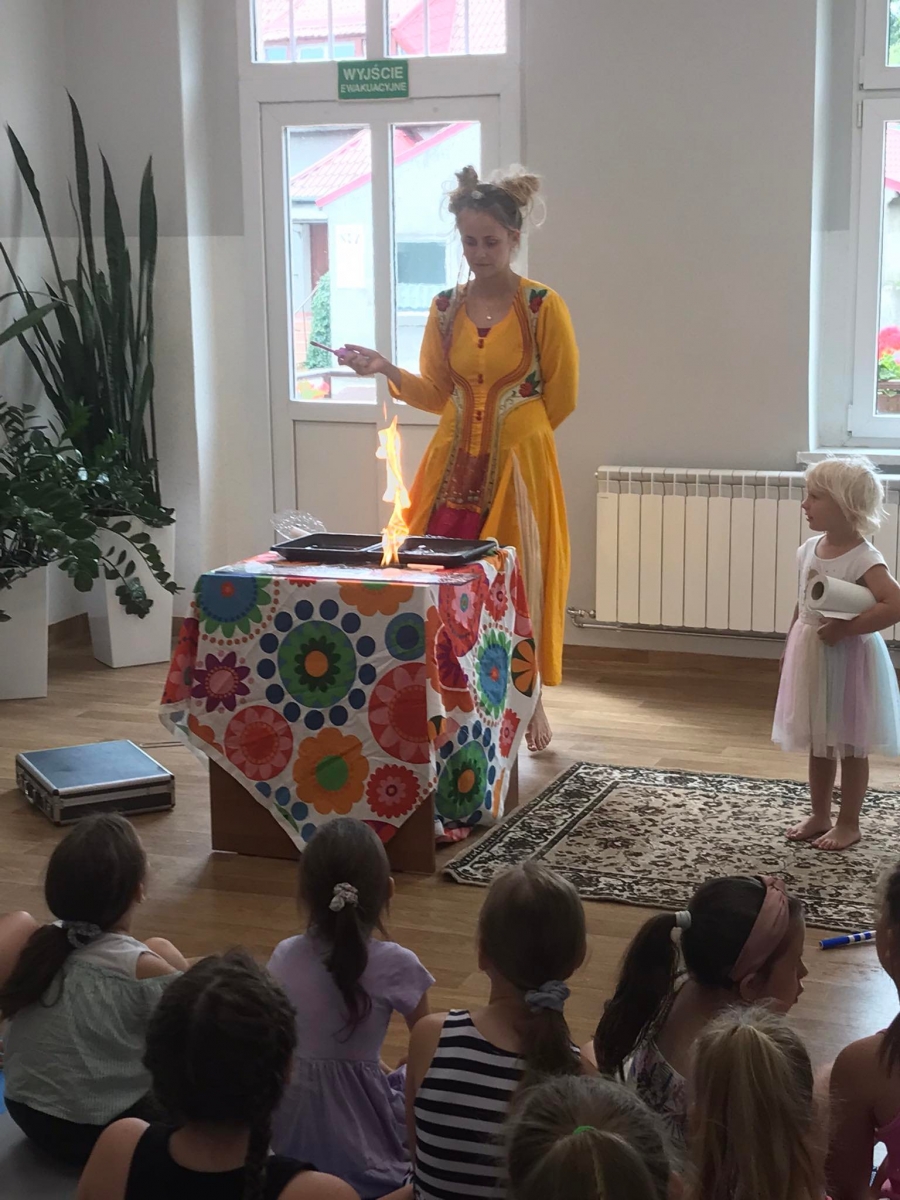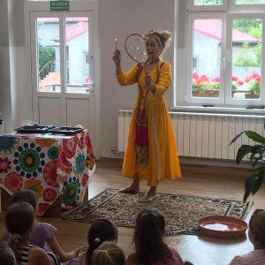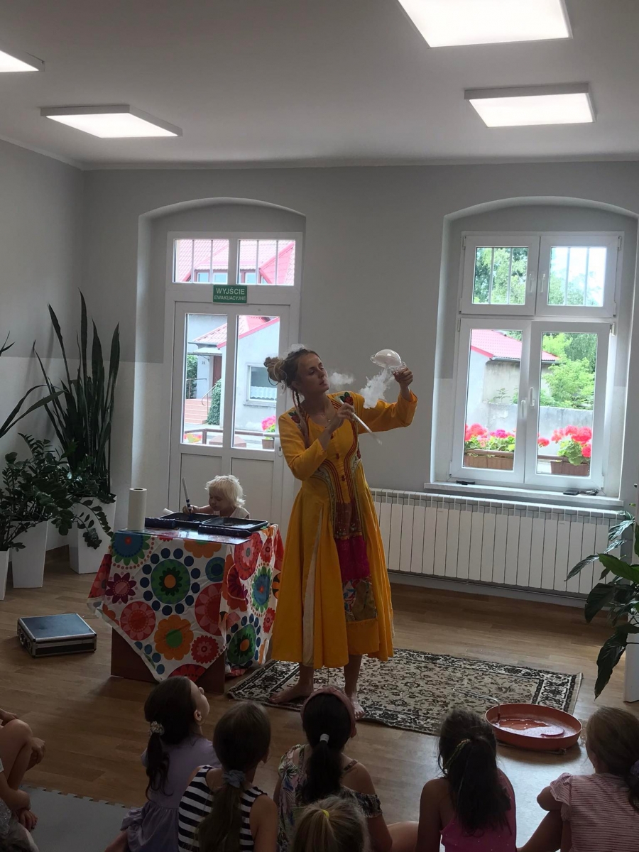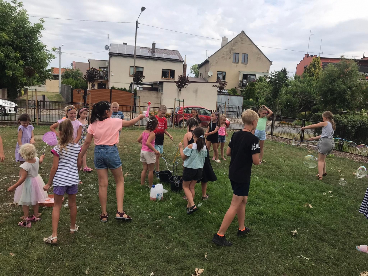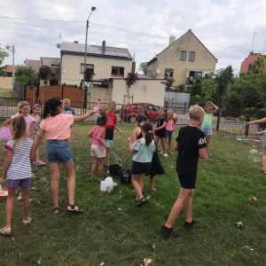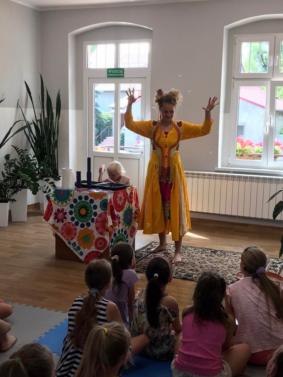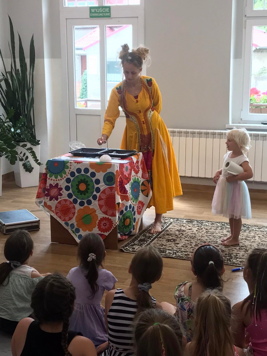 W poniedziałek 17 lipca w kobylińskiej Bibliotece przywitała nas znajoma Dorota Jagodzińska DJ – eventy, warsztaty, animacje. Mieliśmy przyjemność uczestniczyć w bańkowych warsztatach. Wspólnie z Dorotą tworzyliśmy różnego rodzaju bańki mydlane. Powstawały tradycyjne bańki, które każdy z nas zna, ale i takie, które miały w środku dym. Największą furorę wywołały płonące bańki mydlane. Okazało się, że wśród nas jest wielu zdolnych, młodych animatorów kultury.