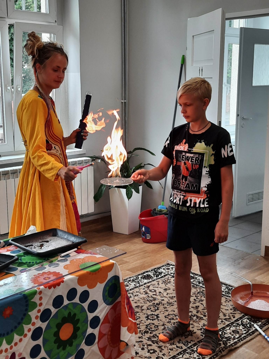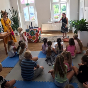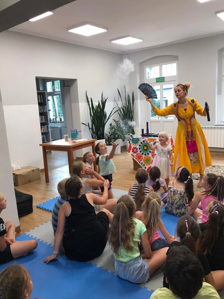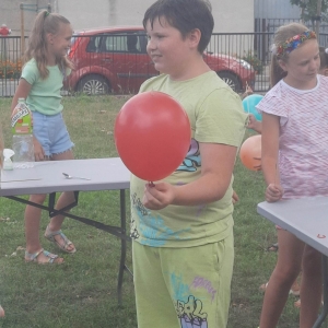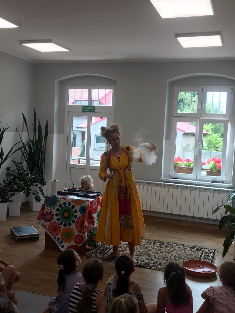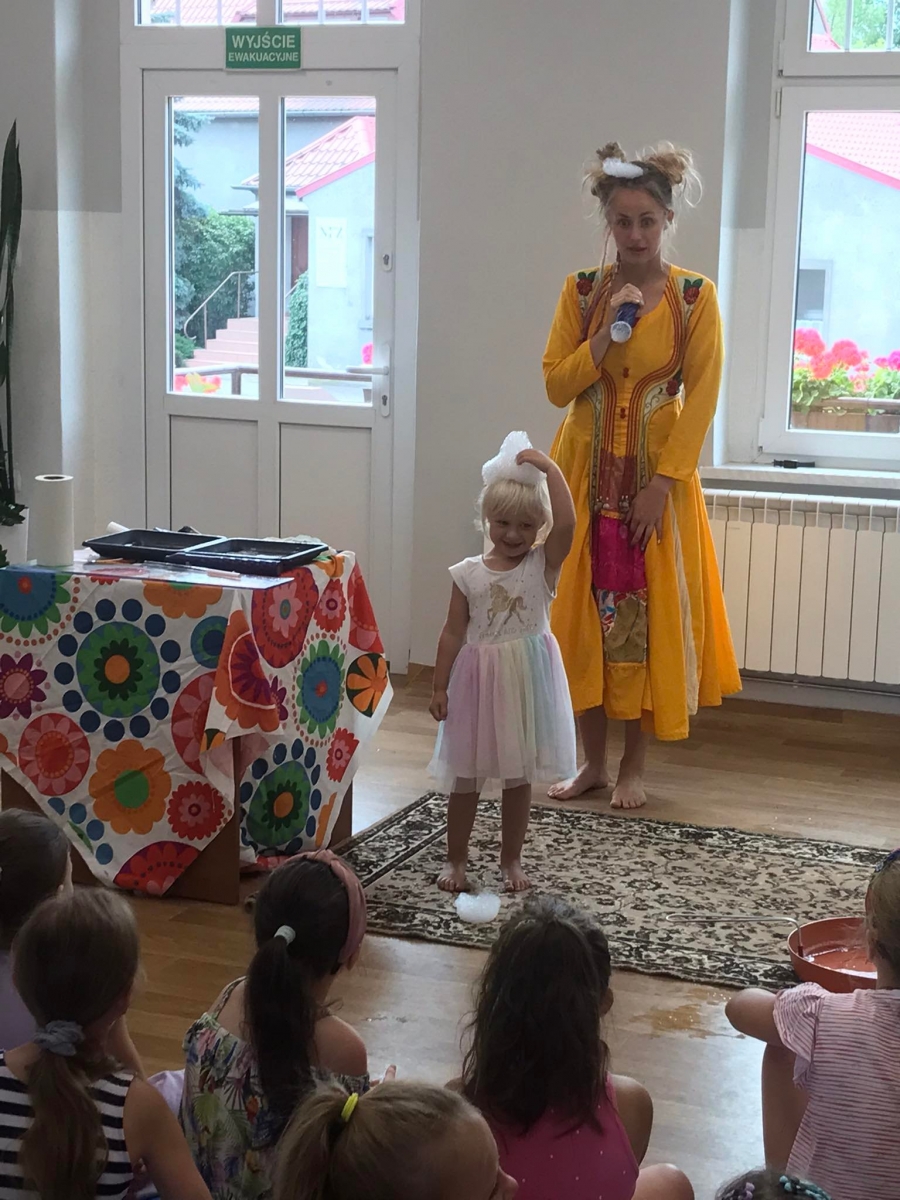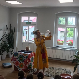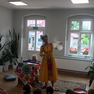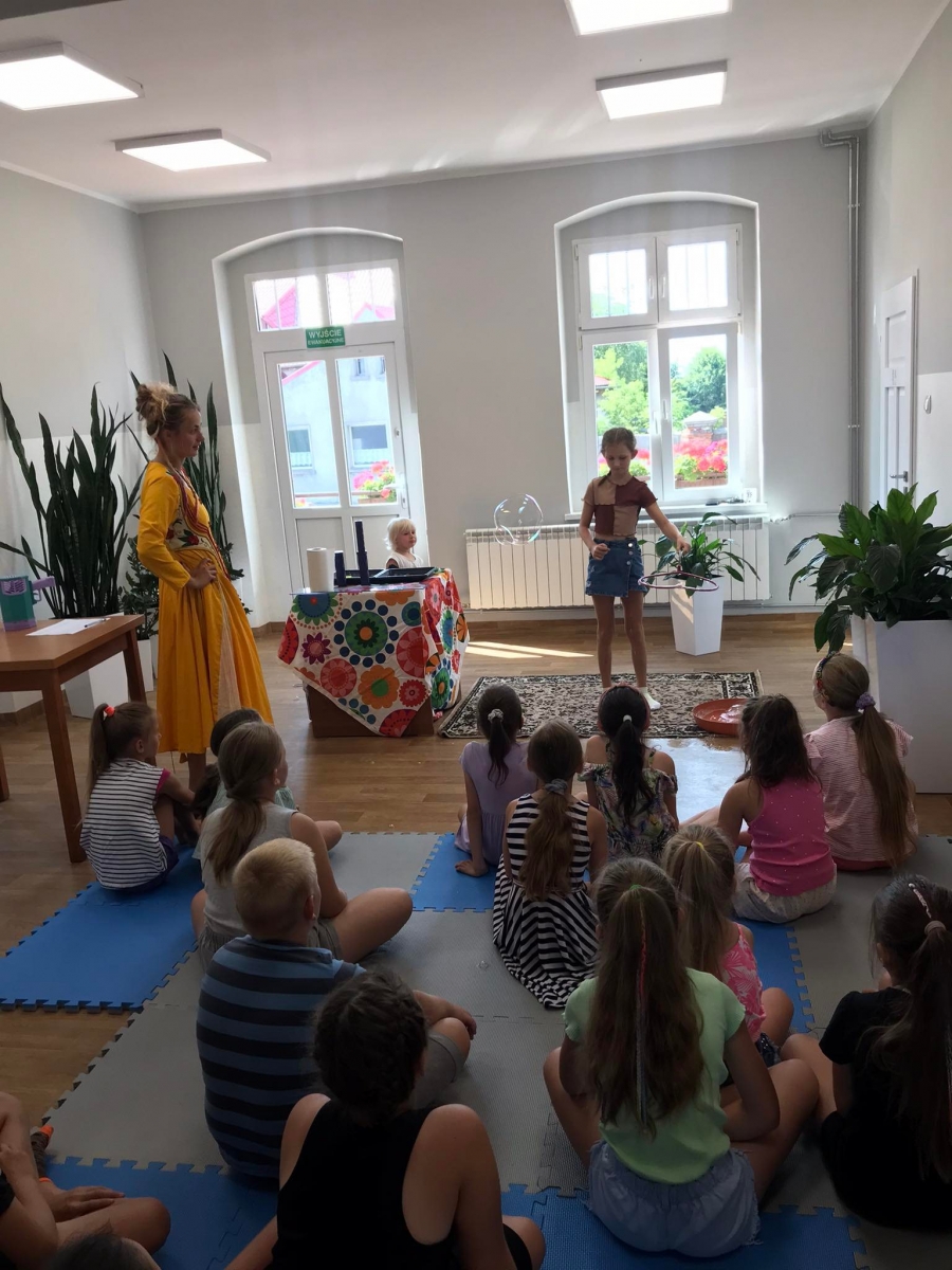W poniedziałek 17 lipca w kobylińskiej Bibliotece przywitała nas znajoma Dorota Jagodzińska DJ – eventy, warsztaty, animacje. Mieliśmy przyjemność uczestniczyć w bańkowych warsztatach. Wspólnie z Dorotą tworzyliśmy różnego rodzaju bańki mydlane. Powstawały tradycyjne bańki, które każdy z nas zna, ale i takie, które miały w środku dym. Największą furorę wywołały płonące bańki mydlane. Okazało się, że wśród nas jest wielu zdolnych, młodych animatorów kultury.