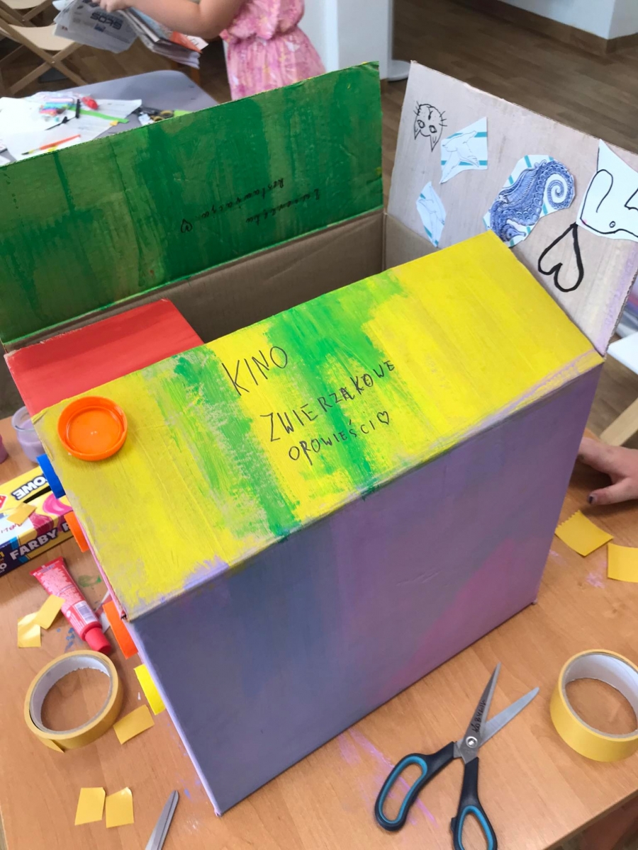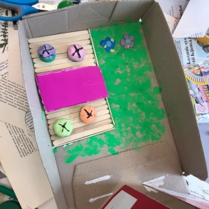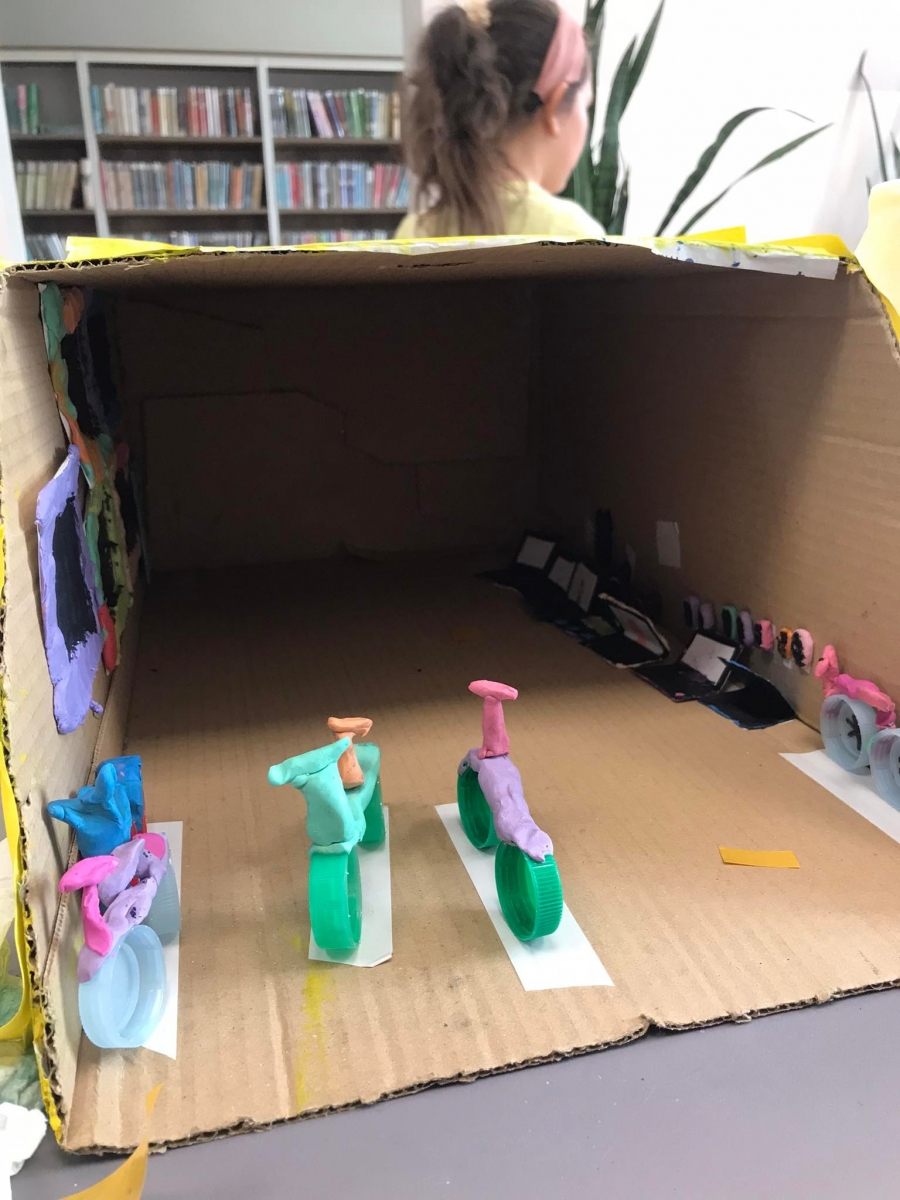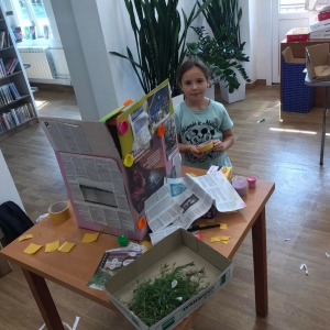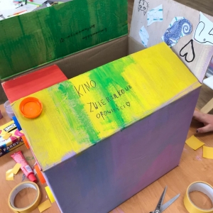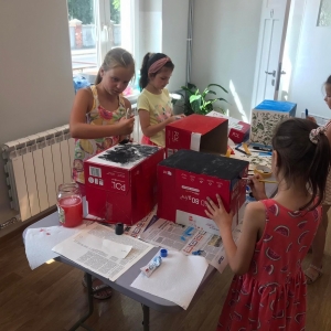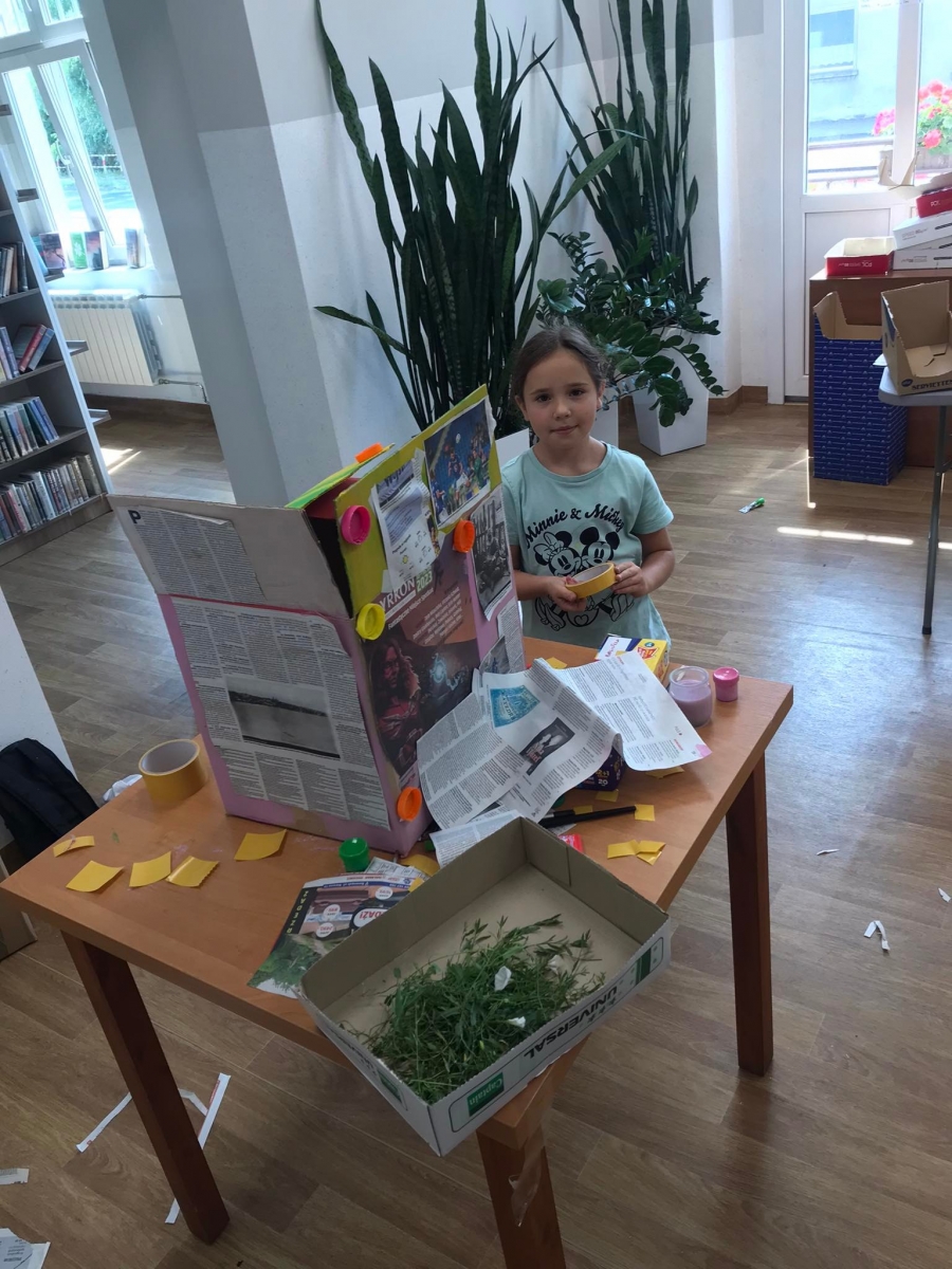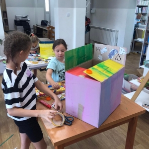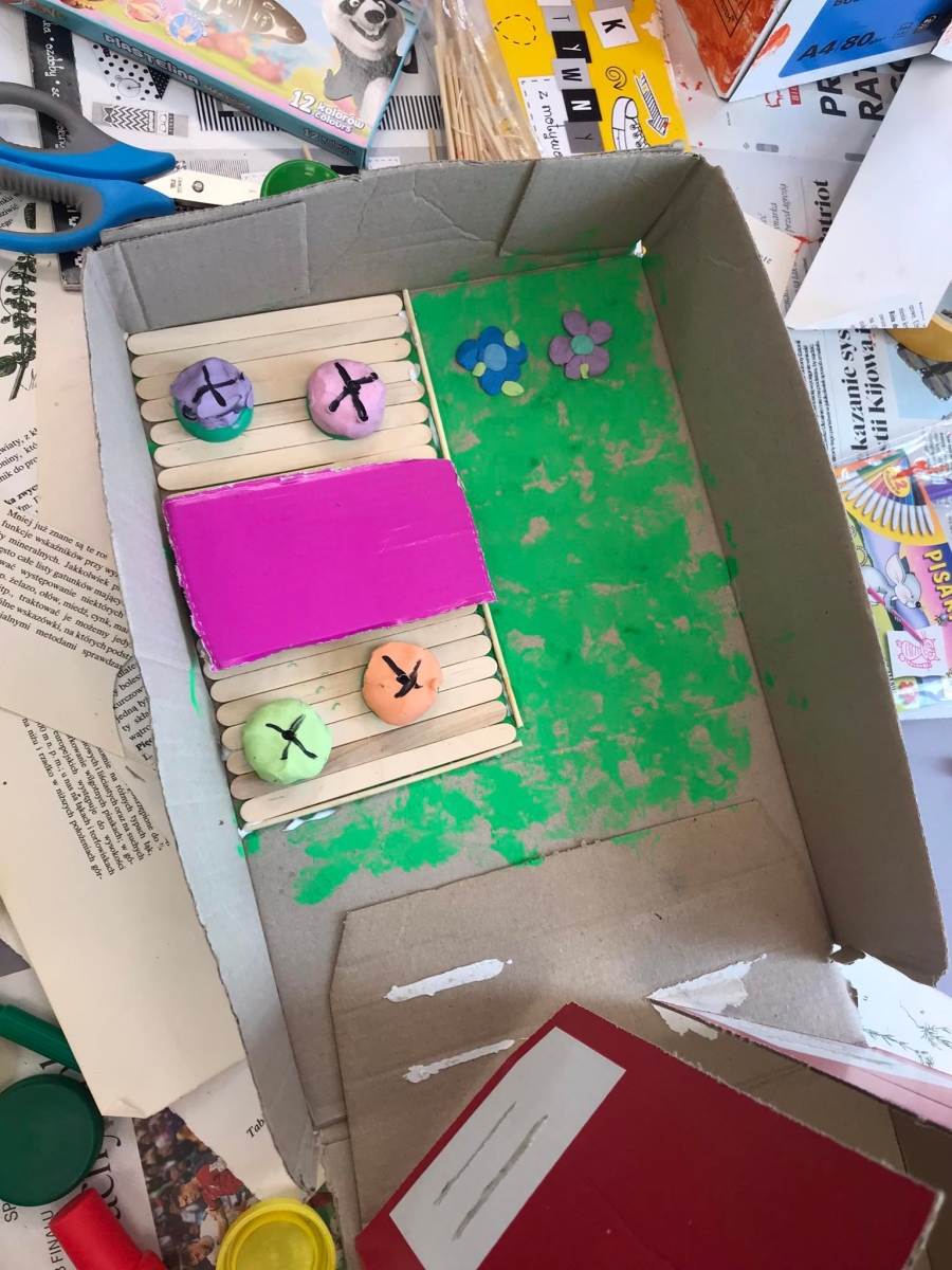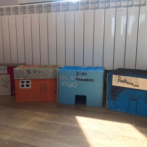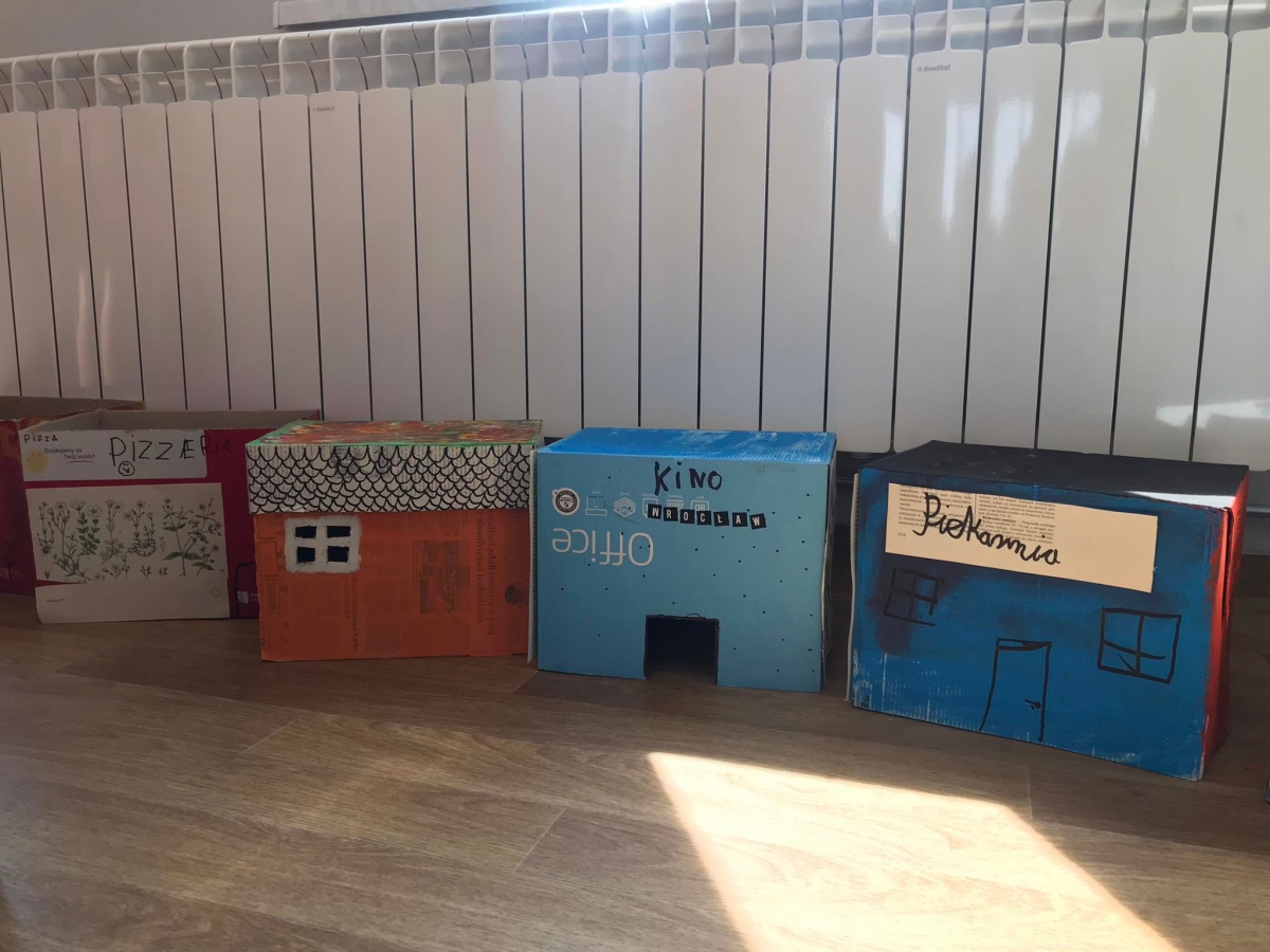 Spotkaliśmy się w kobylińskiej bibliotece. Dzieci, widząc kartony, słusznie domyśliły się, że będziemy tworzyć domy. A dokładniej… nasze unikatowe miasteczko! Wspólnie ułożyliśmy jego nazwę – „Bagiettę”. Wybraliśmy państwo, w którym ulokowaliśmy miasto – jest to Francja.