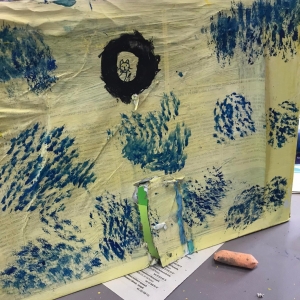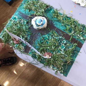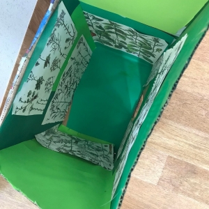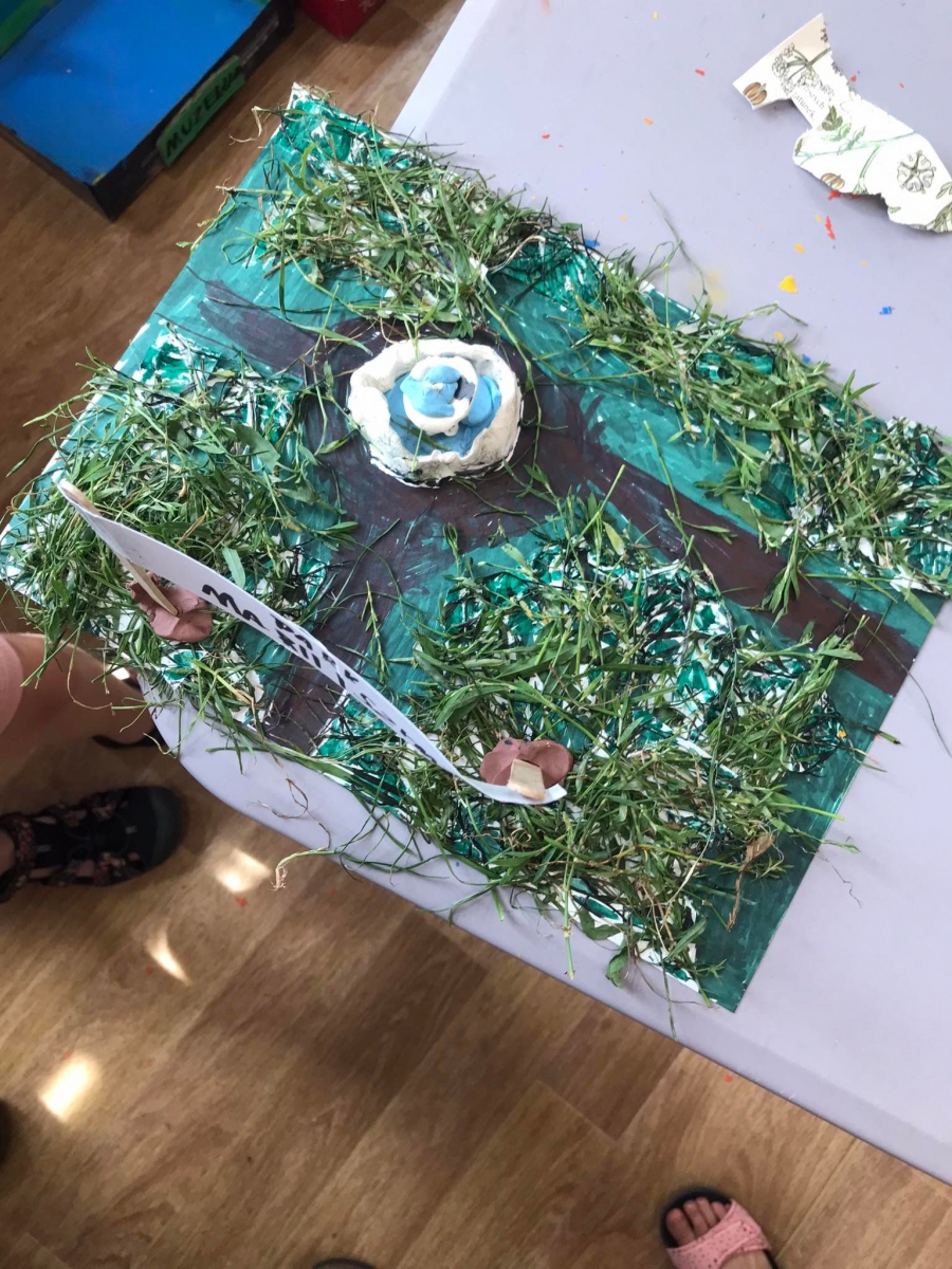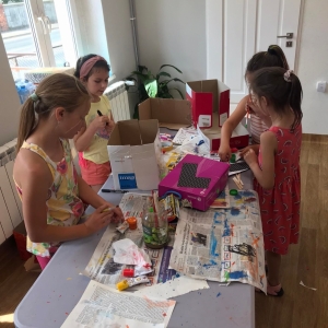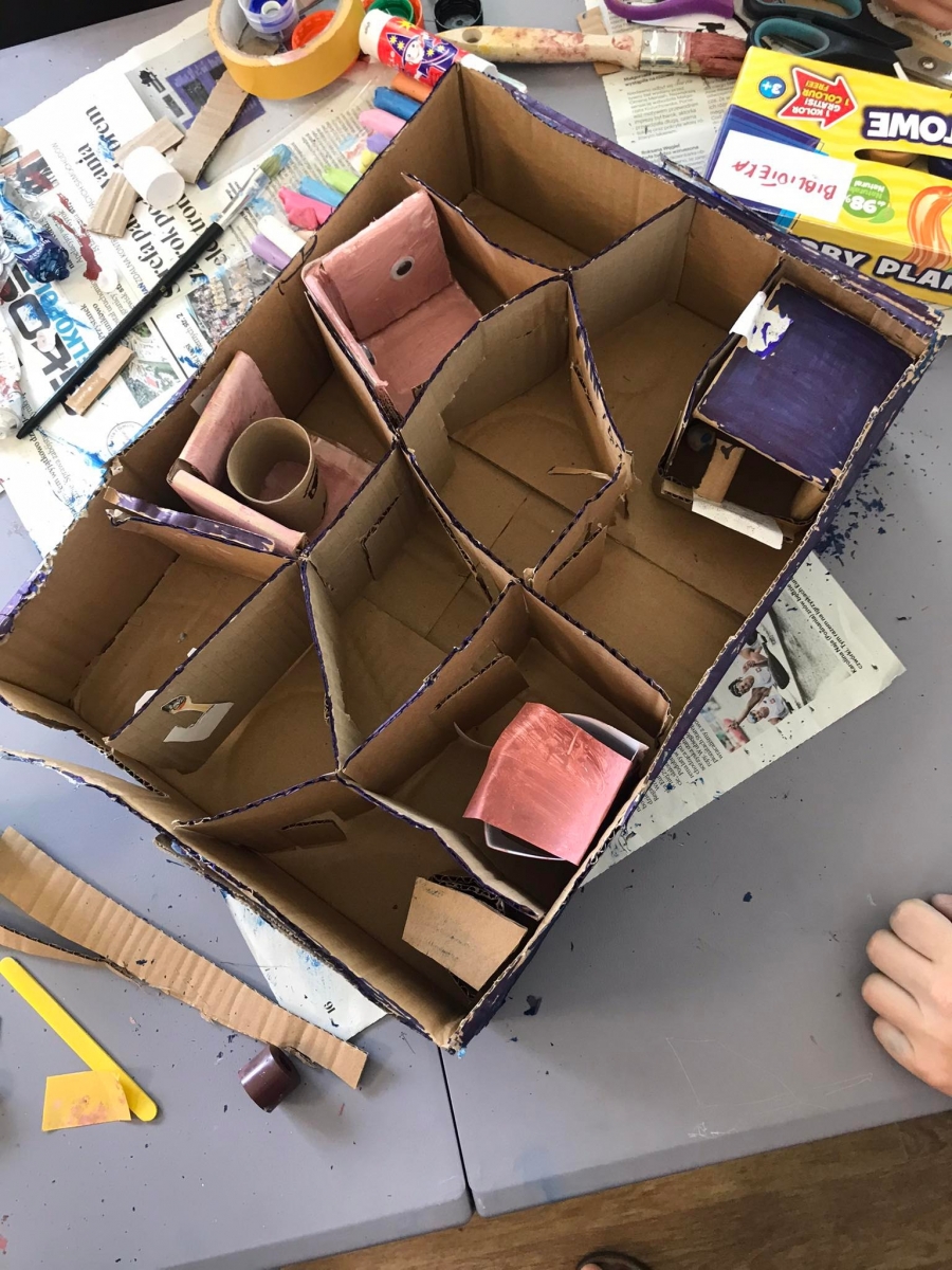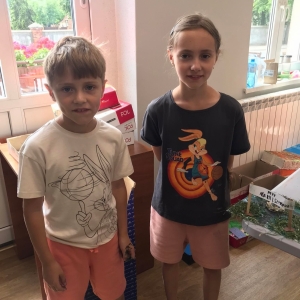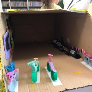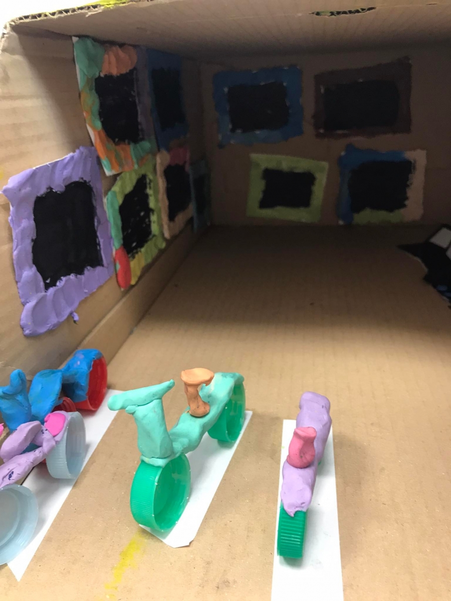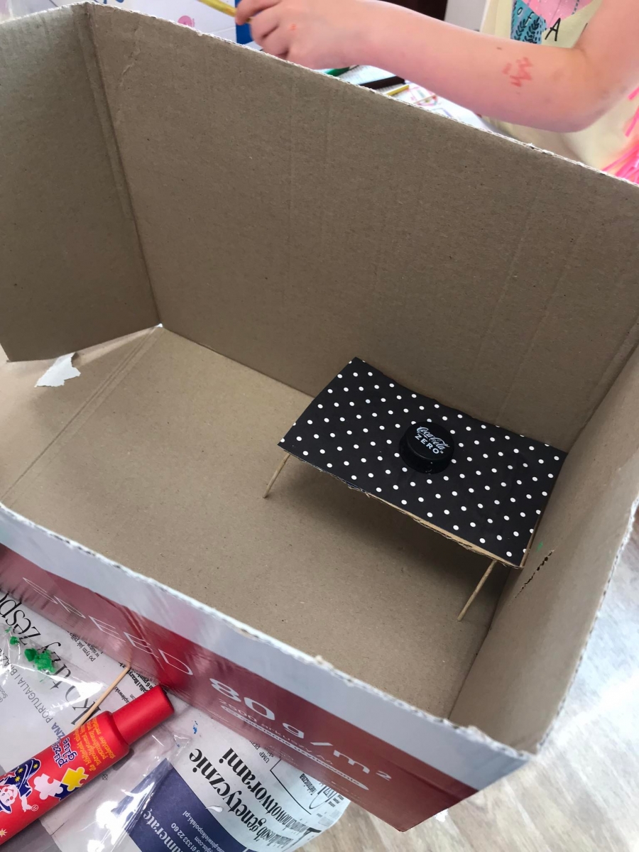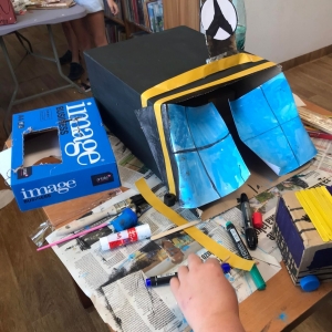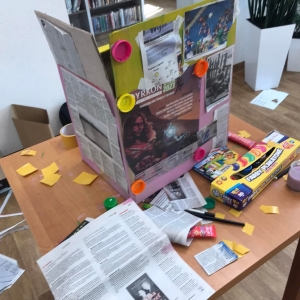 Spotkaliśmy się w kobylińskiej bibliotece. Dzieci, widząc kartony, słusznie domyśliły się, że będziemy tworzyć domy. A dokładniej… nasze unikatowe miasteczko! Wspólnie ułożyliśmy jego nazwę – „Bagiettę”. Wybraliśmy państwo, w którym ulokowaliśmy miasto – jest to Francja.