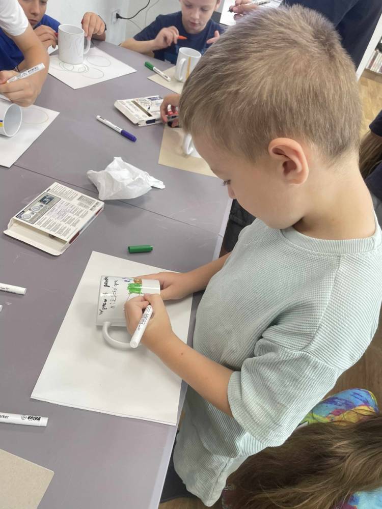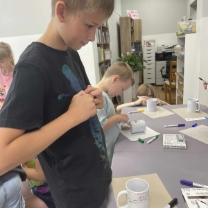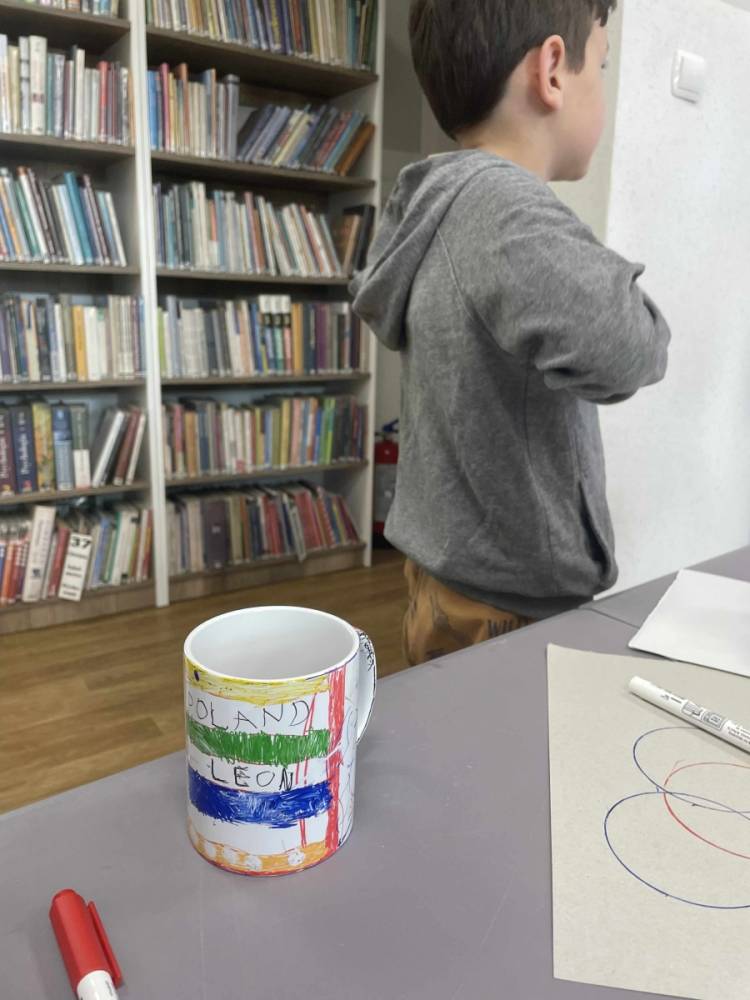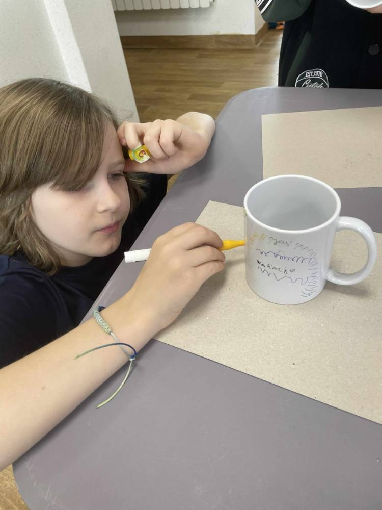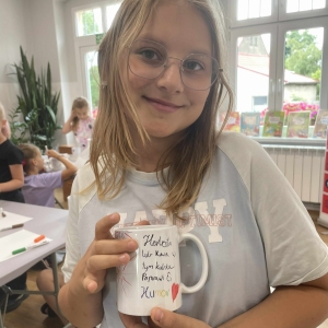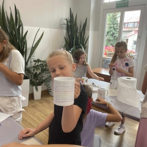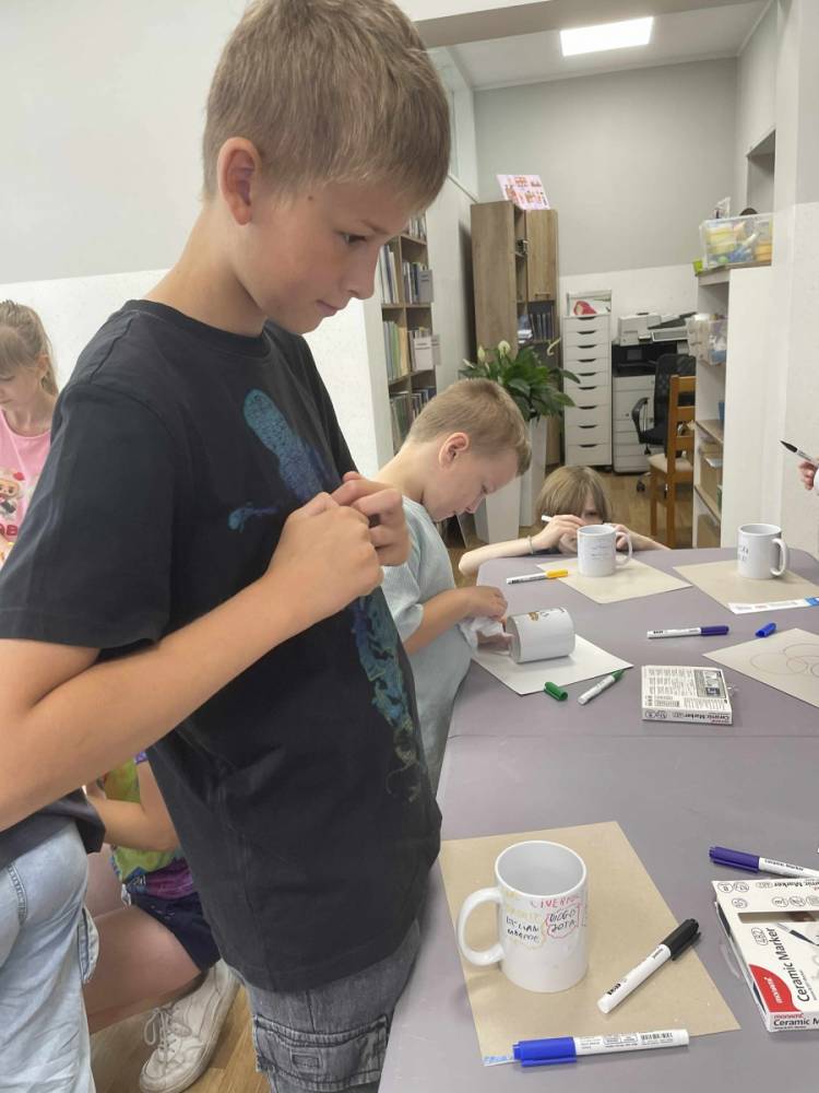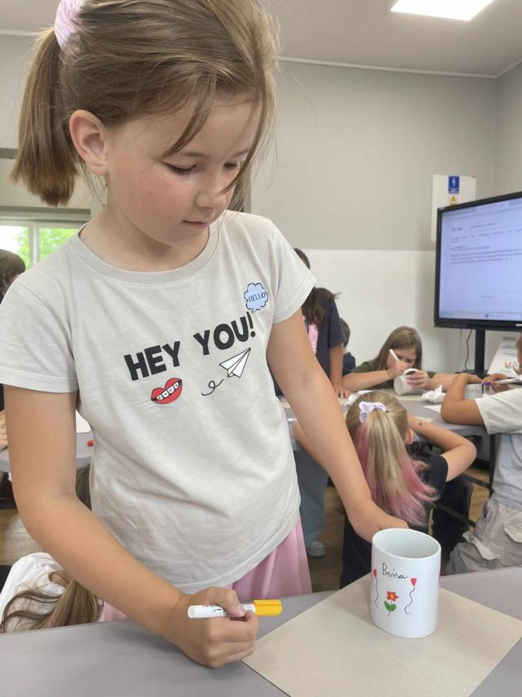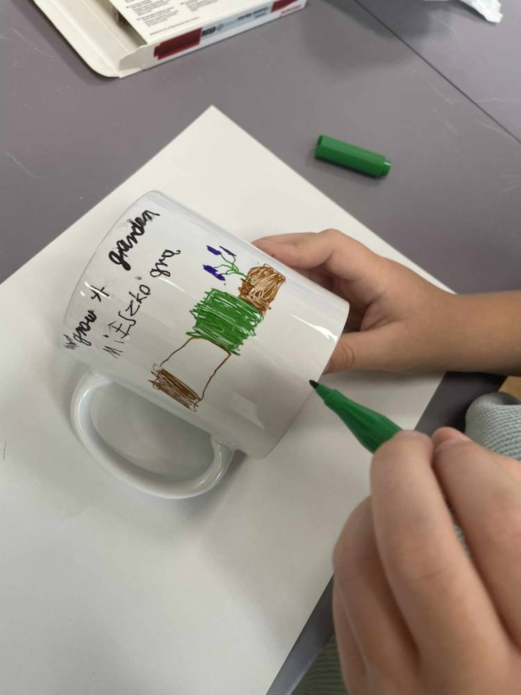 Na uczestników zajęć czekały zestawy plastyczne do tworzenia wyjątkowych kubków. Każdy otrzymał biały kubek ceramiczny i miał za zadanie spersonalizować go. Pomysły były przeróżne od małych rysunków po dedykacje dla rodziców i przyjaciół. Efekty prac można znaleźć w naszej galerii.