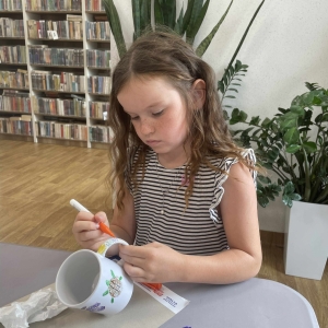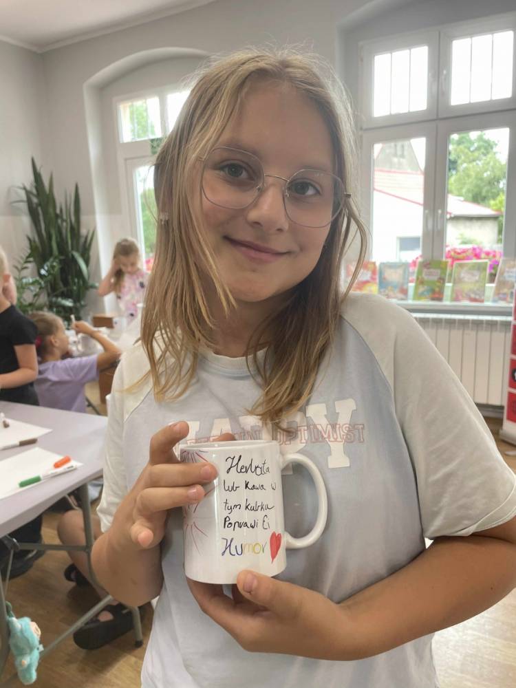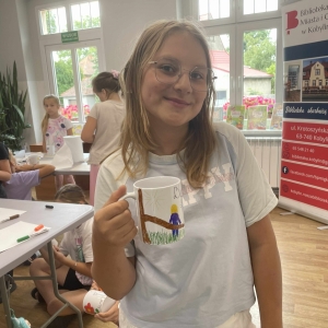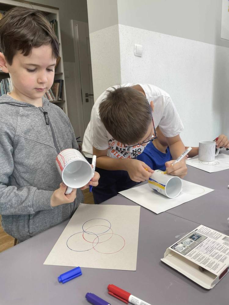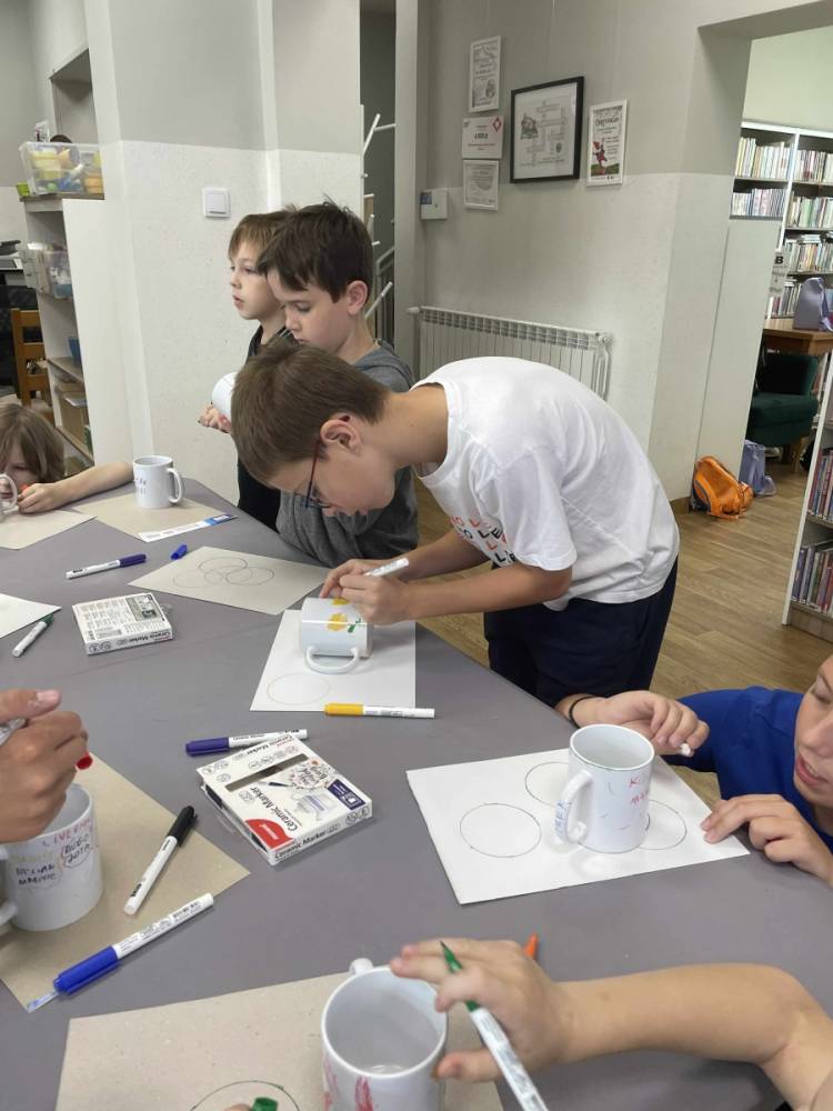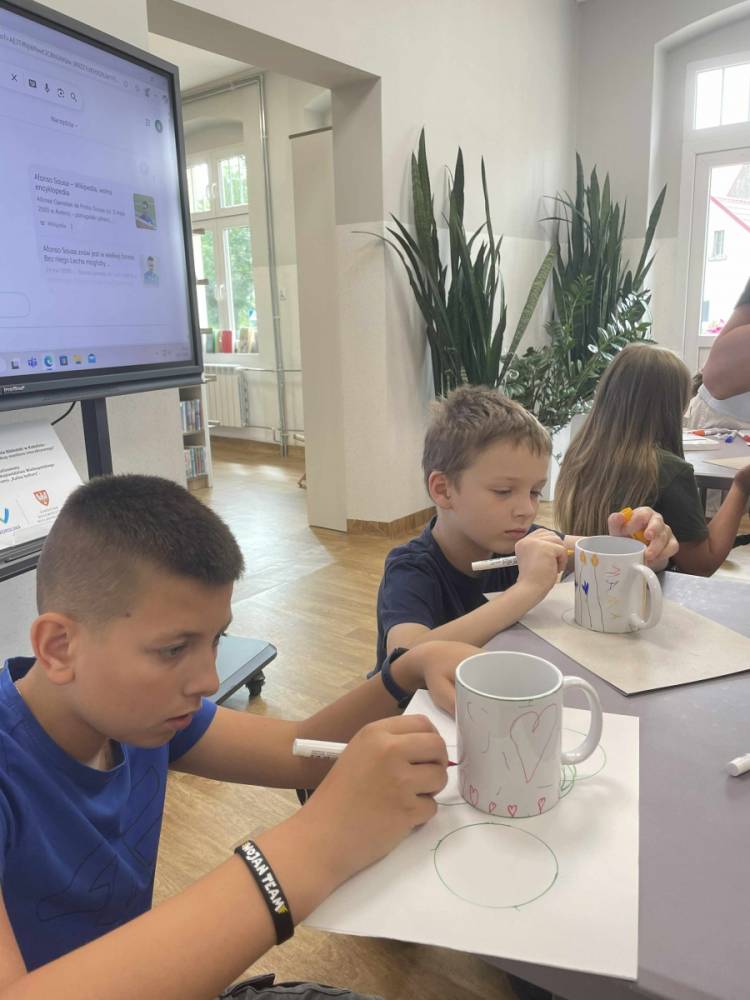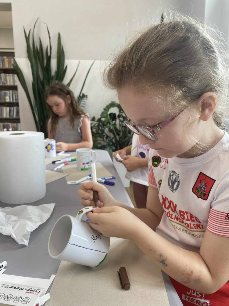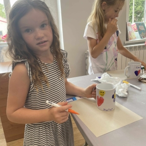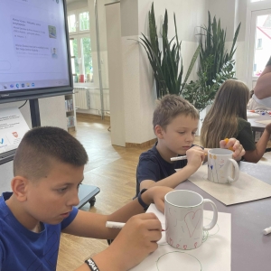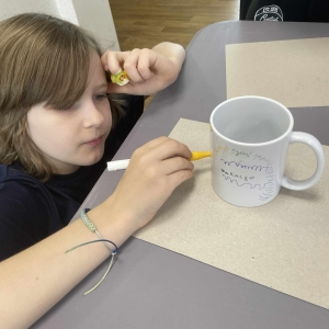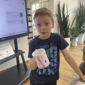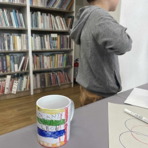 Na uczestników zajęć czekały zestawy plastyczne do tworzenia wyjątkowych kubków. Każdy otrzymał biały kubek ceramiczny i miał za zadanie spersonalizować go. Pomysły były przeróżne od małych rysunków po dedykacje dla rodziców i przyjaciół. Efekty prac można znaleźć w naszej galerii.