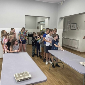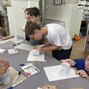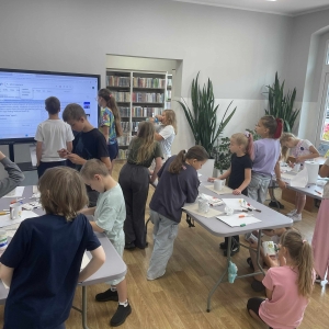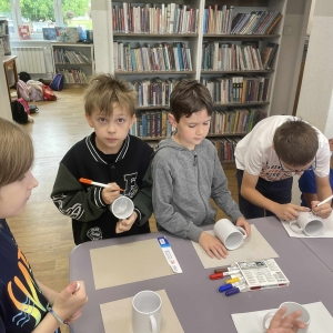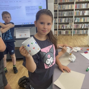 Galeria pod nazwą ,,Wakacje z Biblioteką w Kobylinie - dzień V" przedstawię grupę 20 dzieci. Dzieci podczas zajęć w Bibliotece malowały ceramiczne kubki, grały w gry zręcznościowe, tworzyły własne książki.
