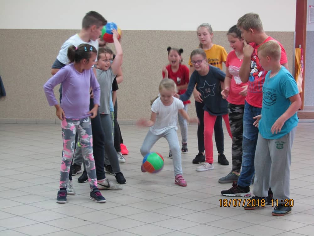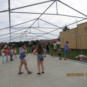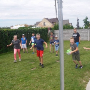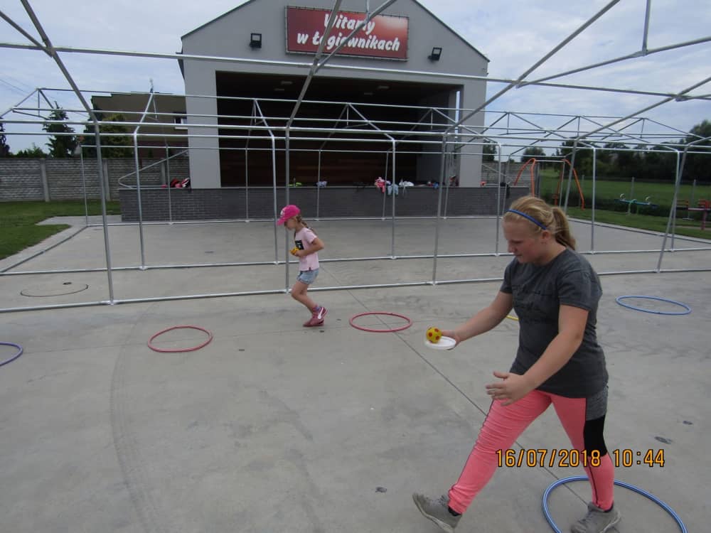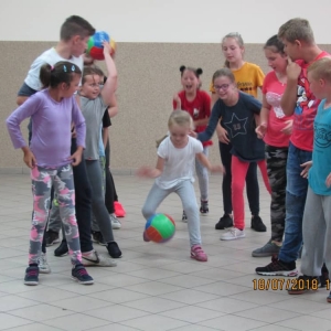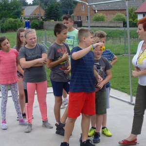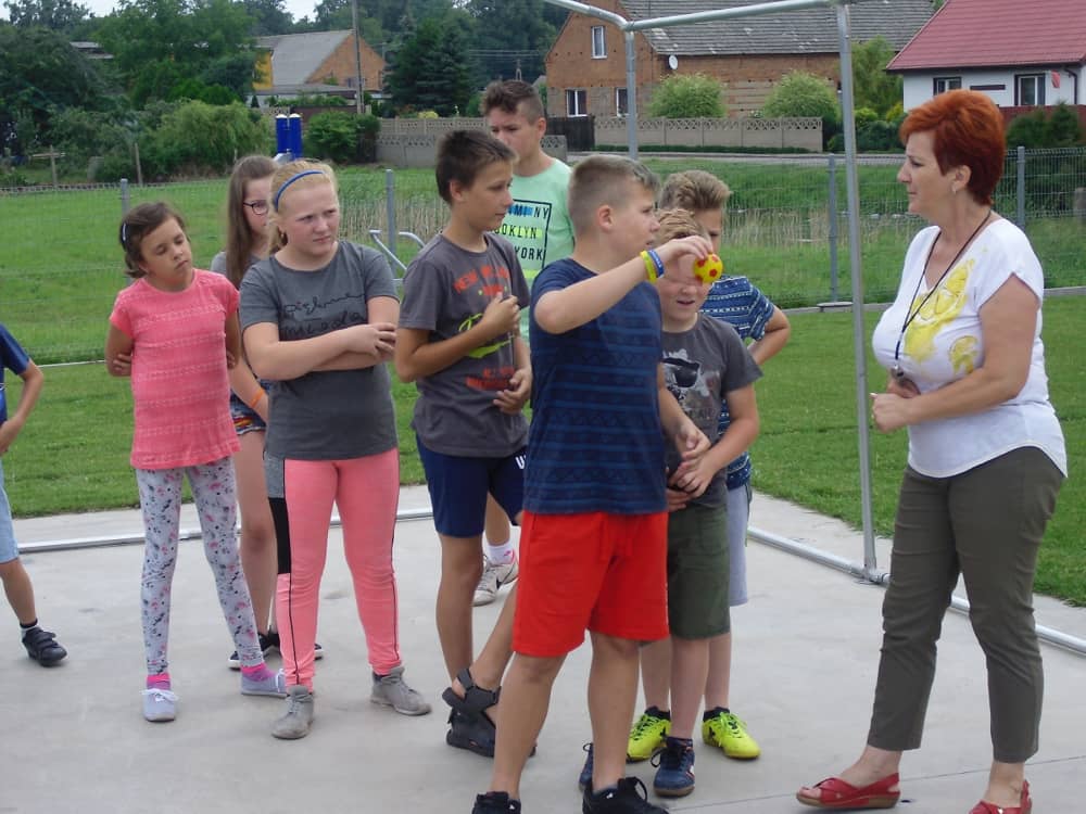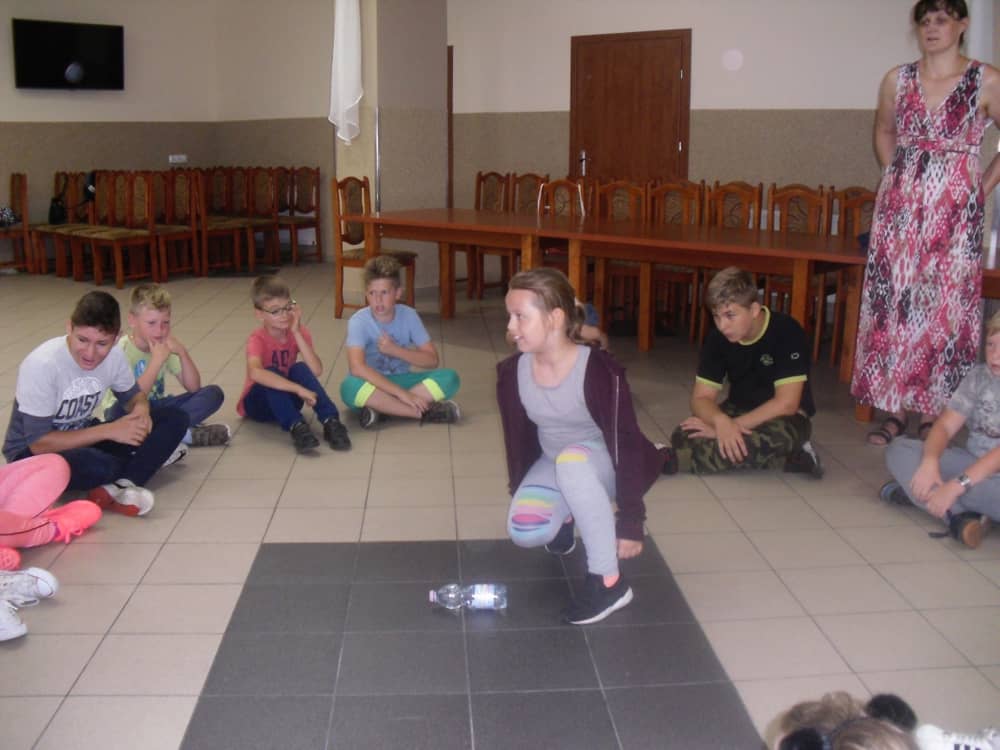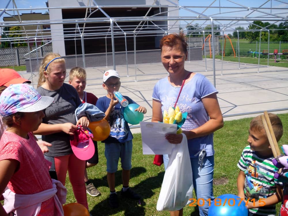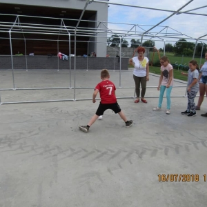 W pierwszym dniu zajęć gościem i jednocześnie prowadzącą była Pani Arleta Barteczka. Pomagała mama Jasia – uczestnika wakacji, Pani Katarzyna Chlebowska. Dzieci próbowały swoich sił m. in. : w zabawie bieg po buty. Kolejną zabawą była gra w kolanko. Dużym zainteresowaniem cieszyła się gra w dwa ognie, jak również zabawy w których należało rywalizować z drużyną przeciwną.