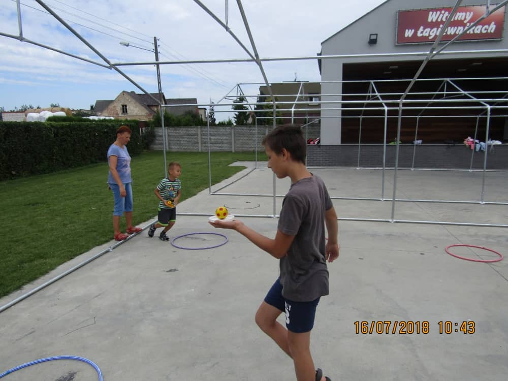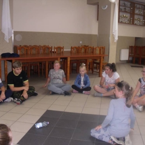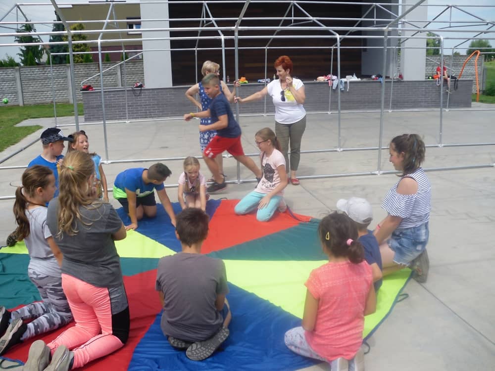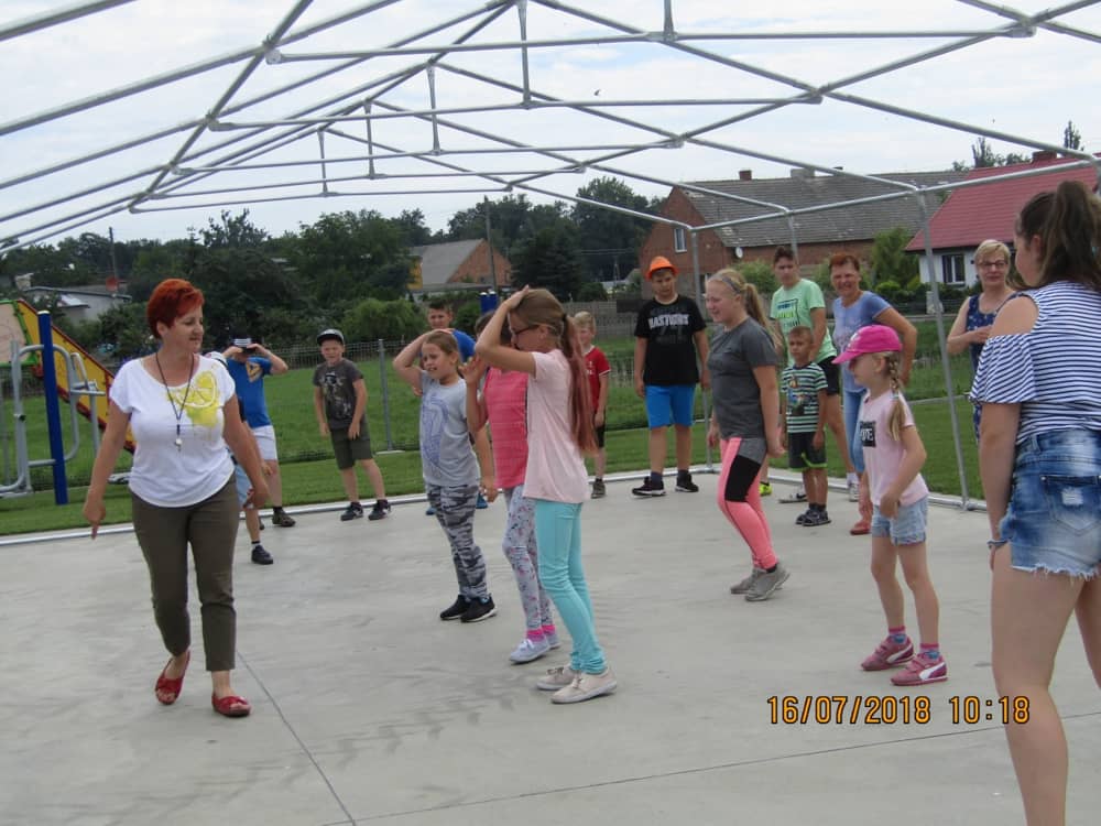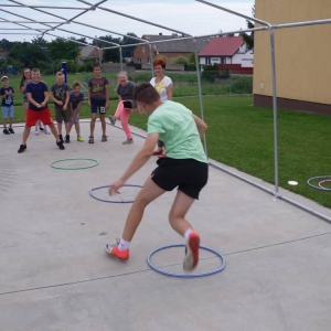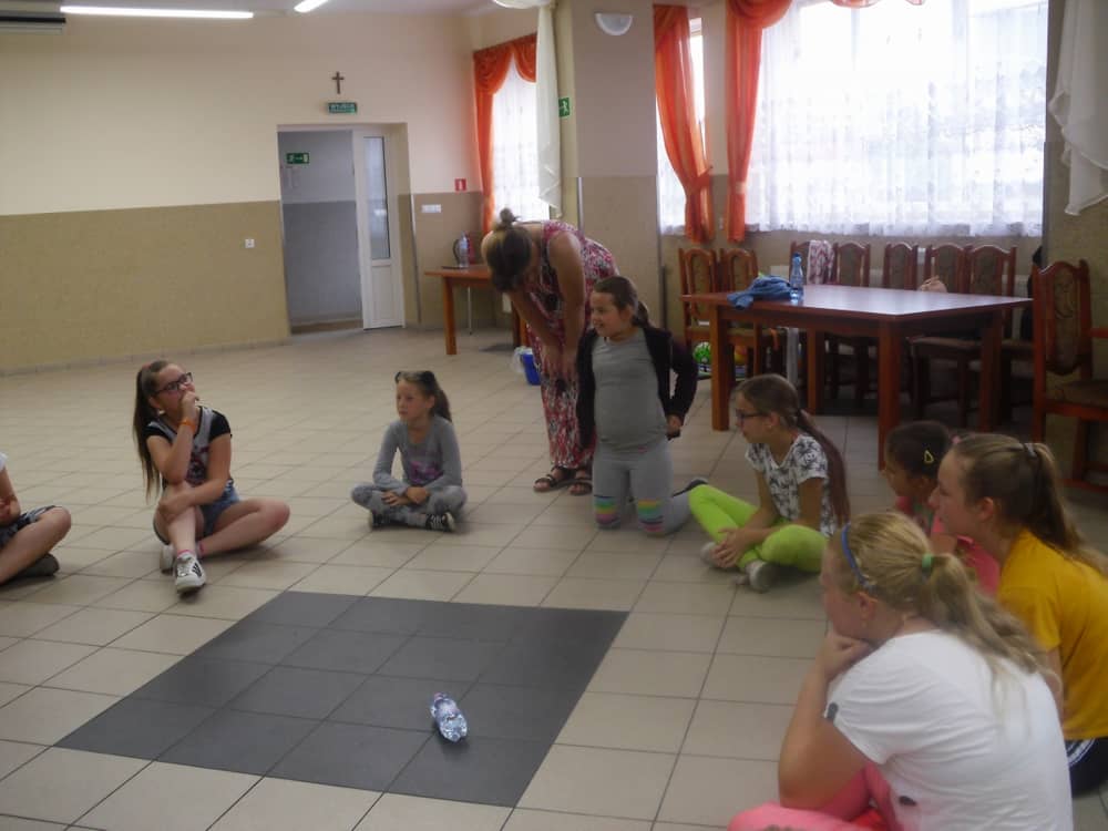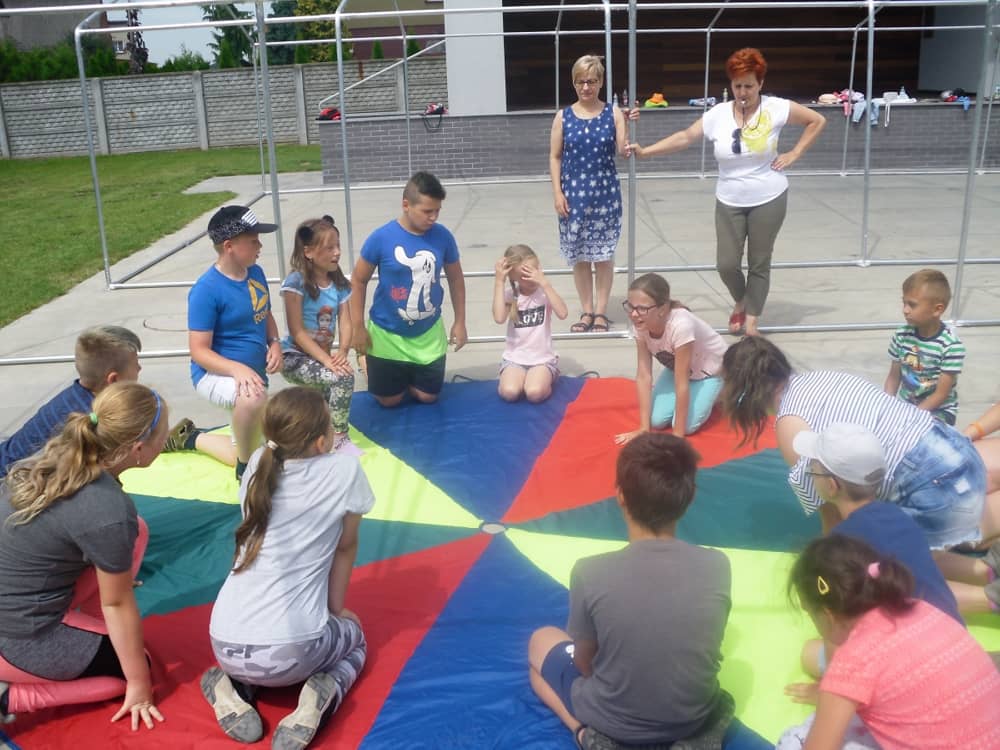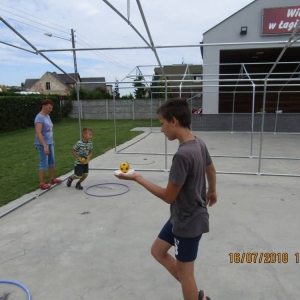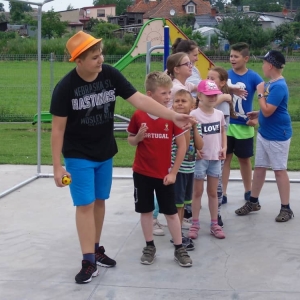 W pierwszym dniu zajęć gościem i jednocześnie prowadzącą była Pani Arleta Barteczka. Pomagała mama Jasia – uczestnika wakacji, Pani Katarzyna Chlebowska. Dzieci próbowały swoich sił m. in. : w zabawie bieg po buty. Kolejną zabawą była gra w kolanko. Dużym zainteresowaniem cieszyła się gra w dwa ognie, jak również zabawy w których należało rywalizować z drużyną przeciwną.