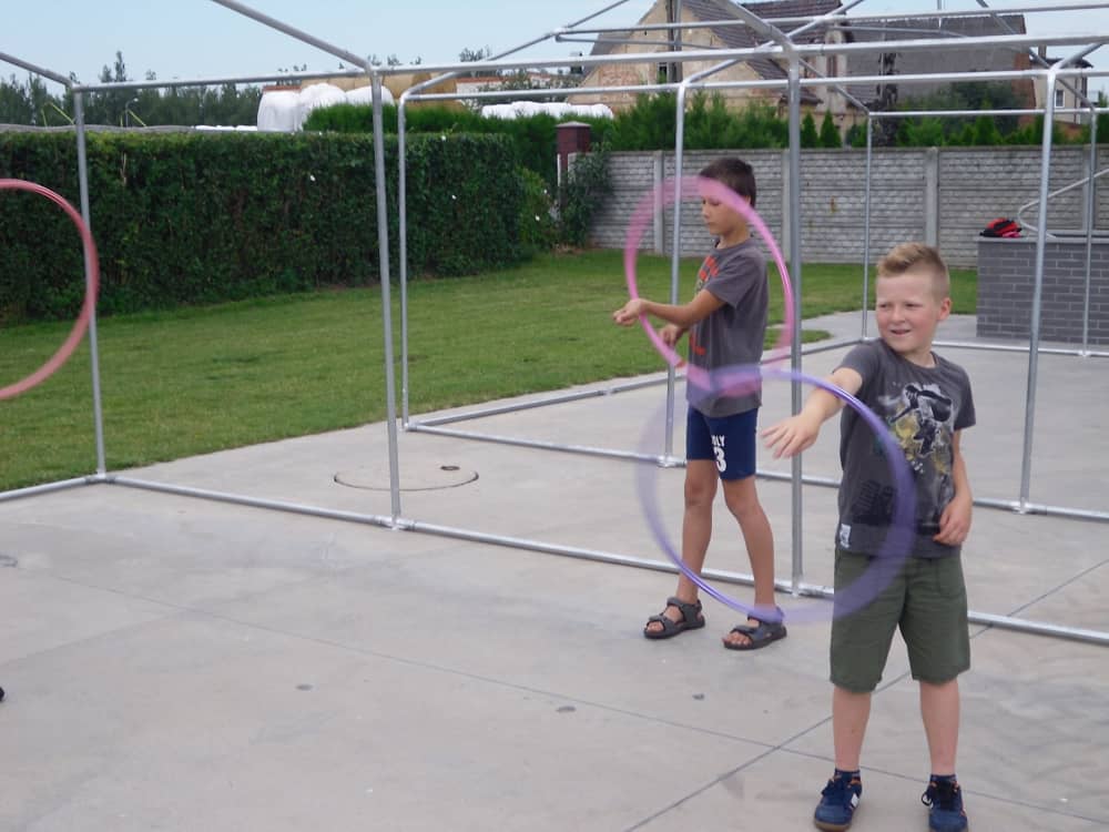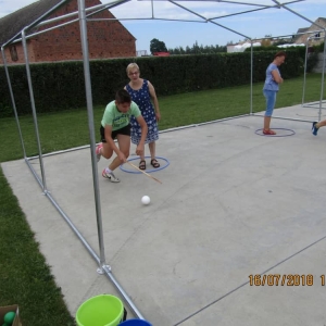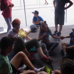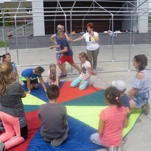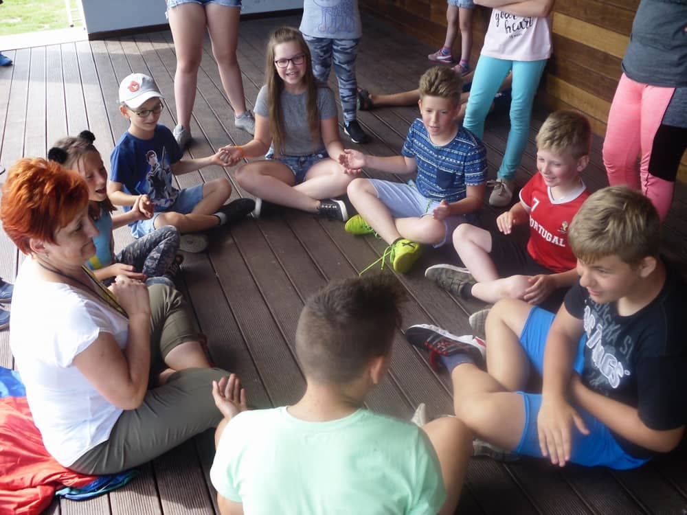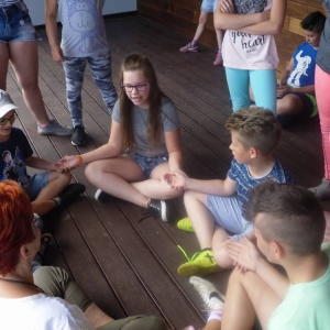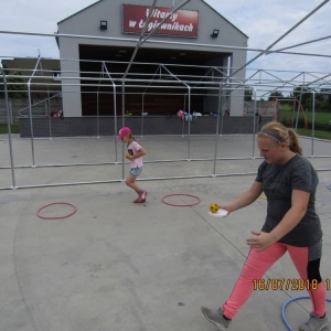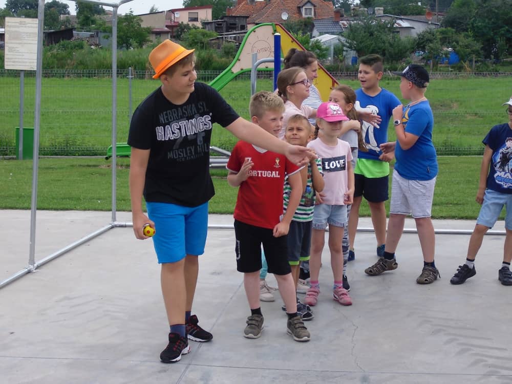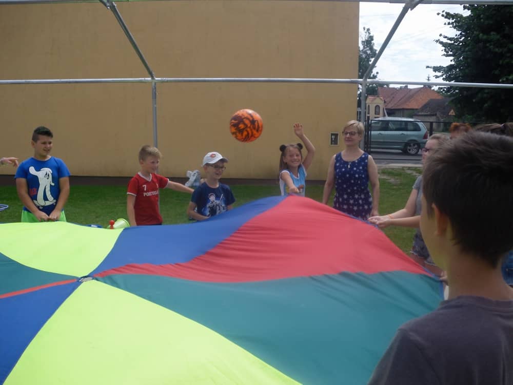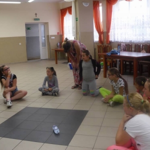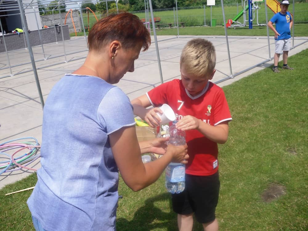 W pierwszym dniu zajęć gościem i jednocześnie prowadzącą była Pani Arleta Barteczka. Pomagała mama Jasia – uczestnika wakacji, Pani Katarzyna Chlebowska. Dzieci próbowały swoich sił m. in. : w zabawie bieg po buty. Kolejną zabawą była gra w kolanko. Dużym zainteresowaniem cieszyła się gra w dwa ognie, jak również zabawy w których należało rywalizować z drużyną przeciwną.