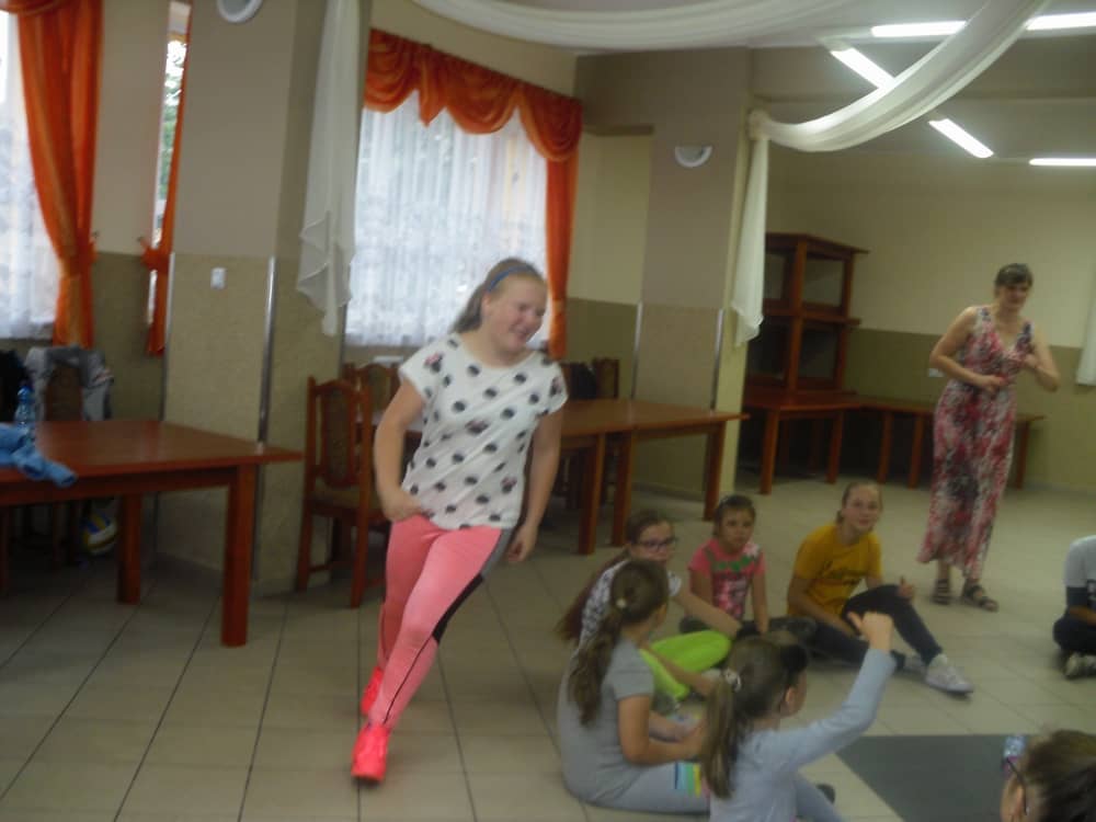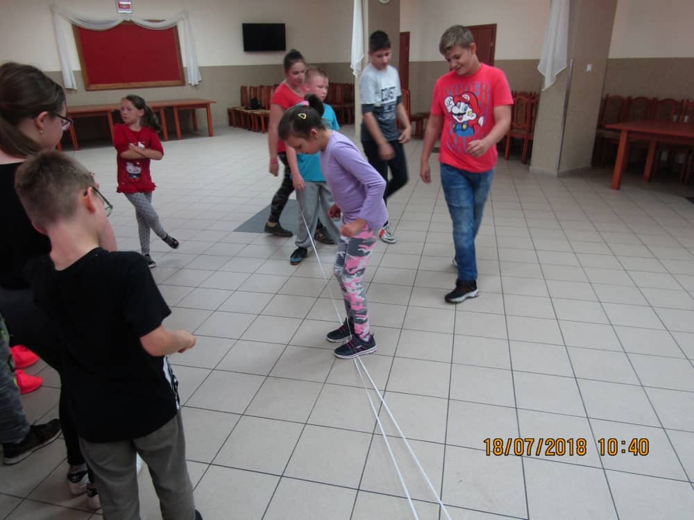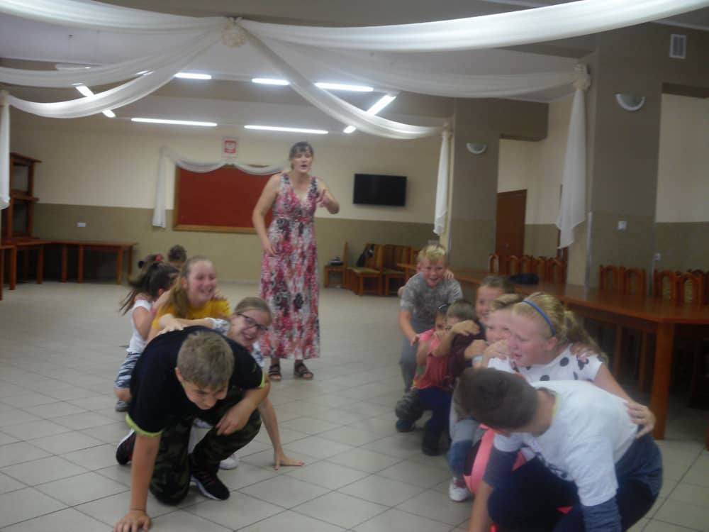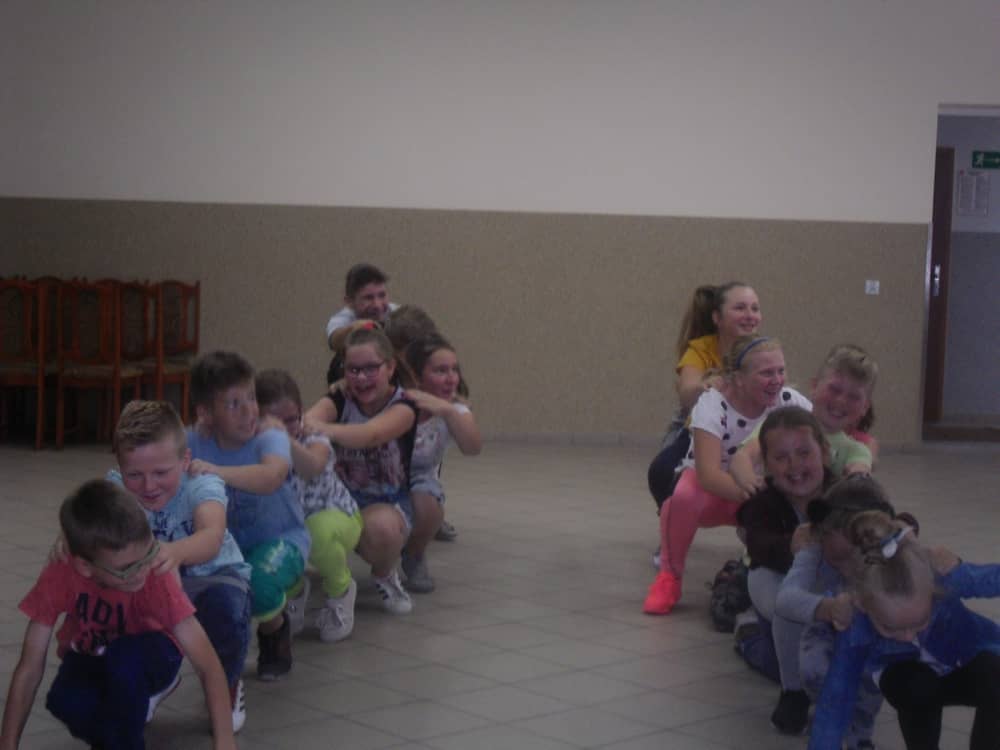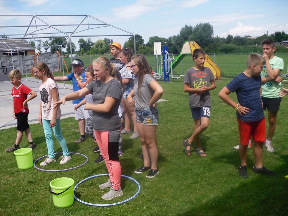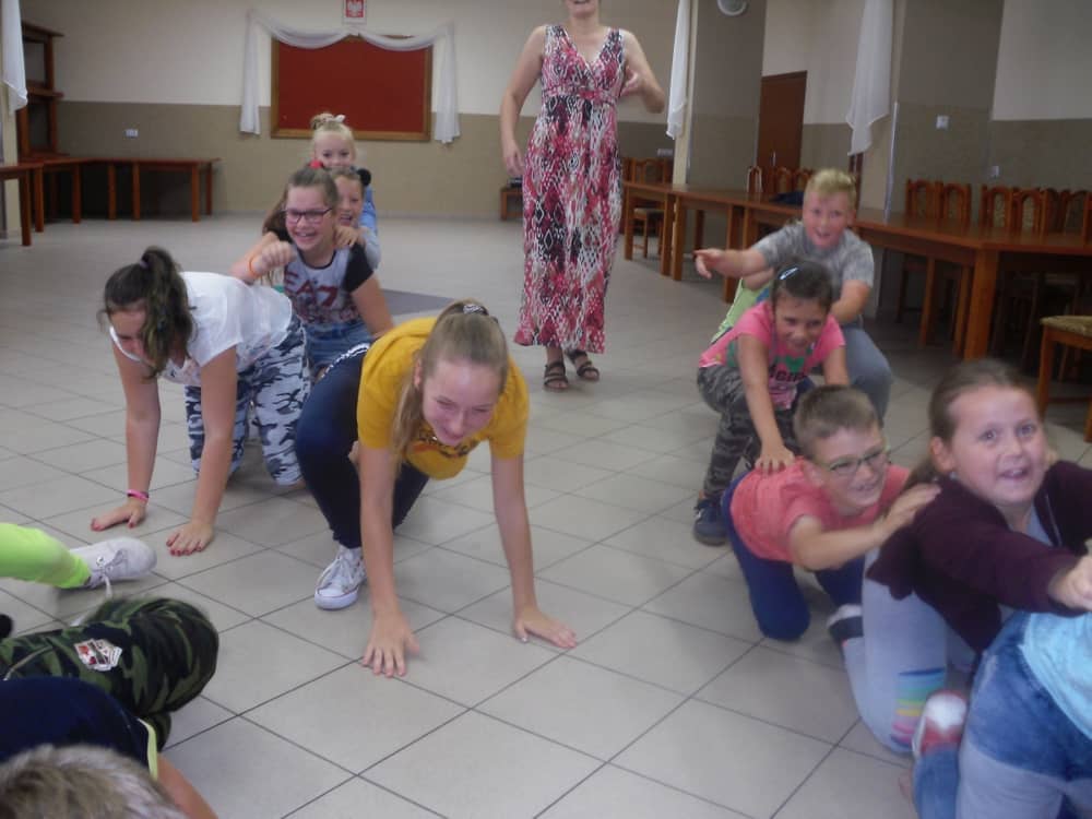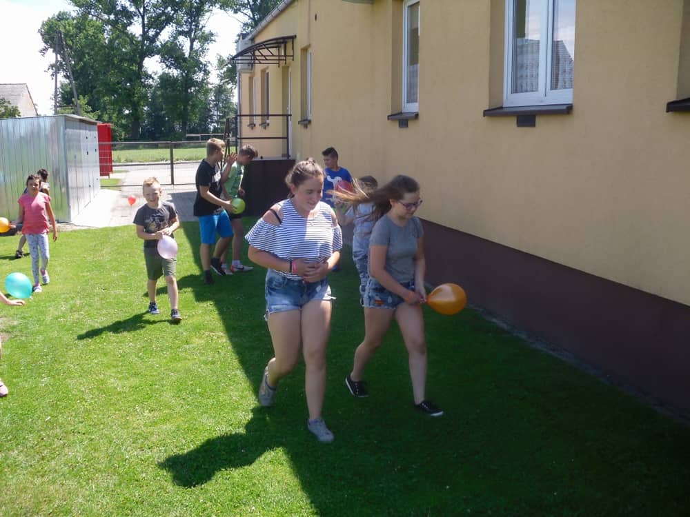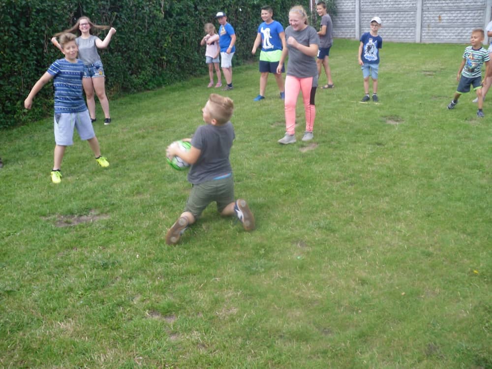 W kolejnych dwóch dniach pogoda sprawiła nam psikusa, dlatego zajęcia odbywały się na sali wiejskiej w Łagiewnikach. Tu również dzieci brały udział w grach i zabawach sprawnościowych, a gościnnie pomagała w prowadzeniu zabaw Pani Justyna Küffner. Bardzo atrakcyjną okazała się zabawa wiewiórki w dziupli. W ciuciubabce z zawiązanymi oczami należało złapać jakąś osobę i odgadnąć kto to jest. Podczas zabawy w pytanie czy wyzwanie większość uczestników wybierała pytanie. Dużą trudność, chociaż na wesoło, sprawiło przejście do mety jako stonoga.